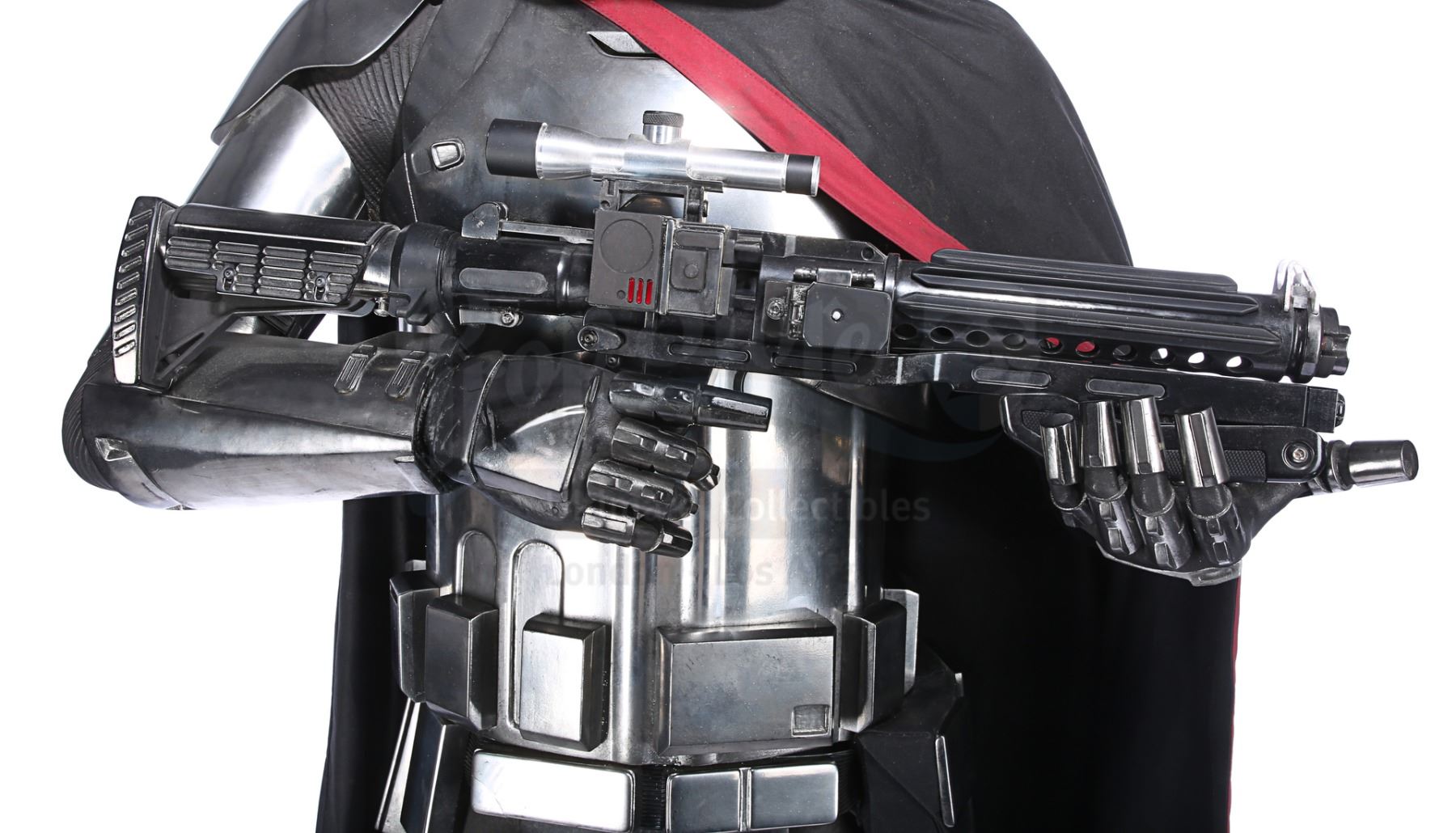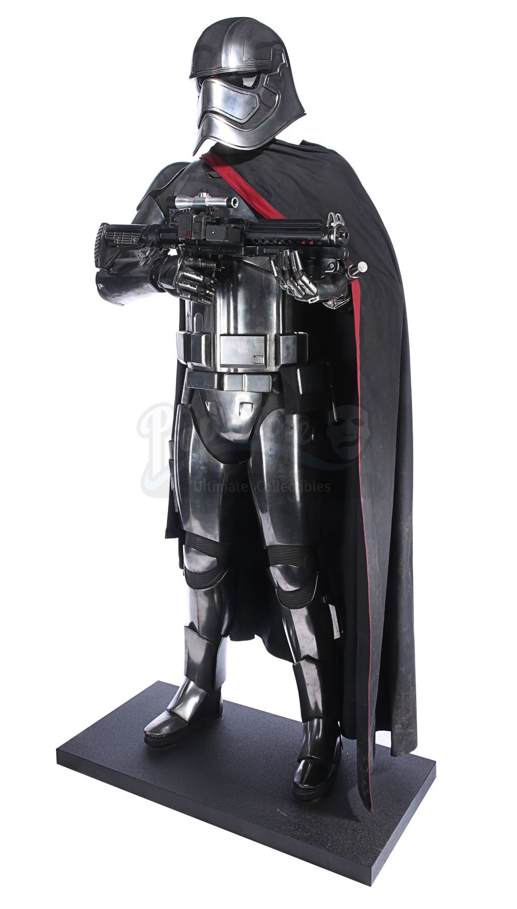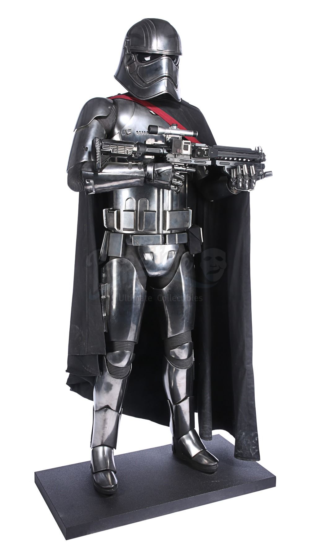 Mounted on a rectangular base, the display shows the First Order captain holding a resin F-11D blaster rifle which features a faux scope. Phasma is dressed in her distinctive silver-coloured chrome armour, which is made of fibreglass, with a black ribbed undersuit. Draped over her left shoulder is a thick black fabric cape decorated with a red trim. Several of the armour components exhibit light scuffing, there is a crack present on the front of the belt, and the cape displays minor wear. Dimensions (display): 55 cm x 100.5 cm x 205 cm (21 3/4" x 39 1/2" x 80 3/4")