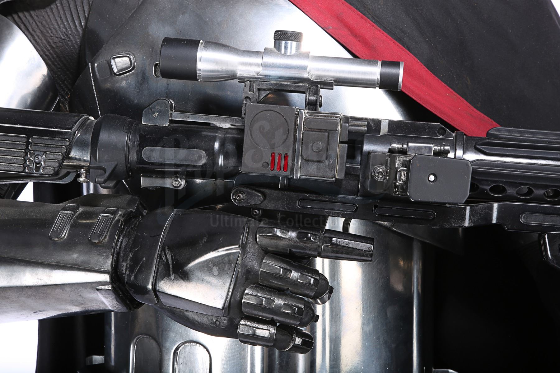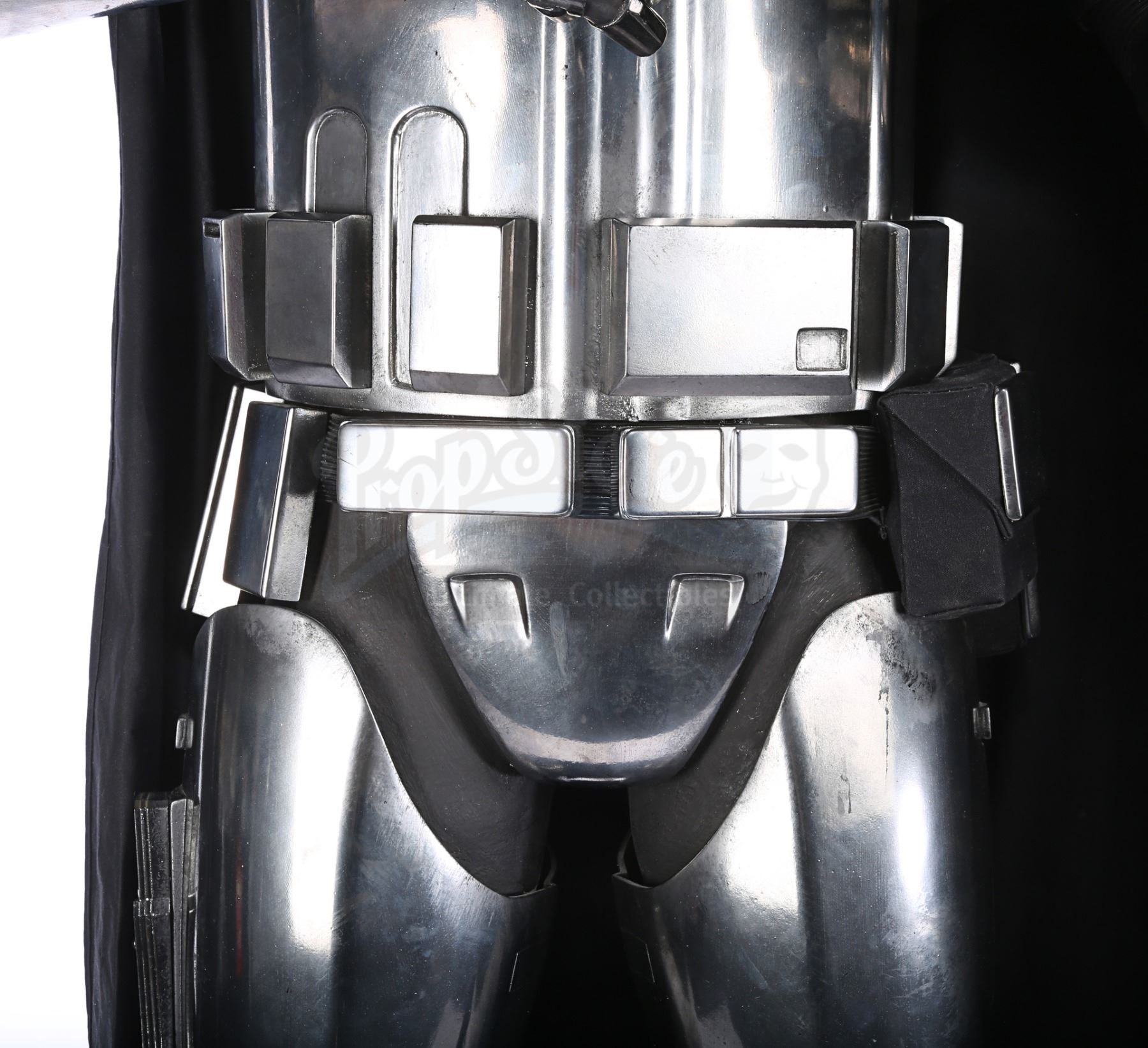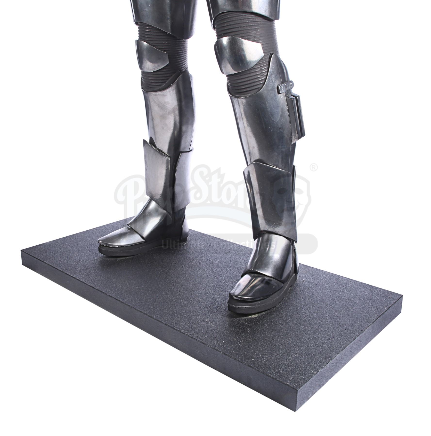 Mounted on a rectangular base, the display shows the First Order captain holding a resin F-11D blaster rifle which features a faux scope. Phasma is dressed in her distinctive silver-coloured chrome armour, which is made of fibreglass, with a black ribbed undersuit. Draped over her left shoulder is a thick black fabric cape decorated with a red trim. Several of the armour components exhibit light scuffing, there is a crack present on the front of the belt, and the cape displays minor wear. Dimensions (display): 55 cm x 100.5 cm x 205 cm (21 3/4" x 39 1/2" x 80 3/4")