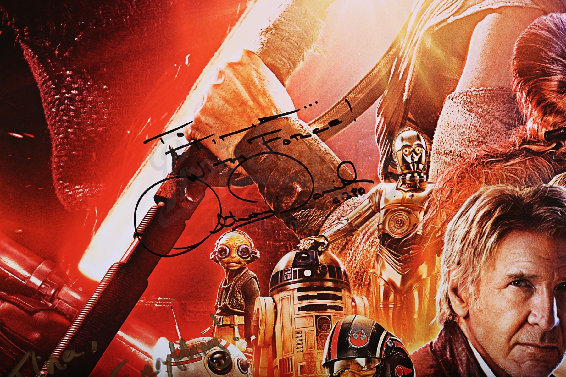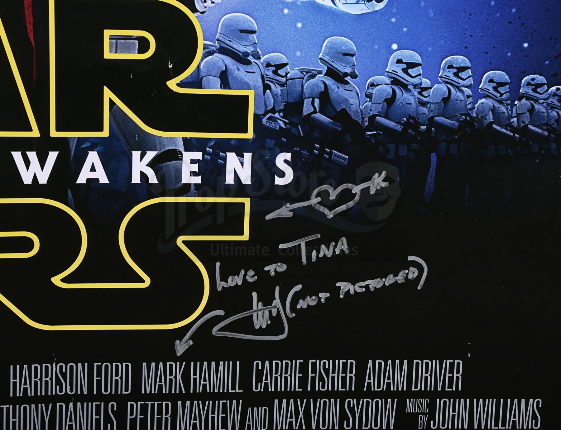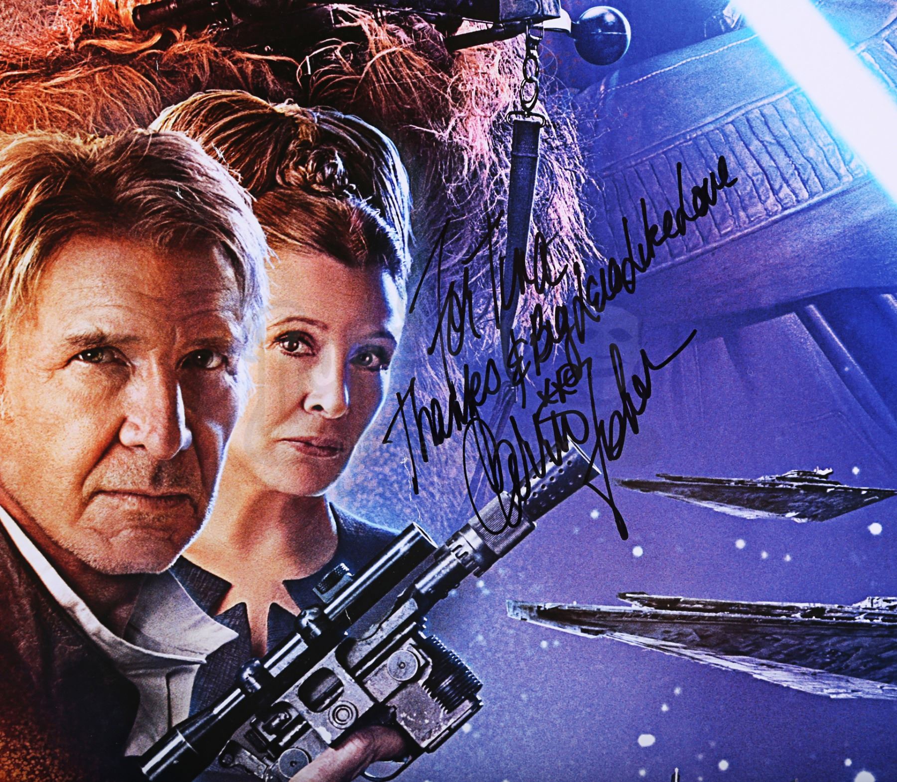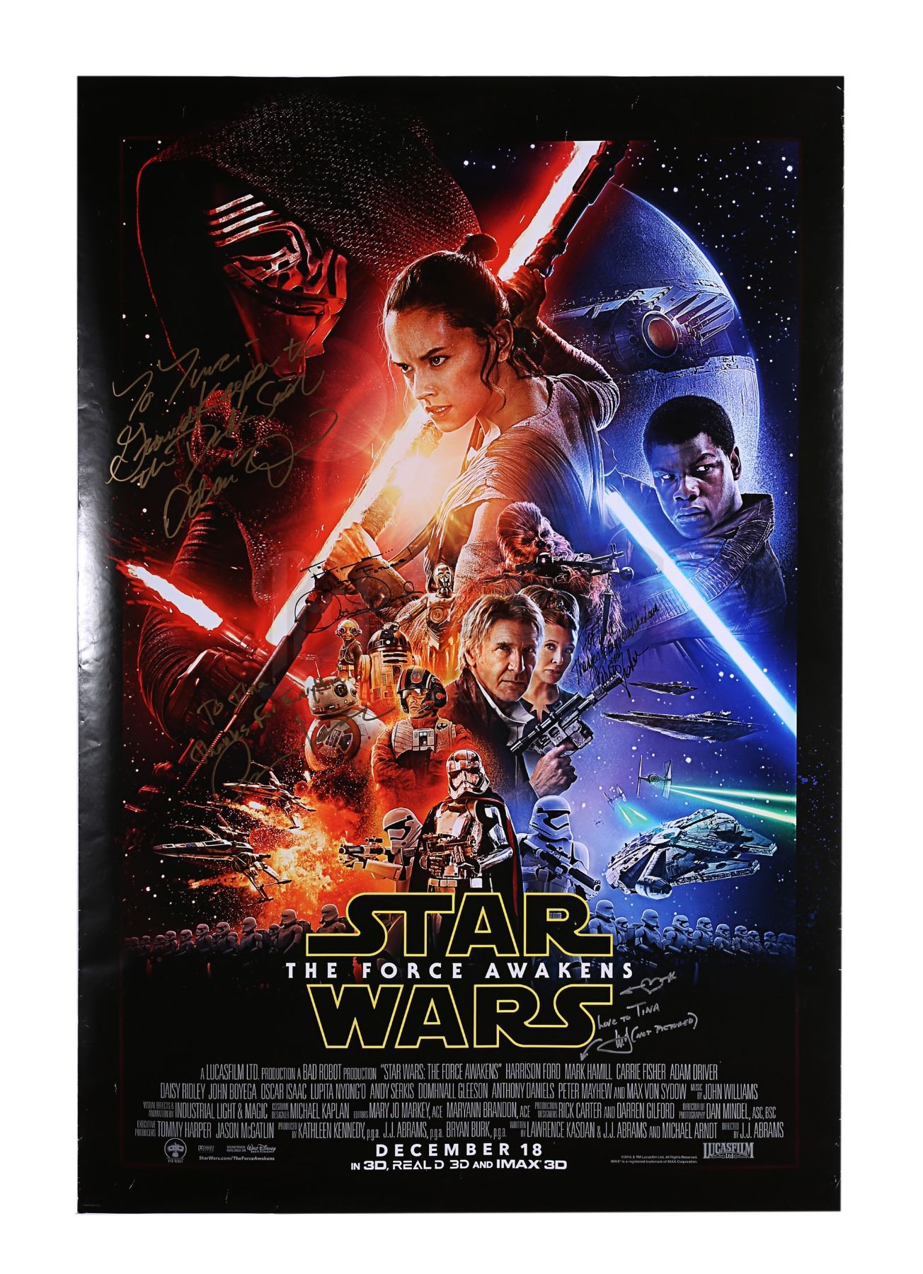 A cast autographed poster from the promotion of J.J. Abrams' Star Wars: The Force Awakens. The poster is autographed by cast members Carrie Fisher, Mark Hamill, Adam Driver, Oscar Isaac and Anthony Daniels. The autographs, inscribed in black, silver and gold ink, are made out to "Tina" and several feature a brief message. The poster has some wear from use and storage, including minor creasing and wear around the edges. Dimensions: 101 cm x 68 cm (39 3/4" x 26 3/4")