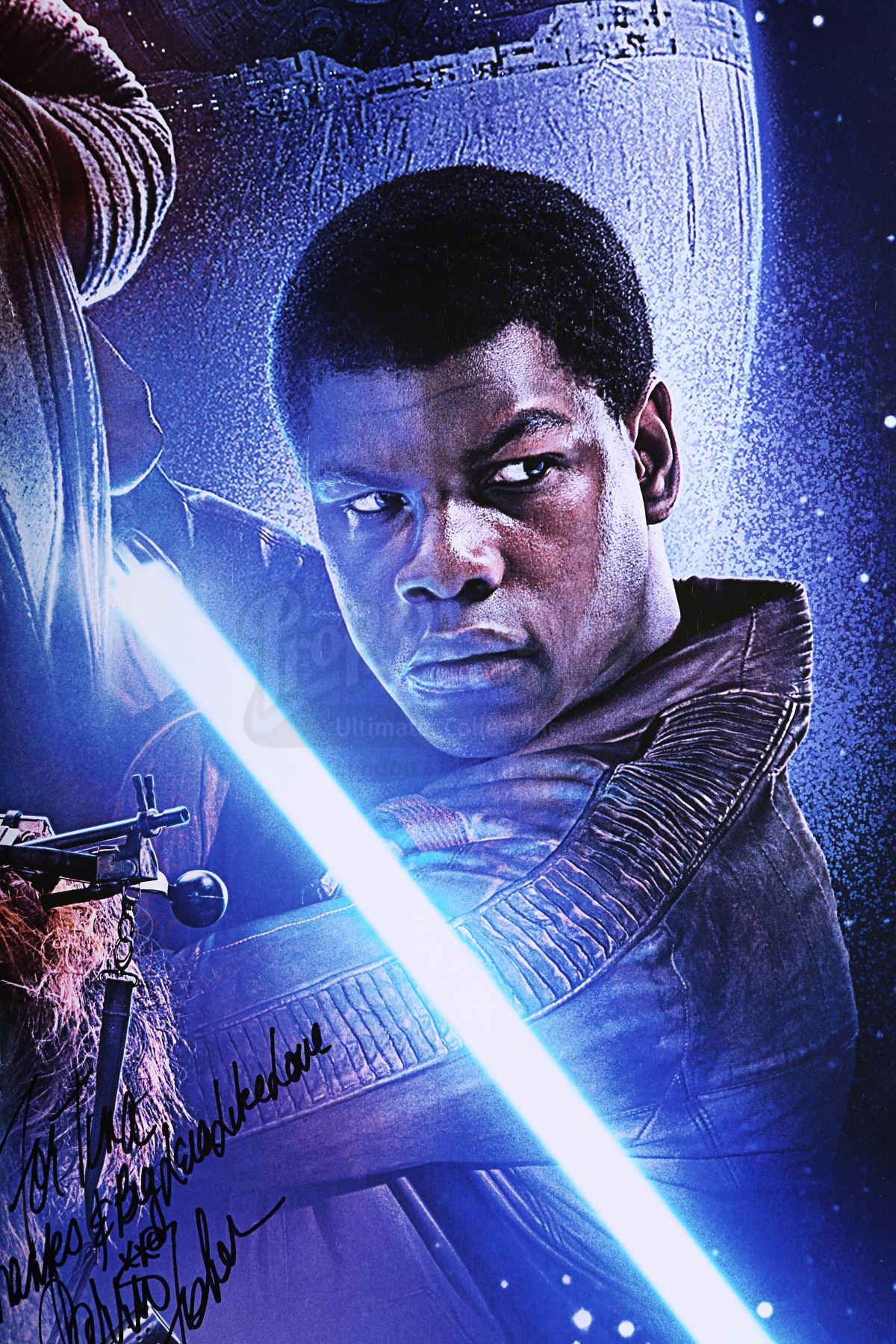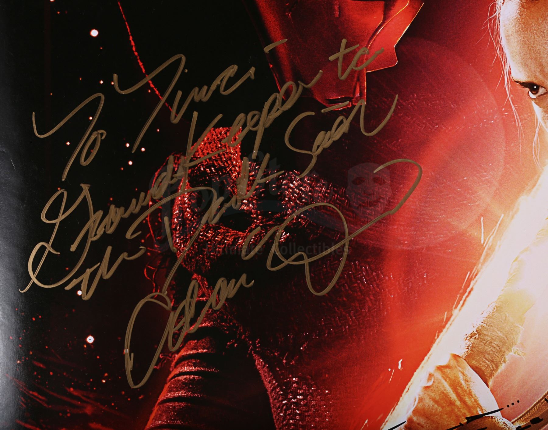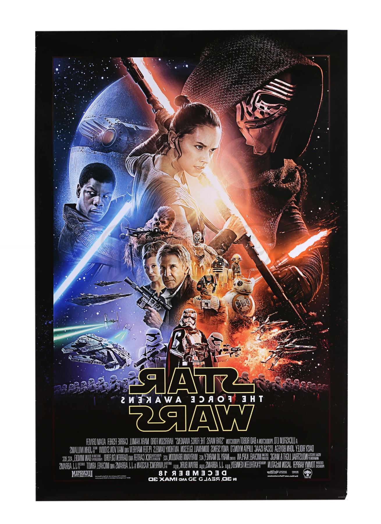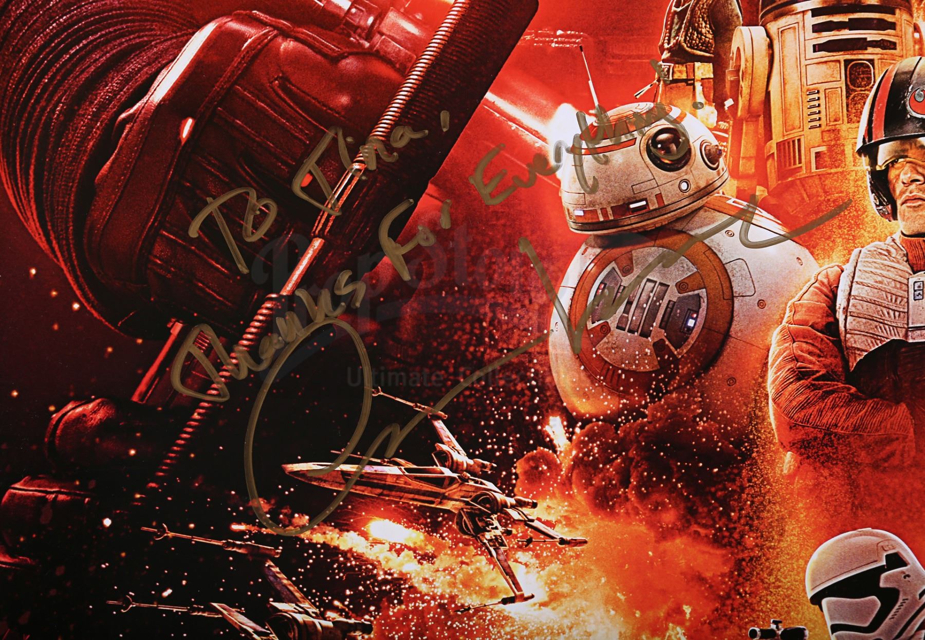 A cast autographed poster from the promotion of J.J. Abrams' Star Wars: The Force Awakens. The poster is autographed by cast members Carrie Fisher, Mark Hamill, Adam Driver, Oscar Isaac and Anthony Daniels. The autographs, inscribed in black, silver and gold ink, are made out to "Tina" and several feature a brief message. The poster has some wear from use and storage, including minor creasing and wear around the edges. Dimensions: 101 cm x 68 cm (39 3/4" x 26 3/4")
