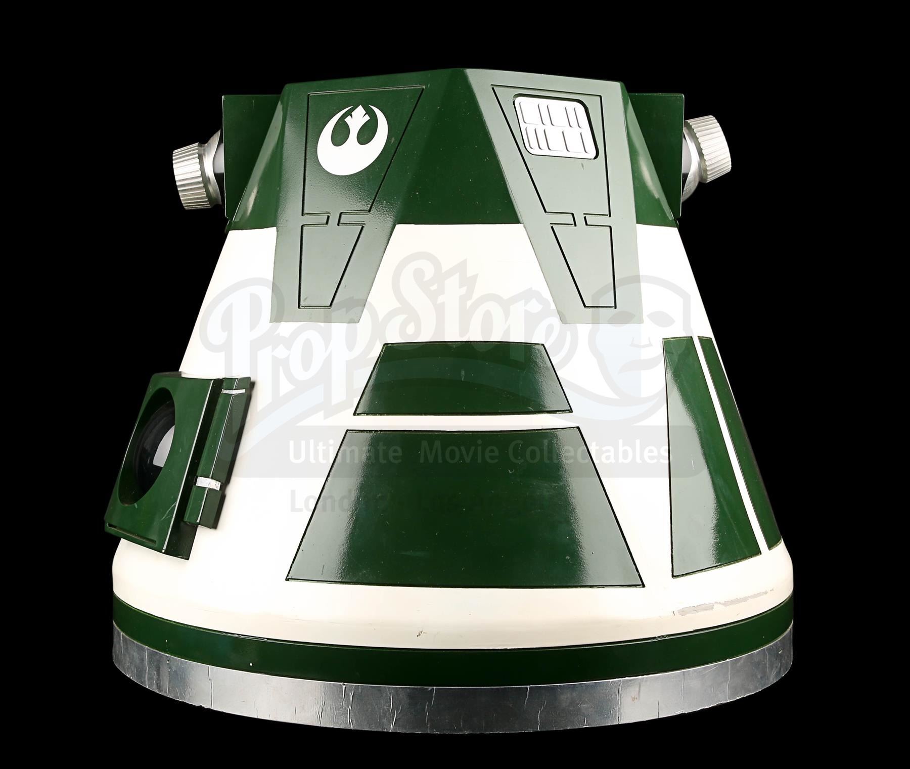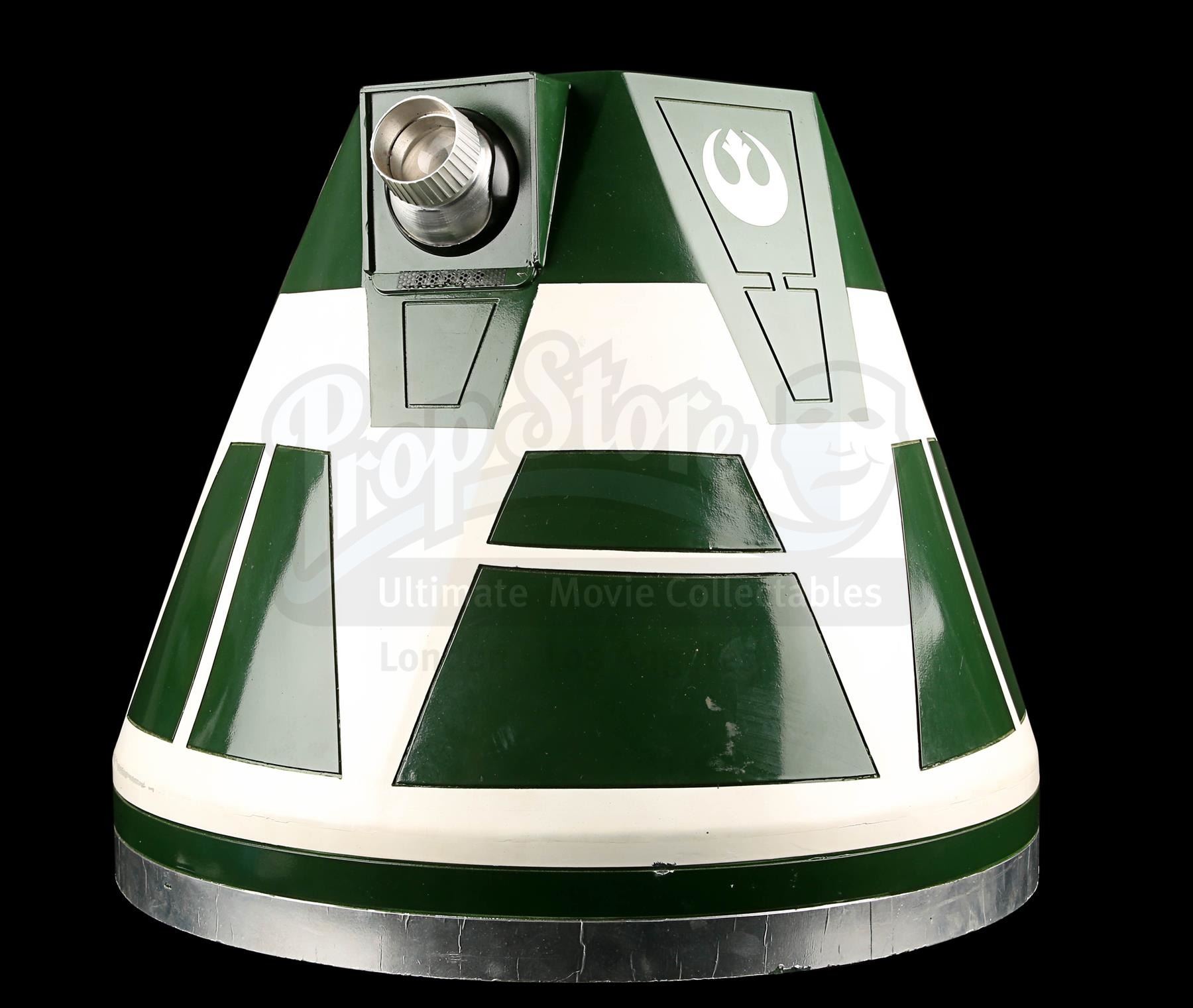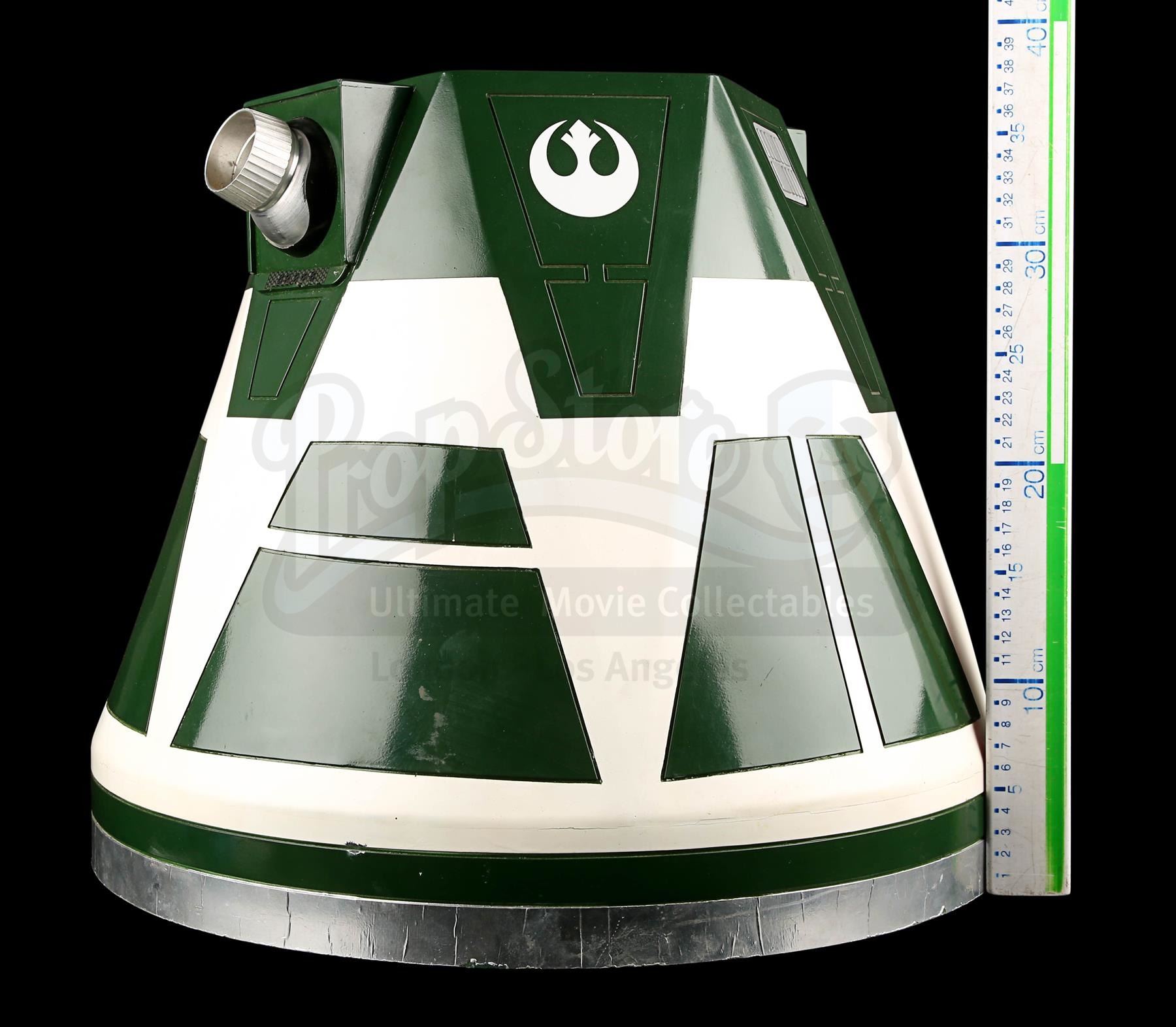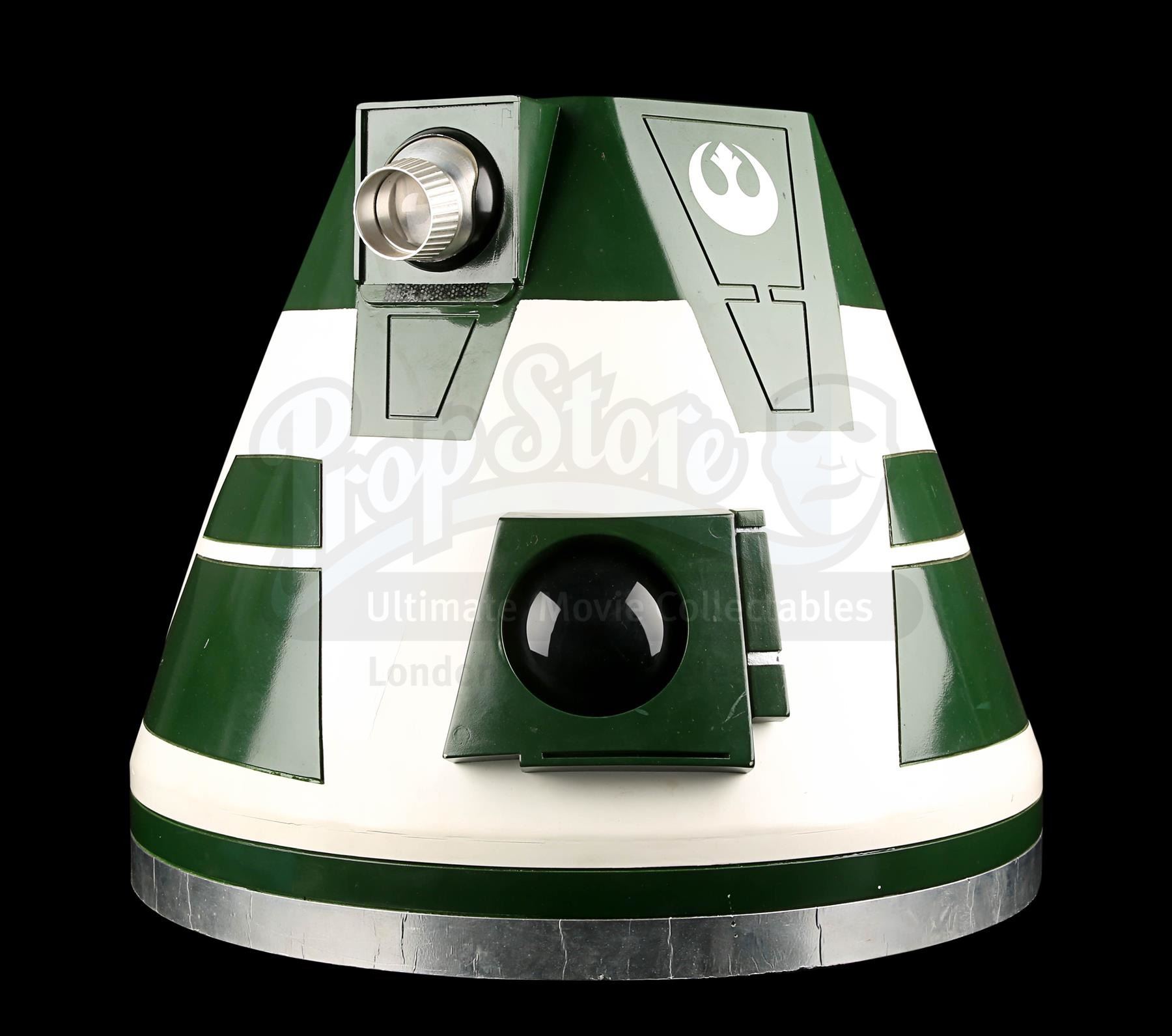 An R4-X2 astromech droid dome from Rian Johnson's Star Wars: The Last Jedi. Droids were important members of the Resistance, working to keep weapons, ships and other machinery functional. R4-X2 worked in the hangar on the main Resistance cruiser, preparing fighter craft for battle. The hanger was destroyed by Kylo Ren (Adam Driver) as Poe Dameron (Oscar Isaac) and the other Resistance pilots were getting ready to battle the First Order. R4-X2 also featured heavily in the promotion of the film, having been turned into a toy after its release, and can be found on page 21 of Star Wars: The Last Jedi ۠The Visual Dictionary.