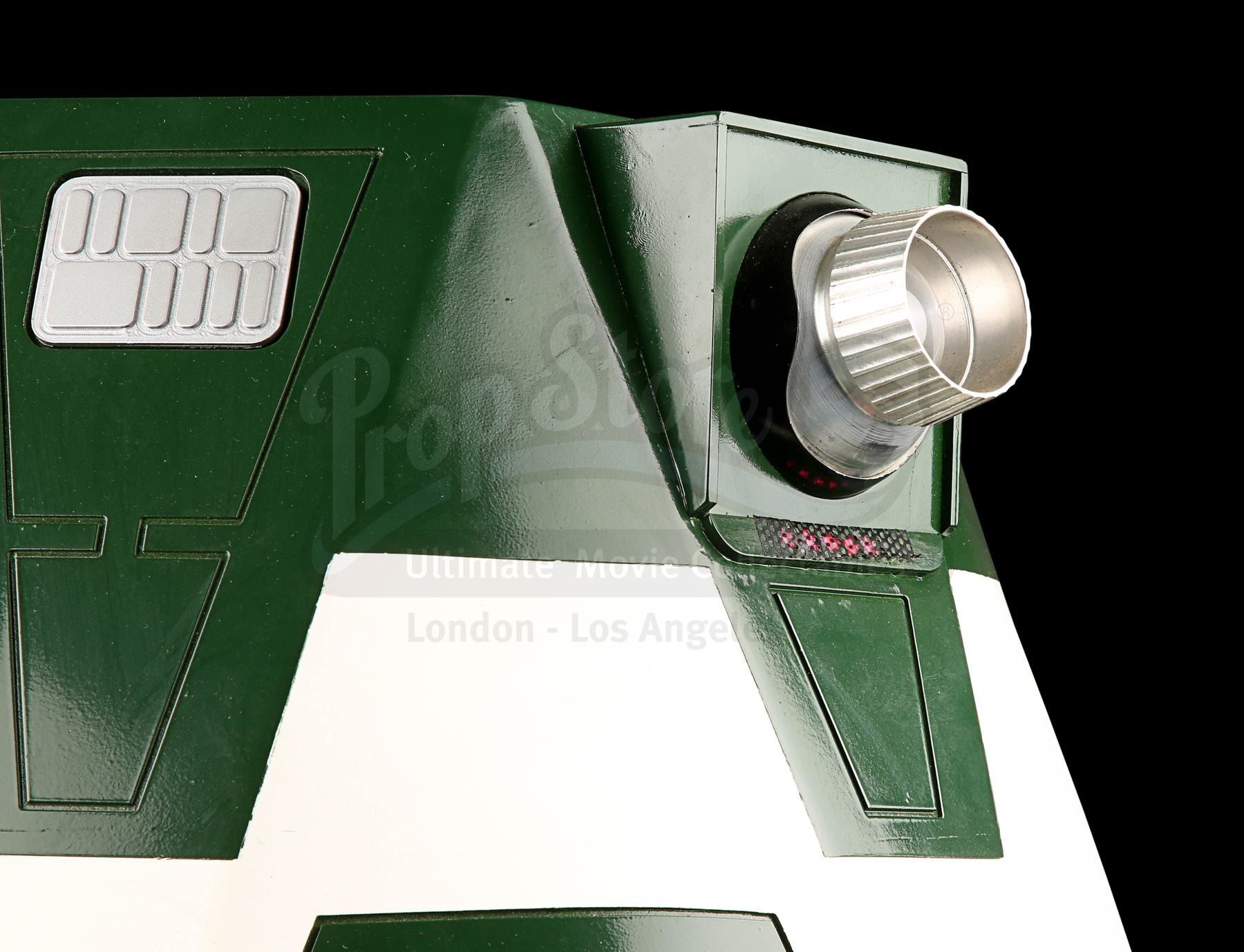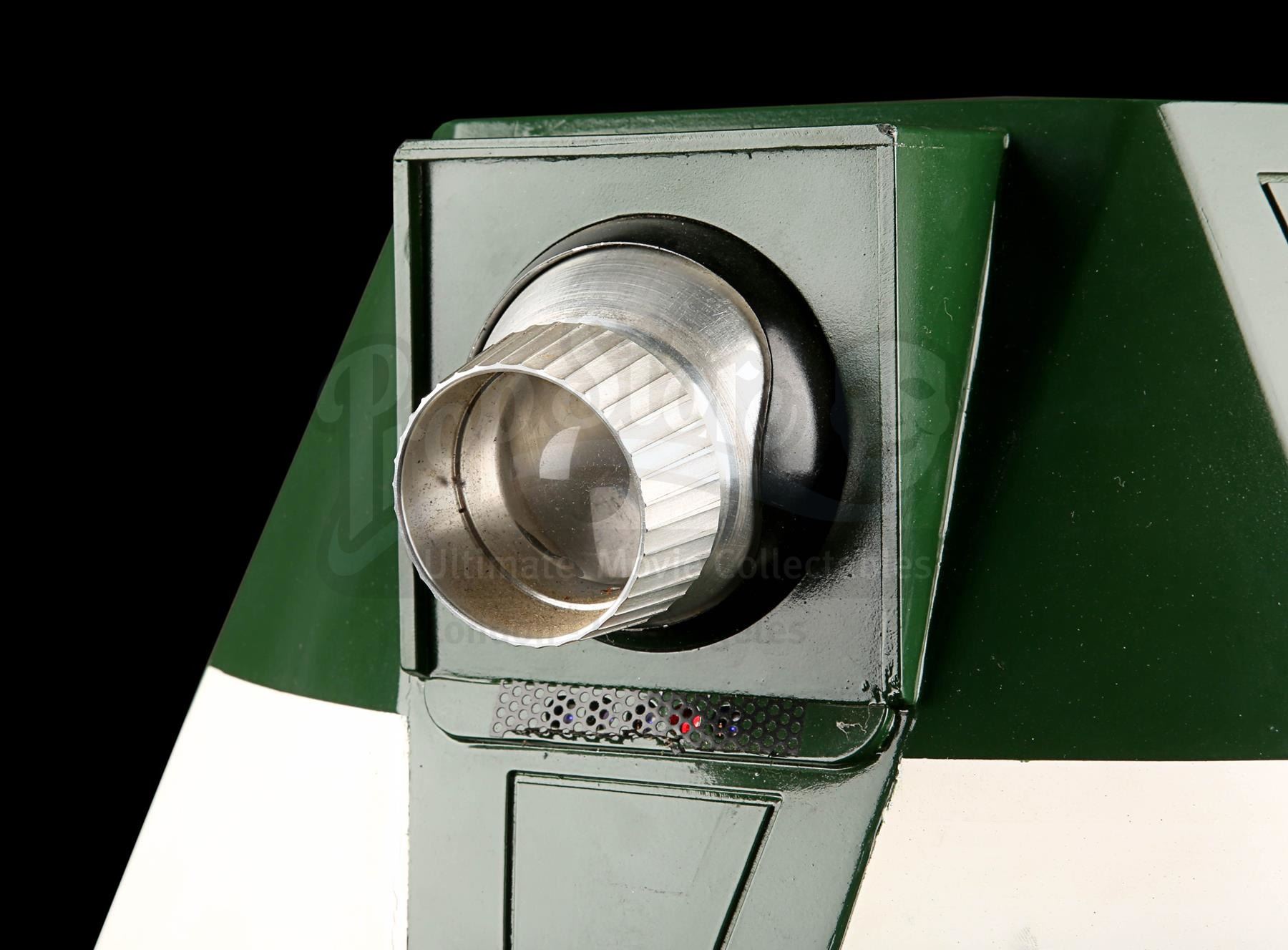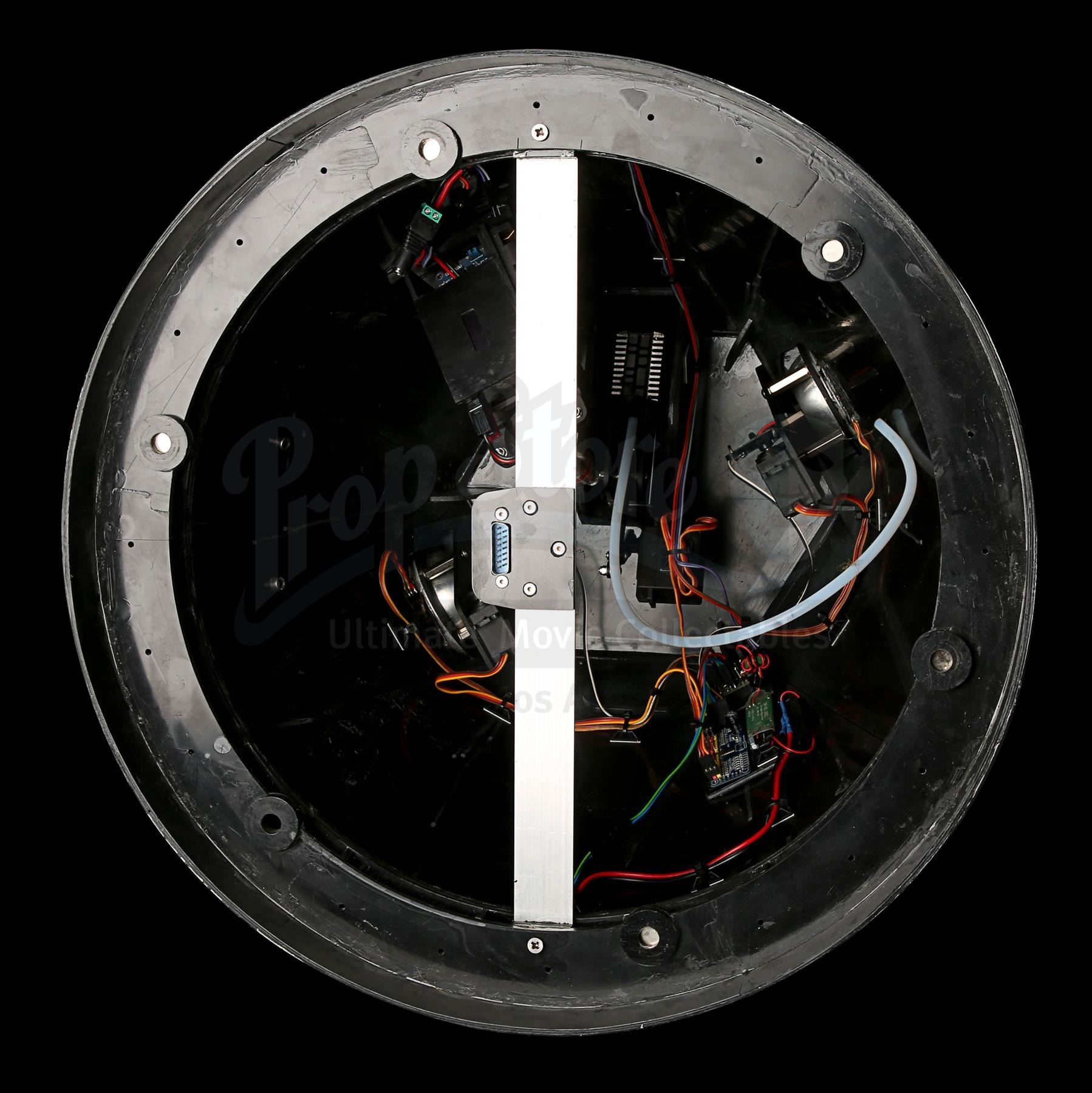 The droid dome was hand-built by Brad Oakley, who also produced droids for Rogue One: A Star Wars Story and Solo: A Star Wars Story. It is made of CNC (computer numerical control)-cut styrene frames that were hand skinned. Key features include its radar eye, two aluminium holographic projectors that move at random and flash when the droid head is connected to a power supply, and two sets of five RGB (red-green-blue) LEDs that flash in patterns under the droid's projectors.