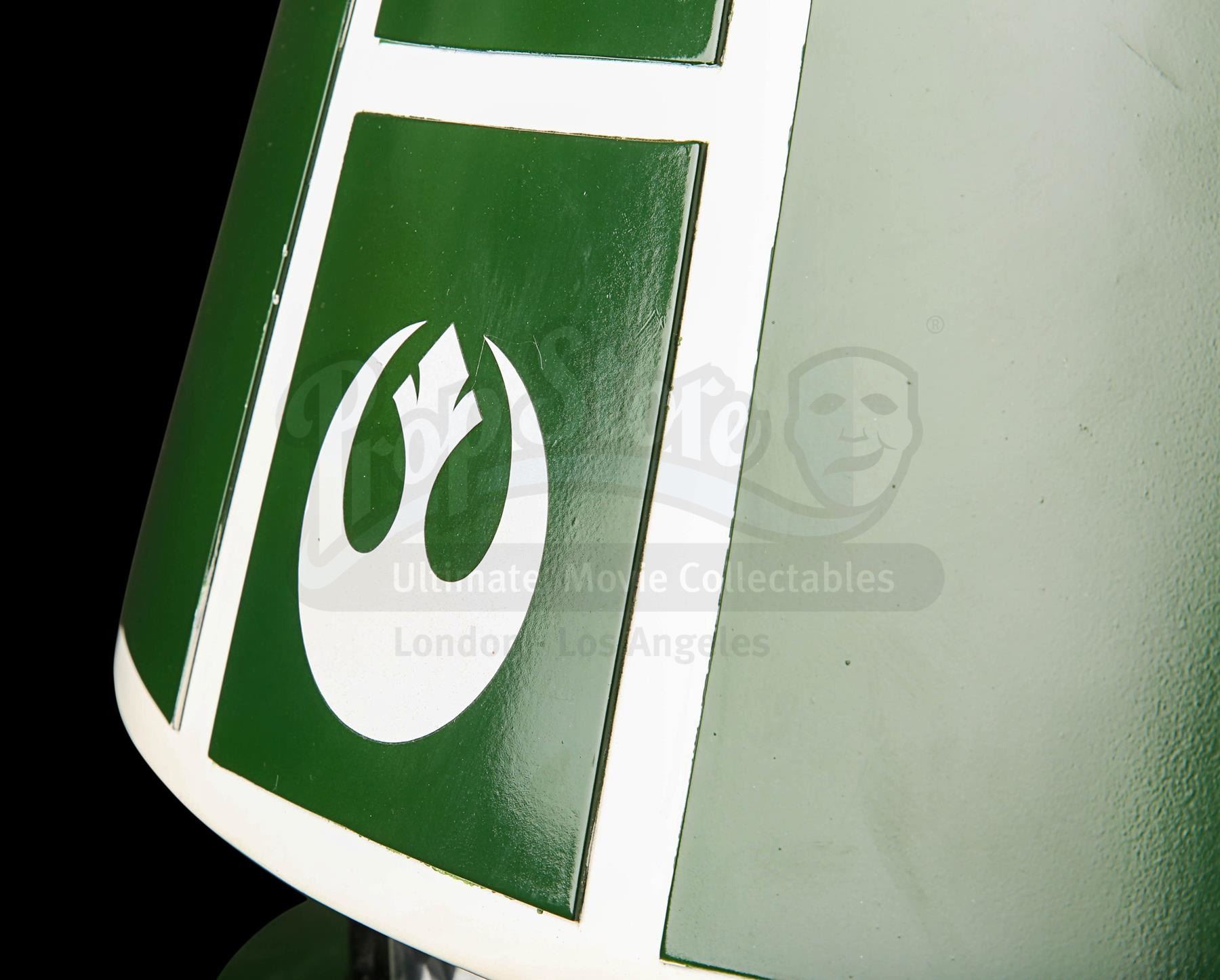 A Y5-X2 astromech droid dome from Rian Johnson's Star Wars: The Last Jedi. Astromech droids were important members of the Resistance, working to keep weapons, ships and other machinery functional. The Y5-X2 was created to appear in several scenes on the bridge of The Raddus, in the background behind General Leia (Carrie Fisher), but Fisher asked that the droid be removed as the noise of it moving was distracting her from her lines.