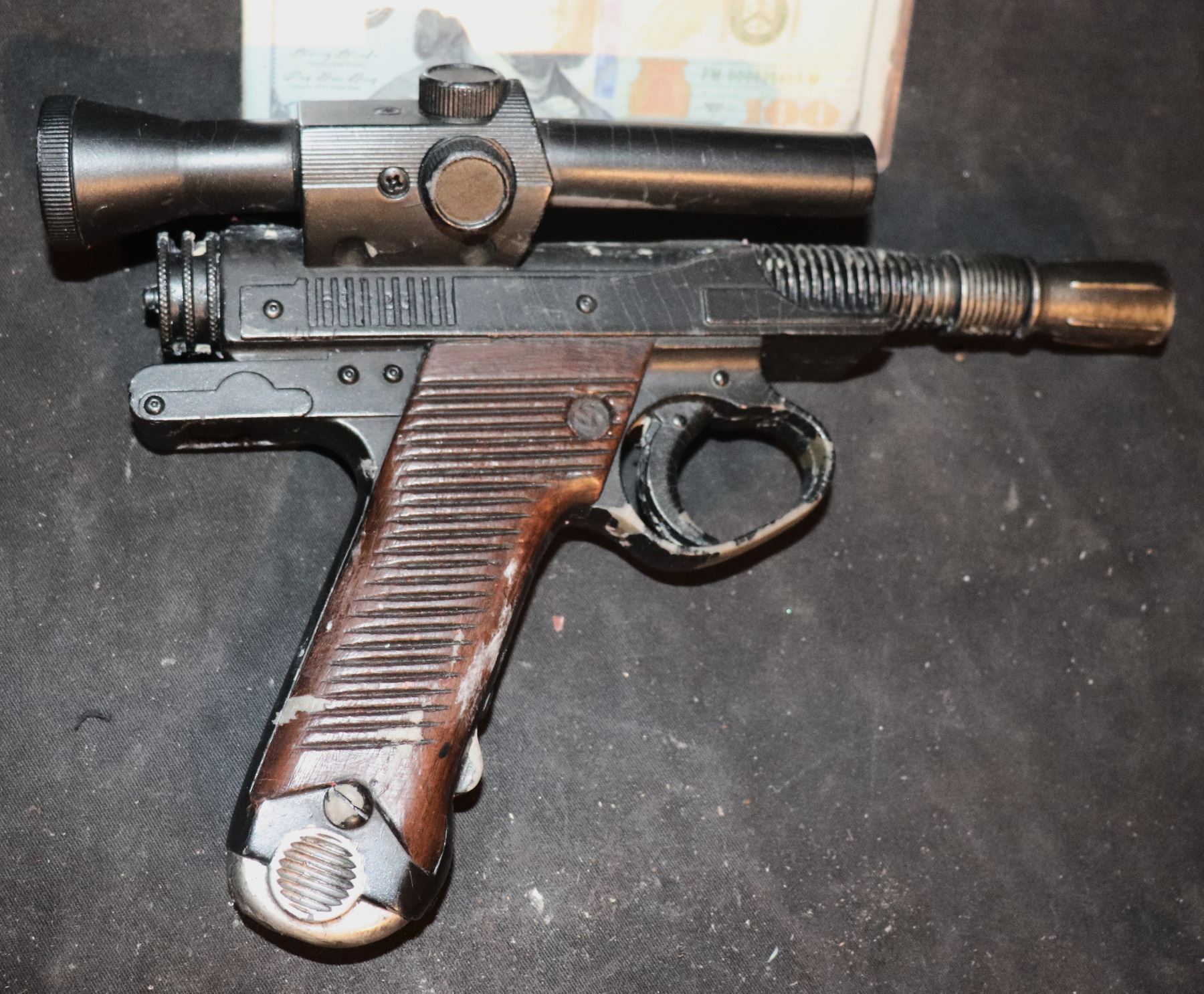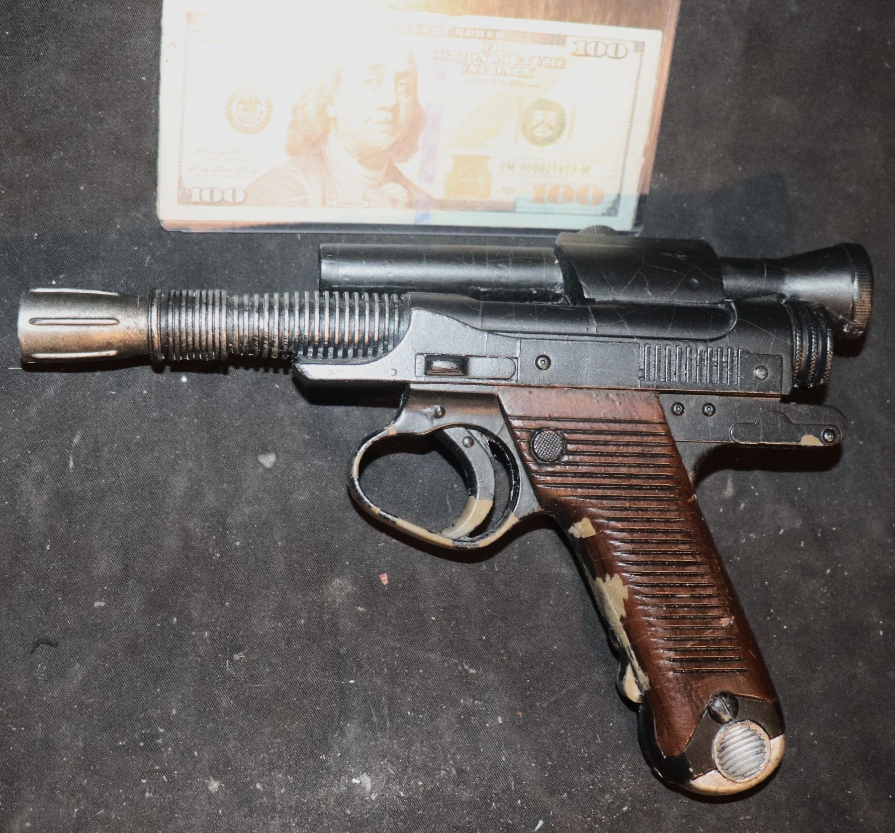 This is a holster, draw, running, and action version of her blaster. Somewhere between Hero and Stunt. Shows significant wear on grips and trigger from use.