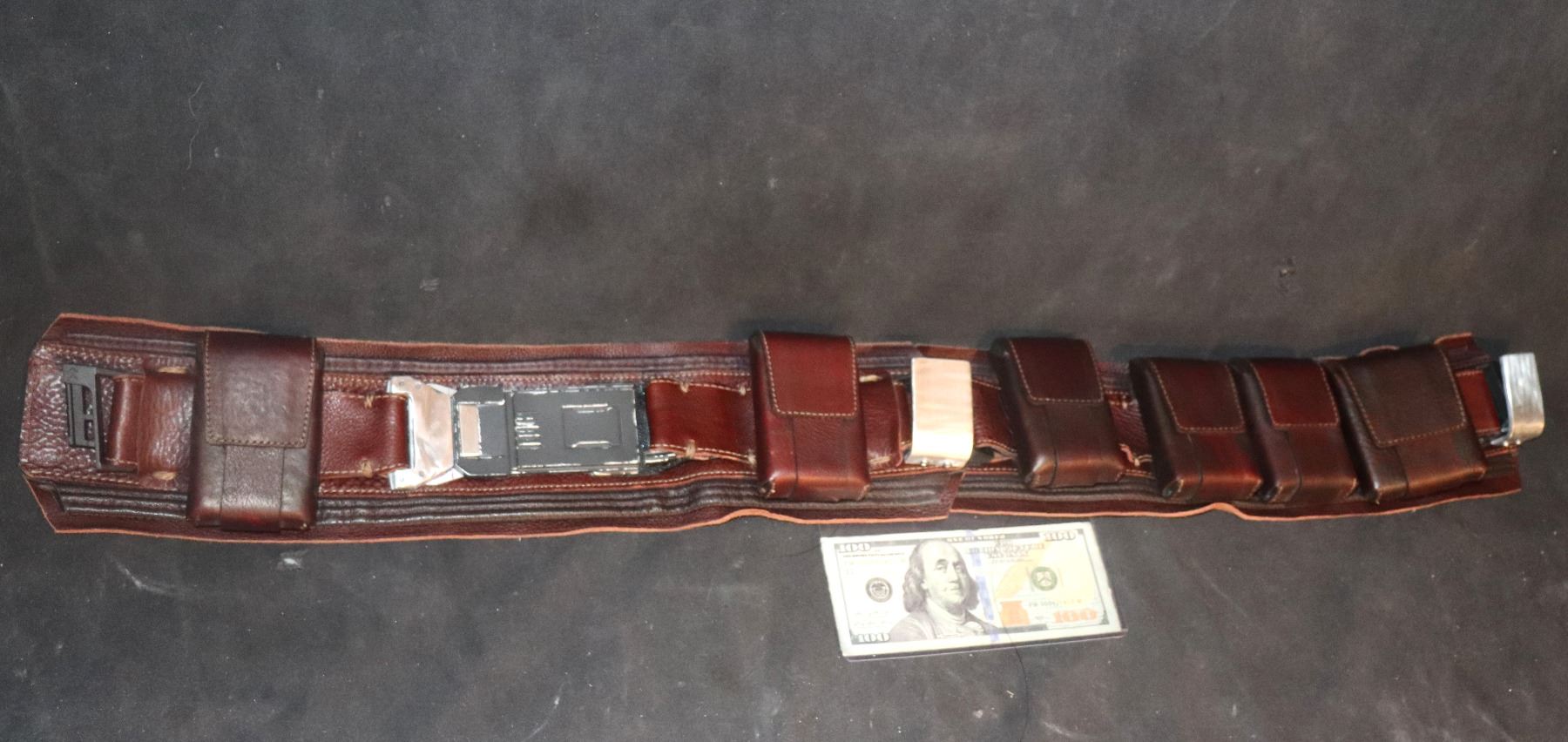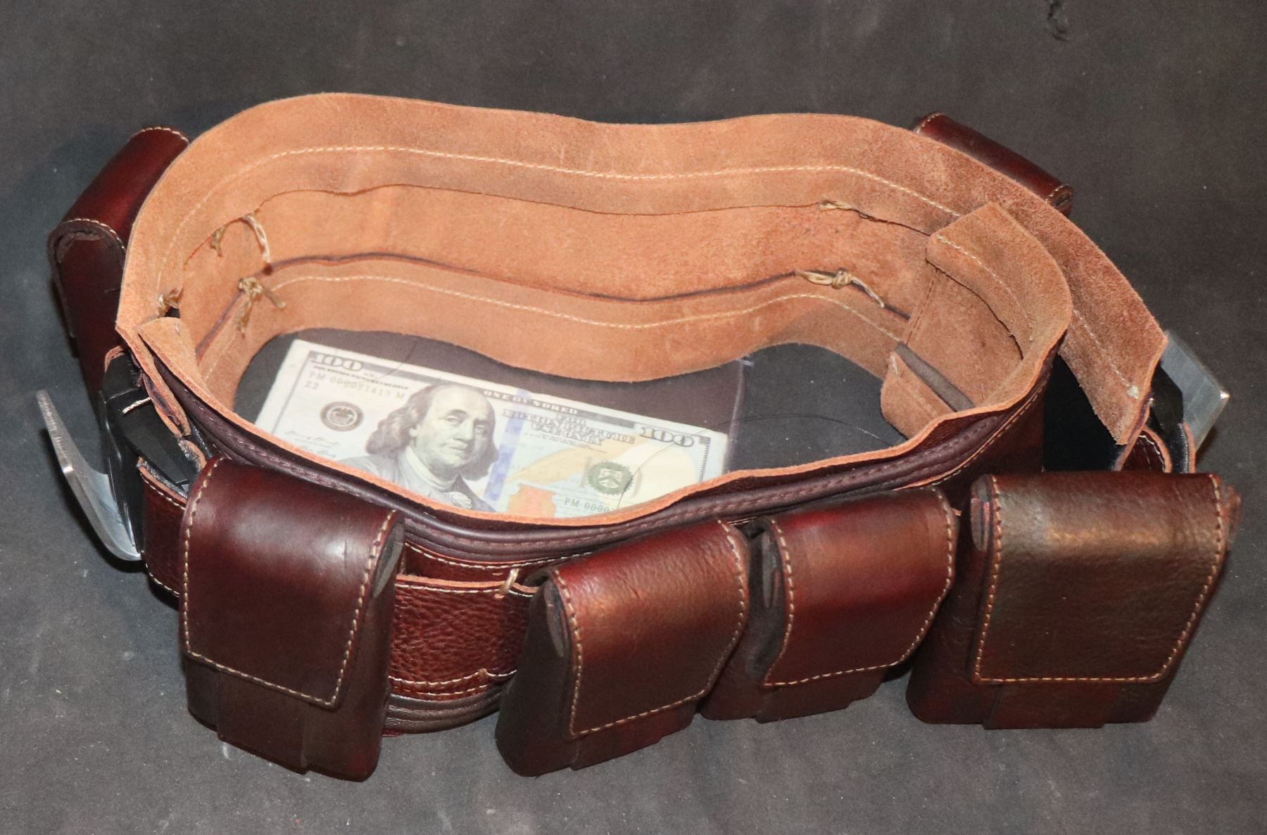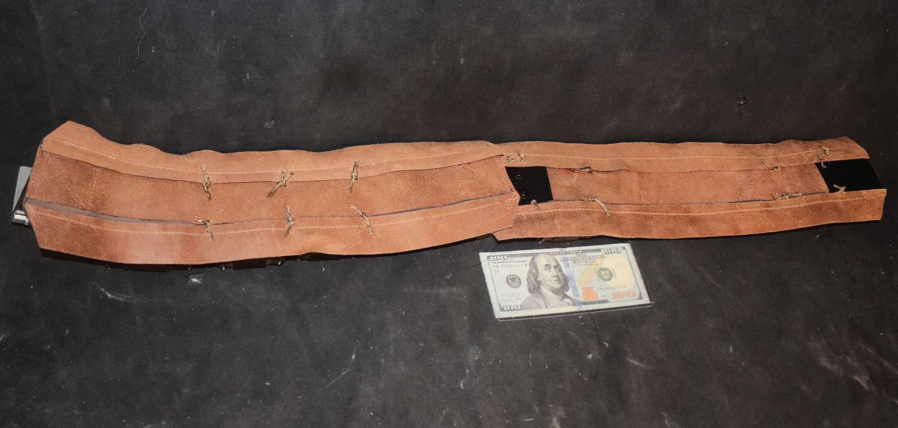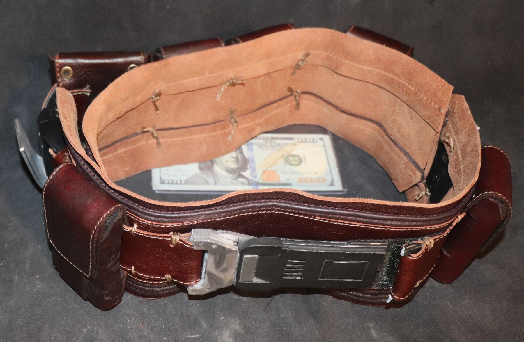 Real Leather and Metal with pouches, holster hooks, and hidden buckle! Made to hold up to long term abuse as if Mandalorians were real Gunslingers!