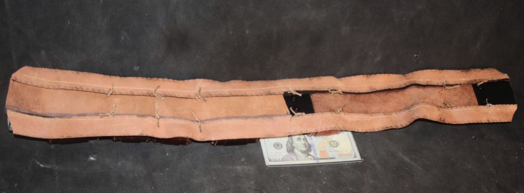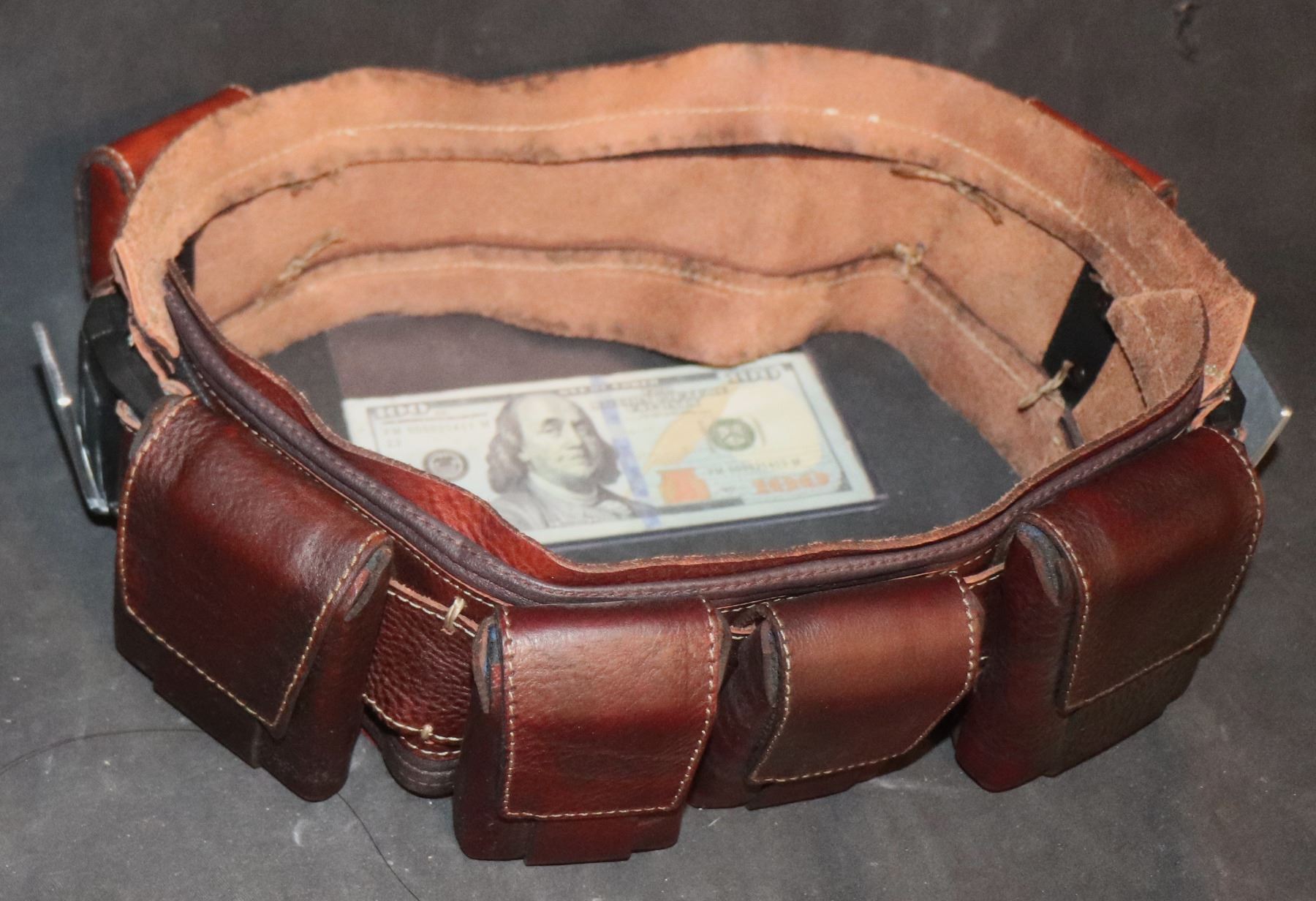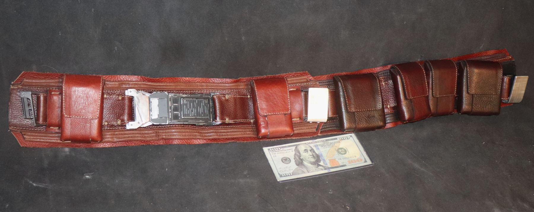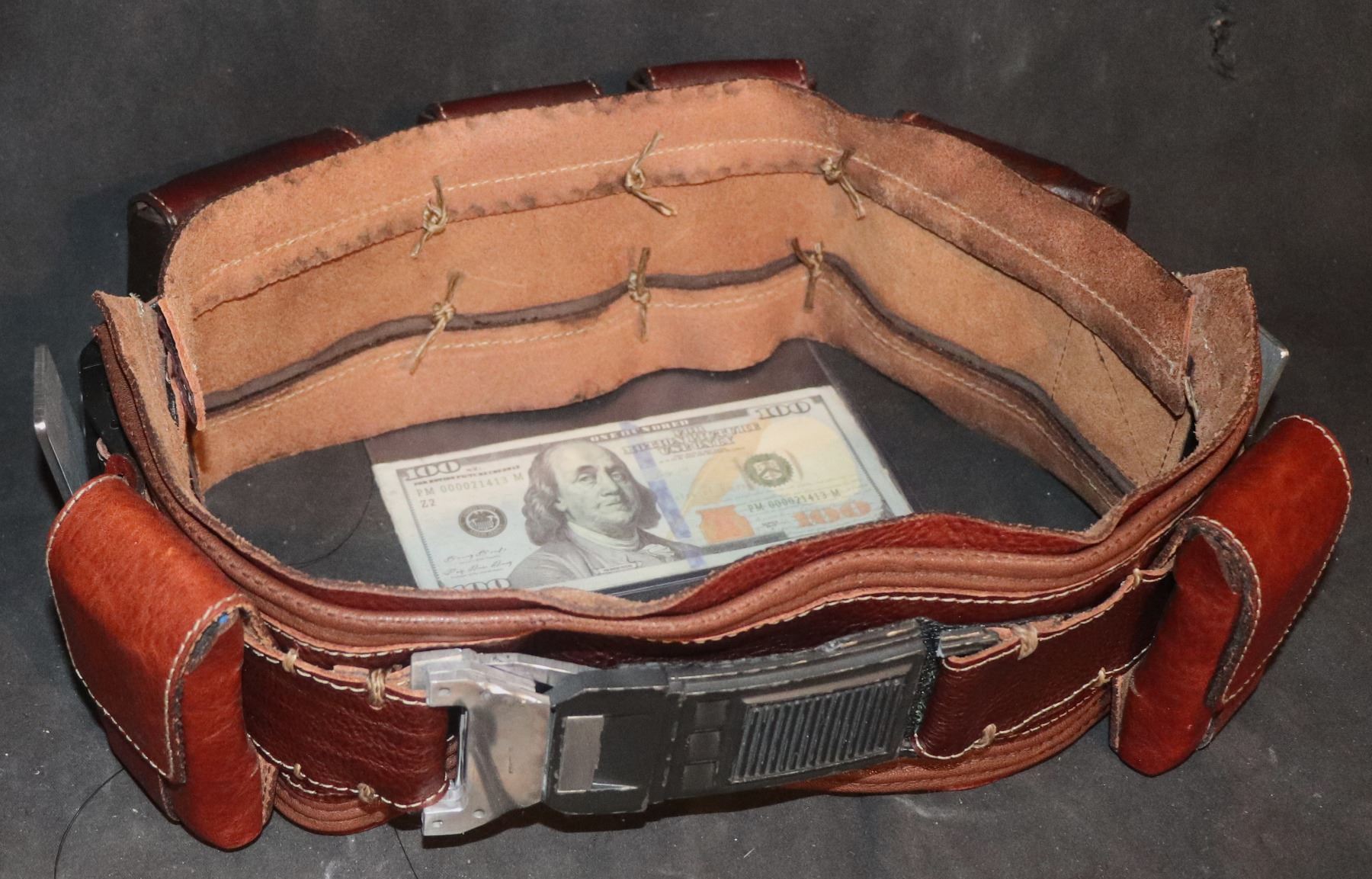 Real Leather and Metal with pouches, holster hooks, and hidden buckle! Made to hold up to long term abuse as if Mandalorians were real Gunslingers!