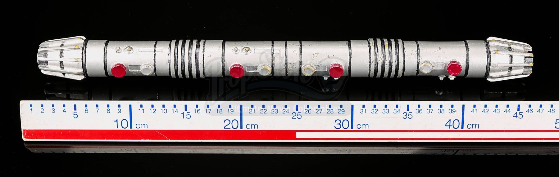 The double-ended hilt is cast in resin with a metal internal core adding weight. Finished in faux-silver paint, alternating control lock buttons and red activator buttons run down the length of the piece. Shades of dark grey have been used to give additional depth to detailing throughout, including the two ribbed handgrips and parts of the blade emitter plates. Both ends are open, exposing the internal metal rod where the metal rig would have been fastened. The hilt displays paint wear from use on production, exposing the resin beneath — notably on some of the buttons — and the lot shows minor marks and scuffs. Dimensions: 47 cm x 5 cm x 5 cm (18 ½” x 2” x 2”)