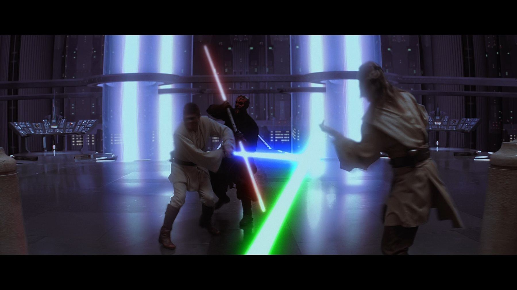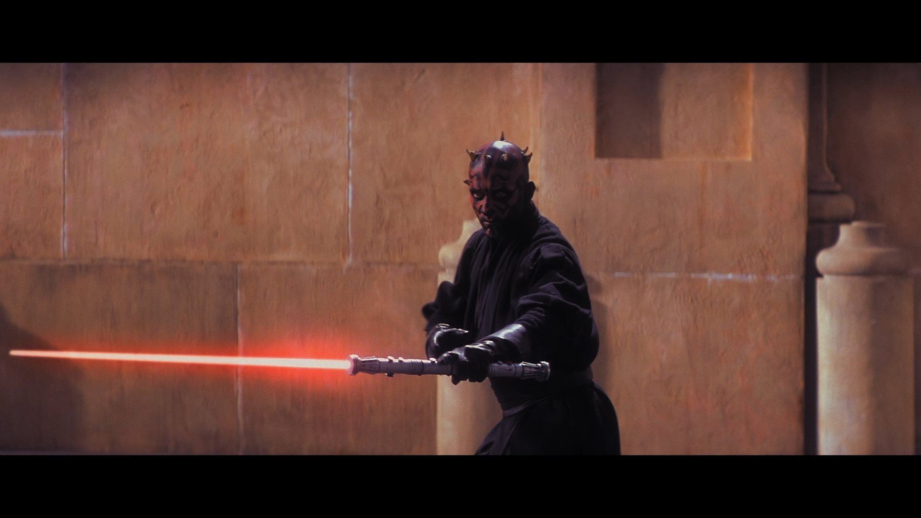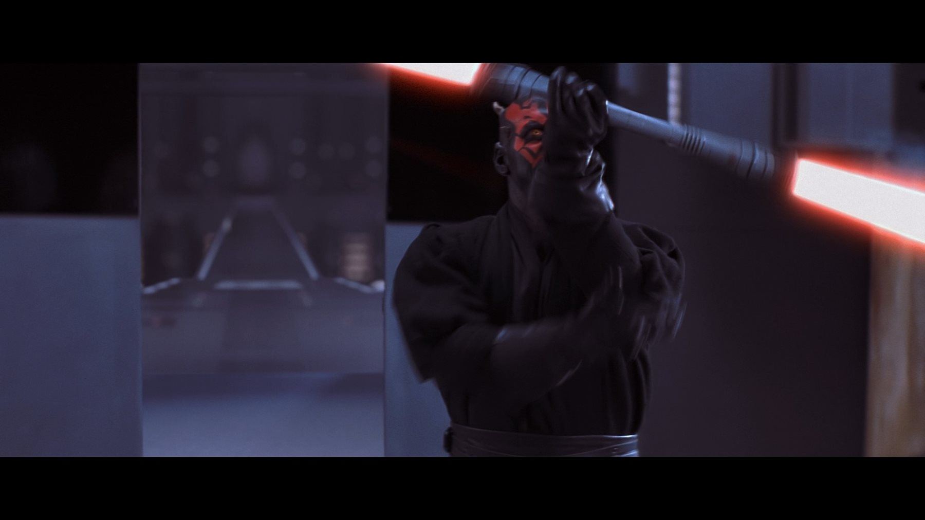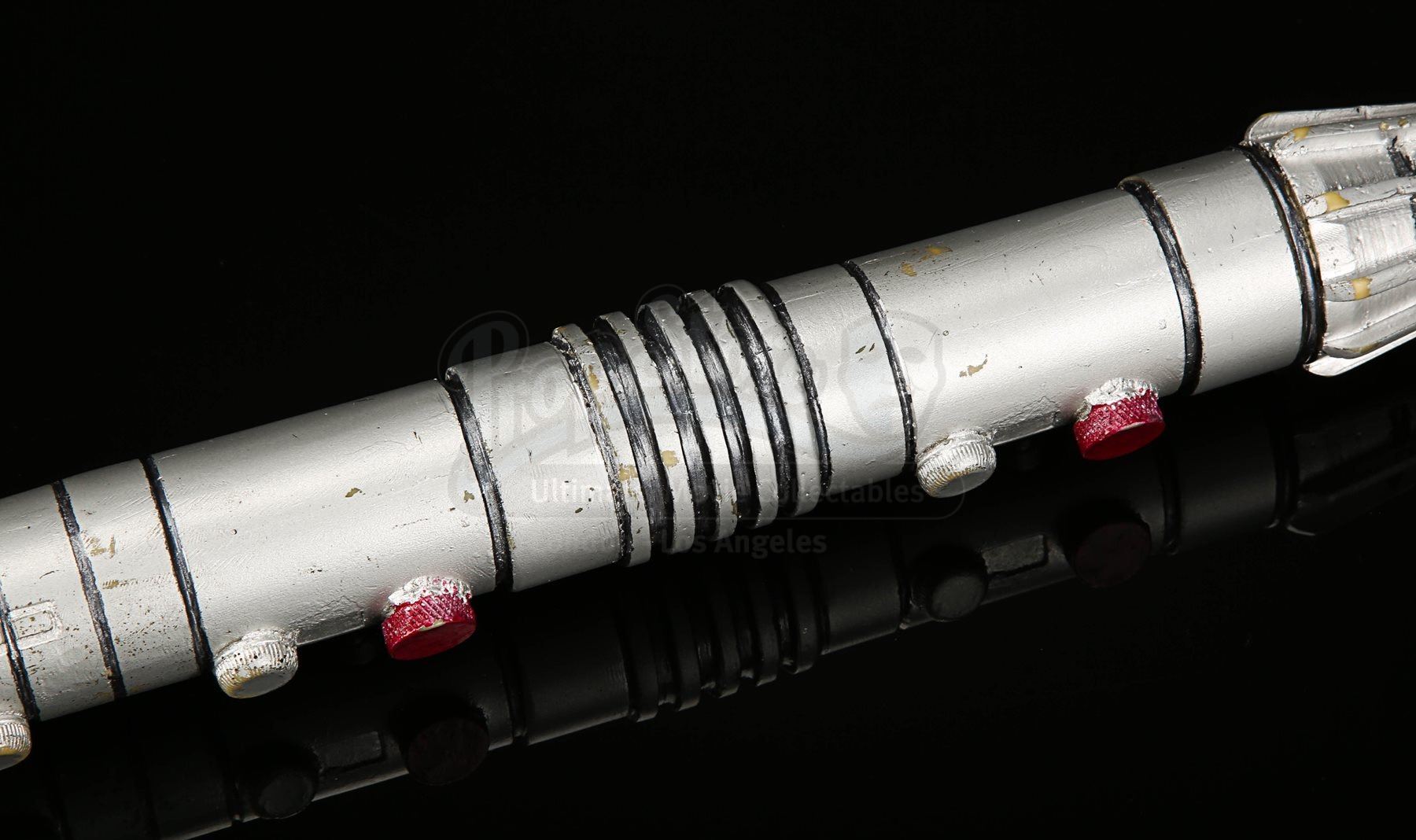 Renowned stunt coordinator Nick Gillard, who worked on the Star Wars prequel trilogy, designed this hilt for a specific manoeuvre in the battle scene, in which Darth Maul jumped up and pivoted while a lightsaber blade swiped beneath him. In order for Park to safely hold the lightsaber and perform the move, the hilt needed extra support, so was attached to a metal rig for filming. Due to the fast-paced movements in the battle, it is unclear whether this particular sequence made the final cut of the film.