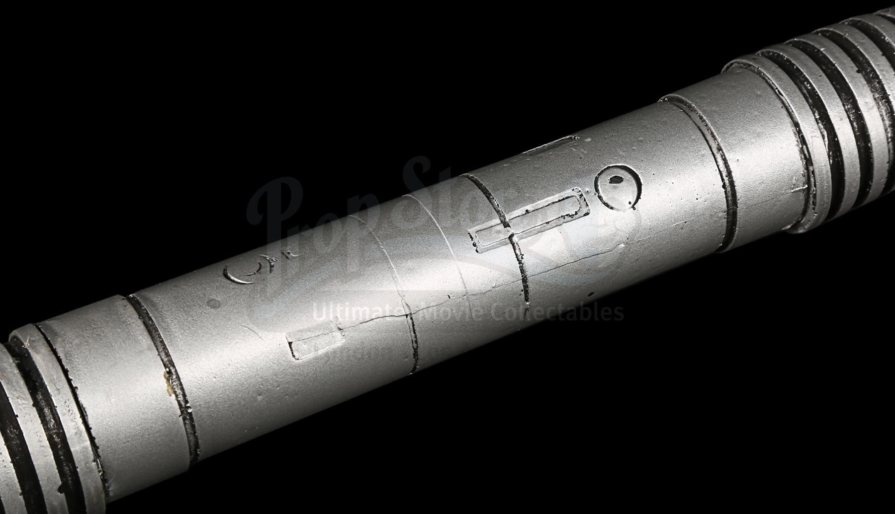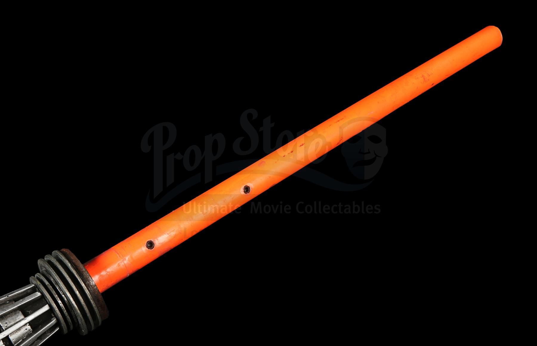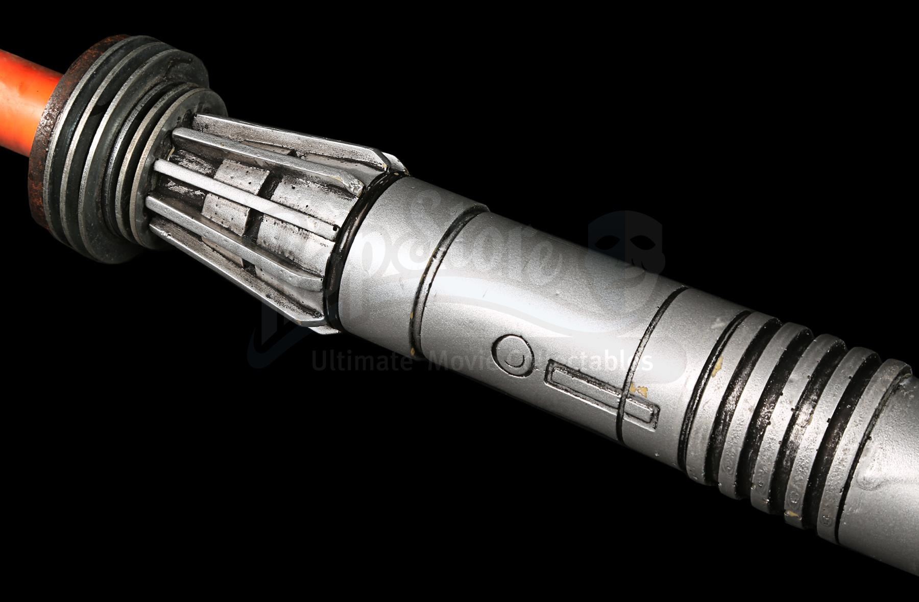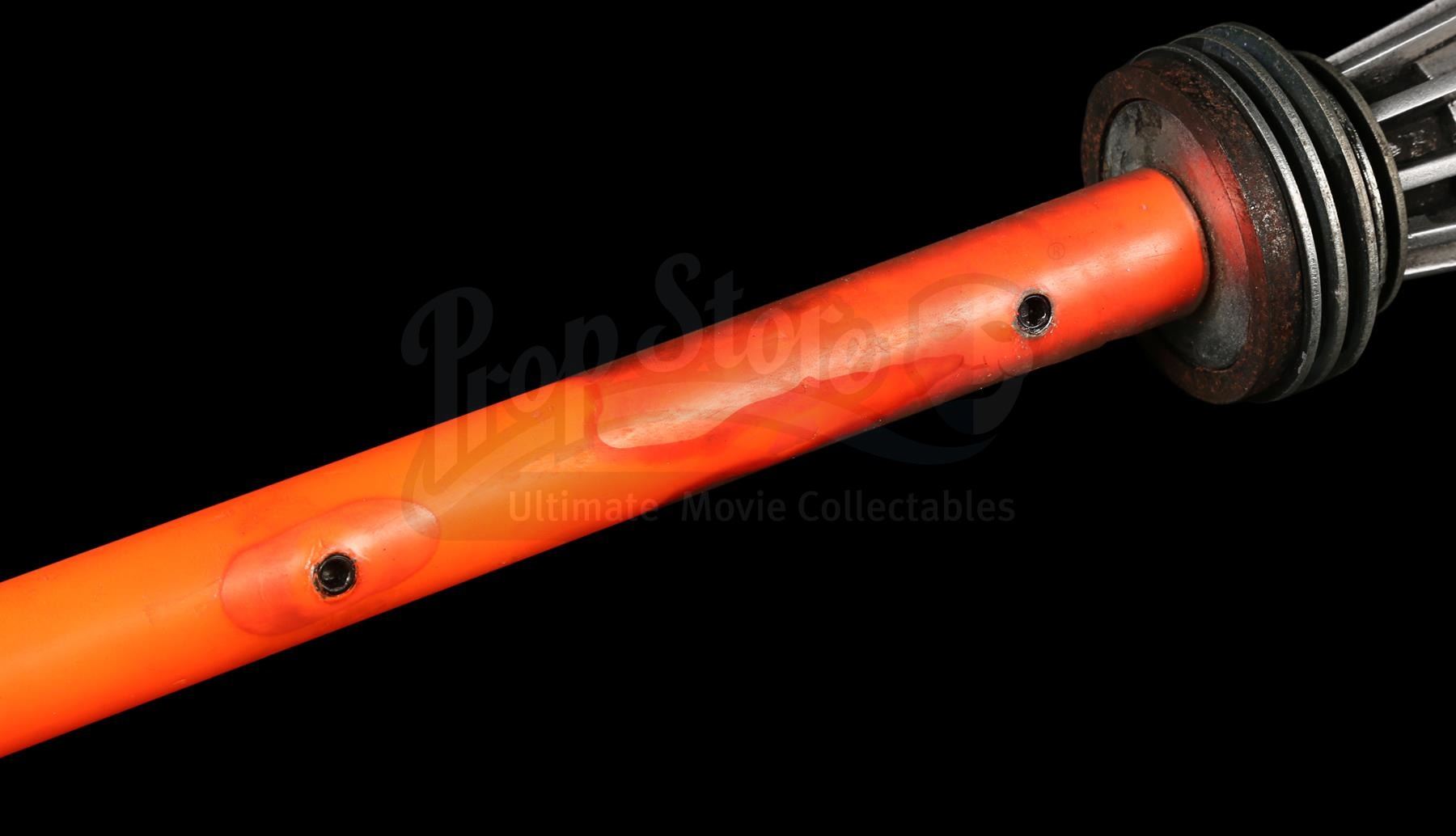 The double-ended hilt is cast in resin, with a metal internal core to add weight and strength and machined metal end caps. It is finished in faux-silver paint, with red-painted detailing representing the multiple activator buttons which run down the length of the hilt. Shades of dark grey have been applied to give additional depth to the detailing throughout, including the two ribbed handgrips and parts of the blade-emitter plates. Each of the two blades comprises an aluminium tube covered in shrink-wrapped luminous orange paint. Four bolt fastenings adorn each blade, added to allow the lightsaber blade to be secured.
