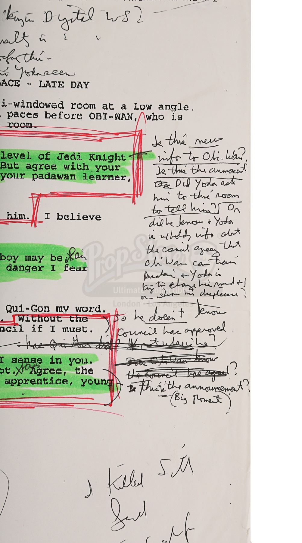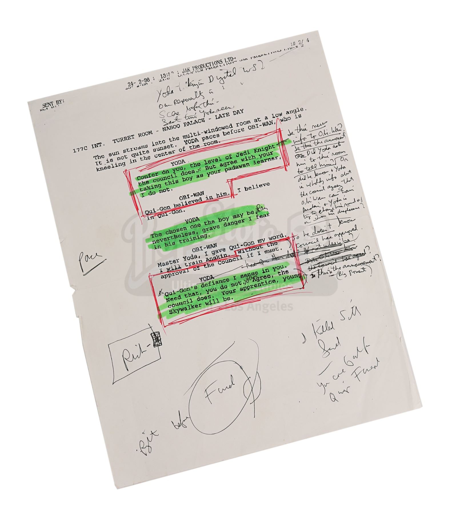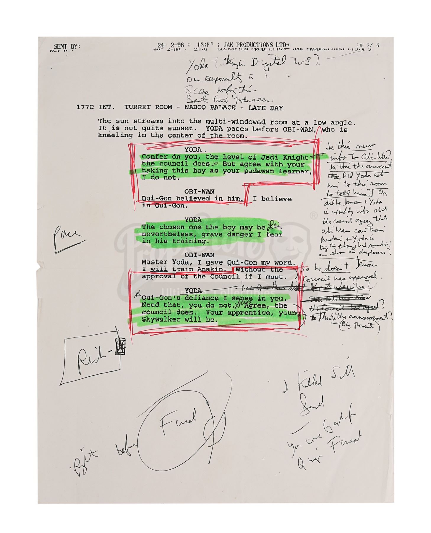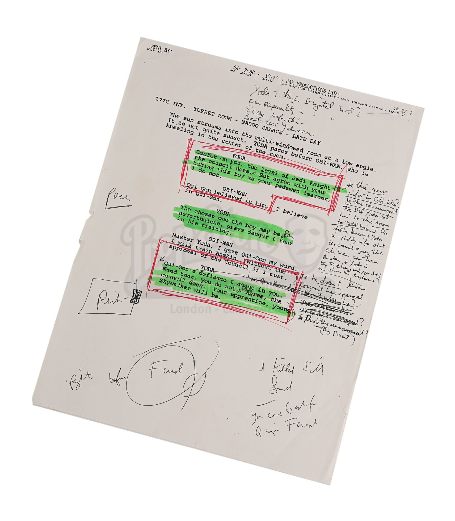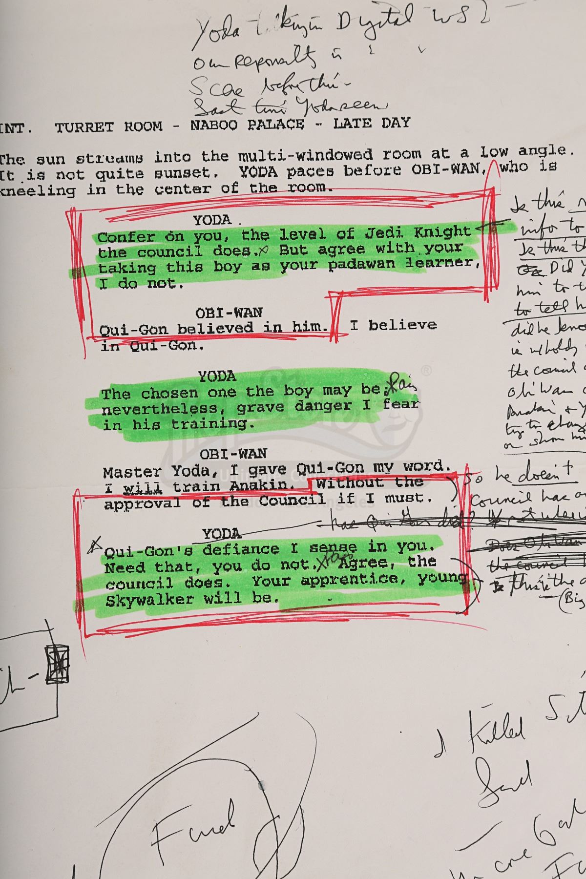 An annotated script page belonging to puppeteer Frank Oz from the production of George Lucas' Star Wars: The Phantom Menace. The page displays a small amount of dialogue between the legendary Jedi Master Yoda (Oz) and Jedi Padawan Obi-Wan Kenobi (Ewan McGregor). Each of Yoda's lines is highlighted in green, and red pen has been used to outline certain parts of the text. Several annotations are handwritten on the page in black ink, including multiple questions along the right edge. The page displays minor edgewear, small rips down the left side and a horizontal fold line is present from storage. Dimensions: 28 cm x 21.5 cm (11" x 8 1/2")