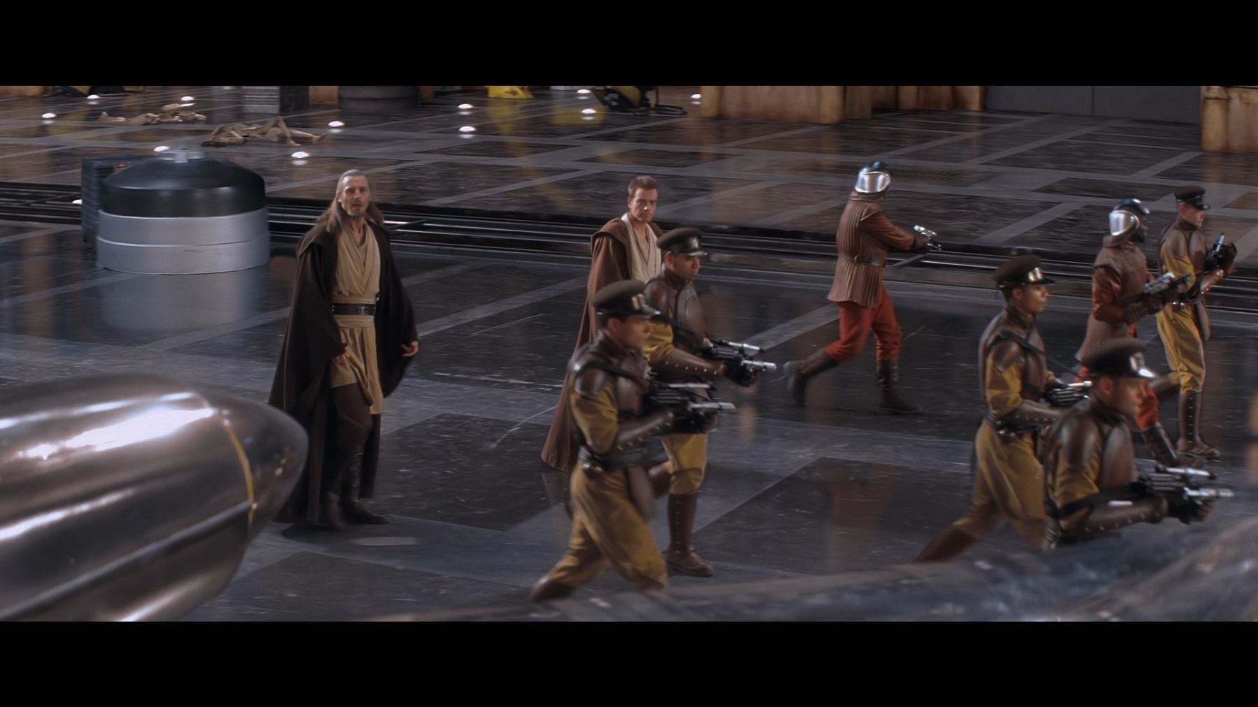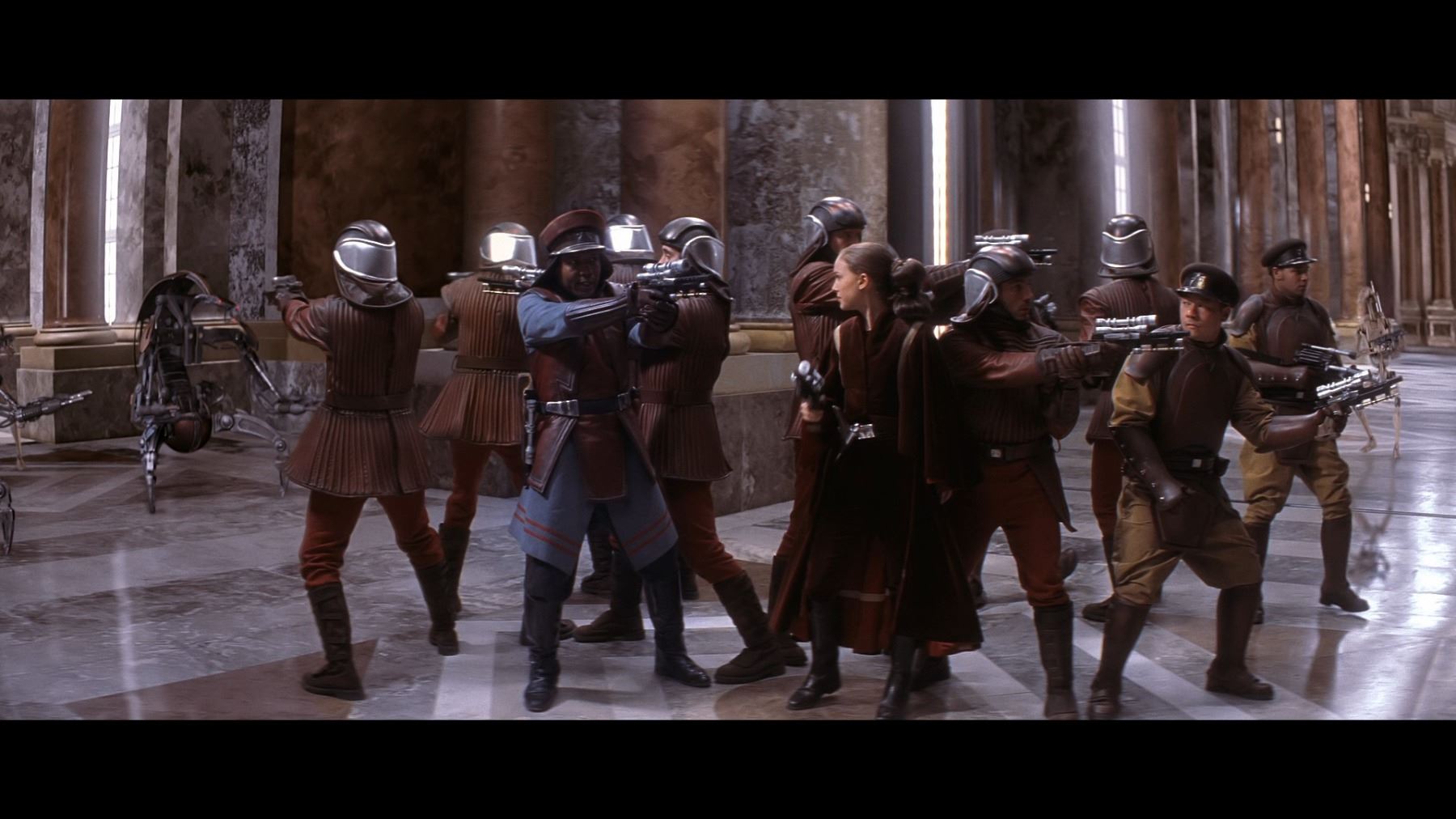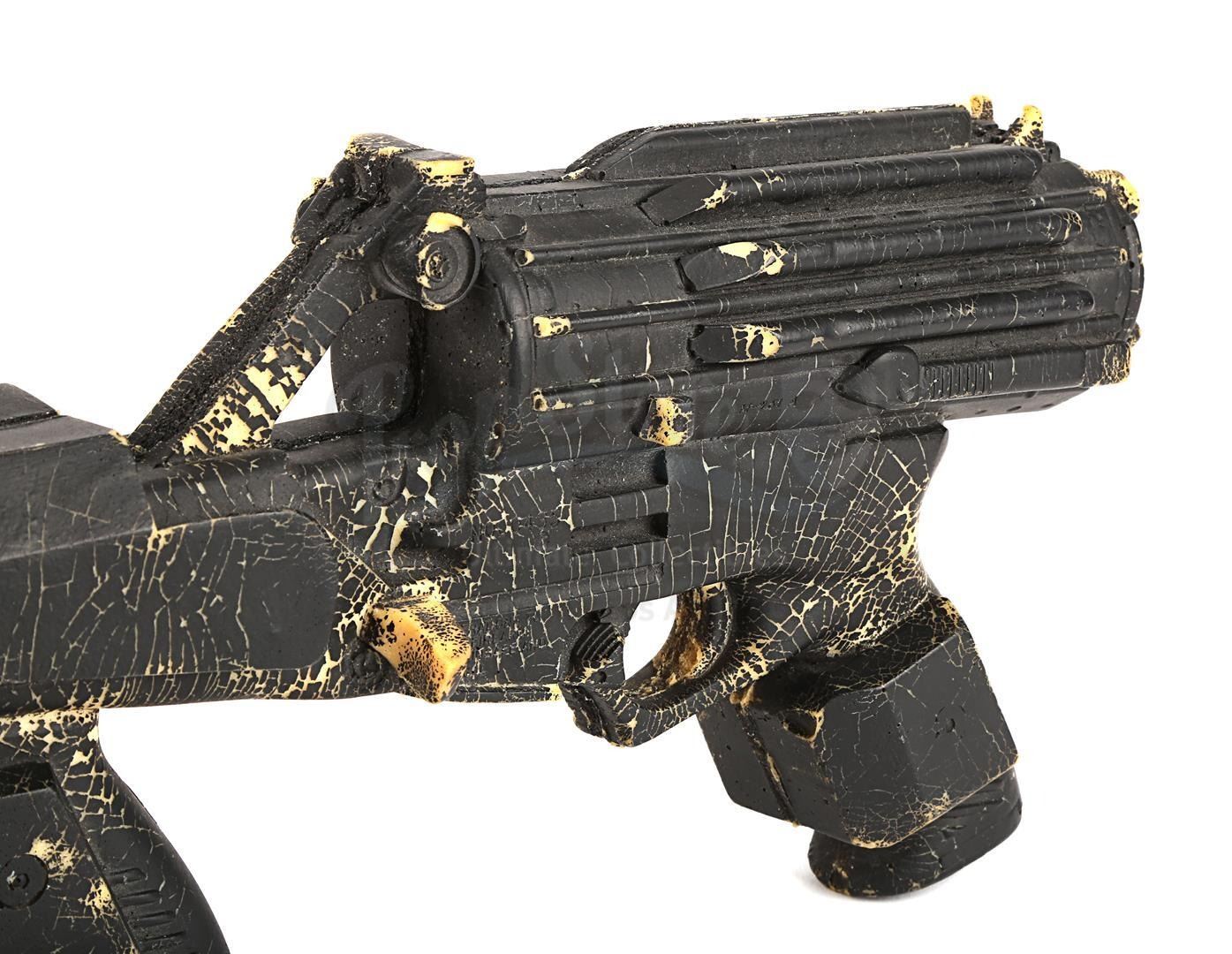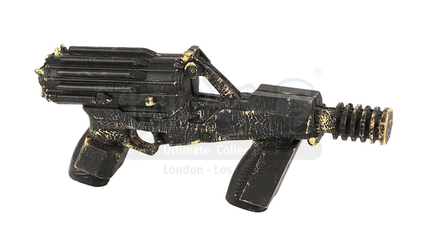 A Naboo guard stunt blaster from George Lucas' Star Wars: The Phantom Menace. Naboo guards carried their rifles while reclaiming the royal palace with Padmé Amidala (Natalie Portman). The rifle is made of rubber and painted black. Some of the paint has cracked and come away, revealing the rubber underneath, and the mould line is clearly visible down the middle of the weapon. Dimensions: 43 cm x 7.5 cm x 19 cm (17" x 3" x 11 1/2")