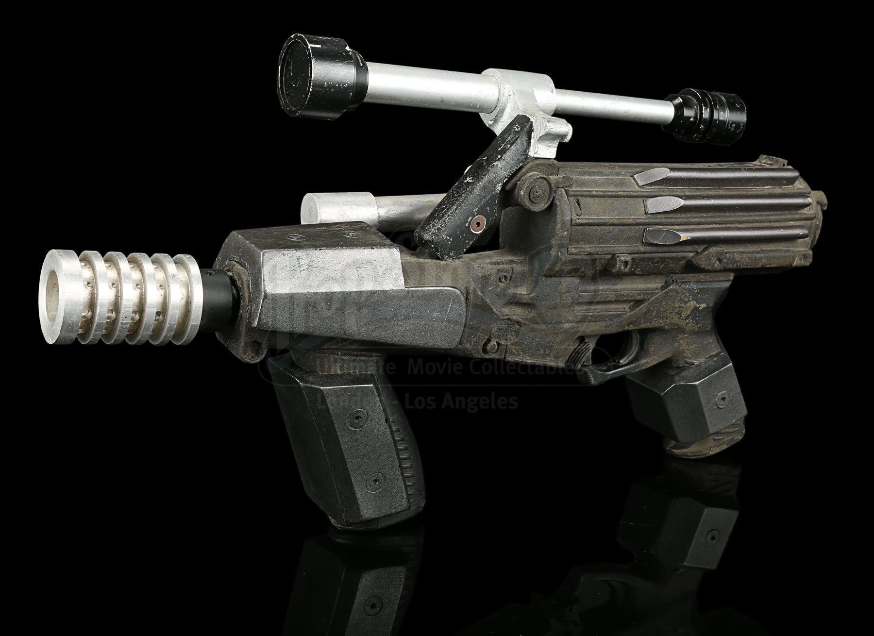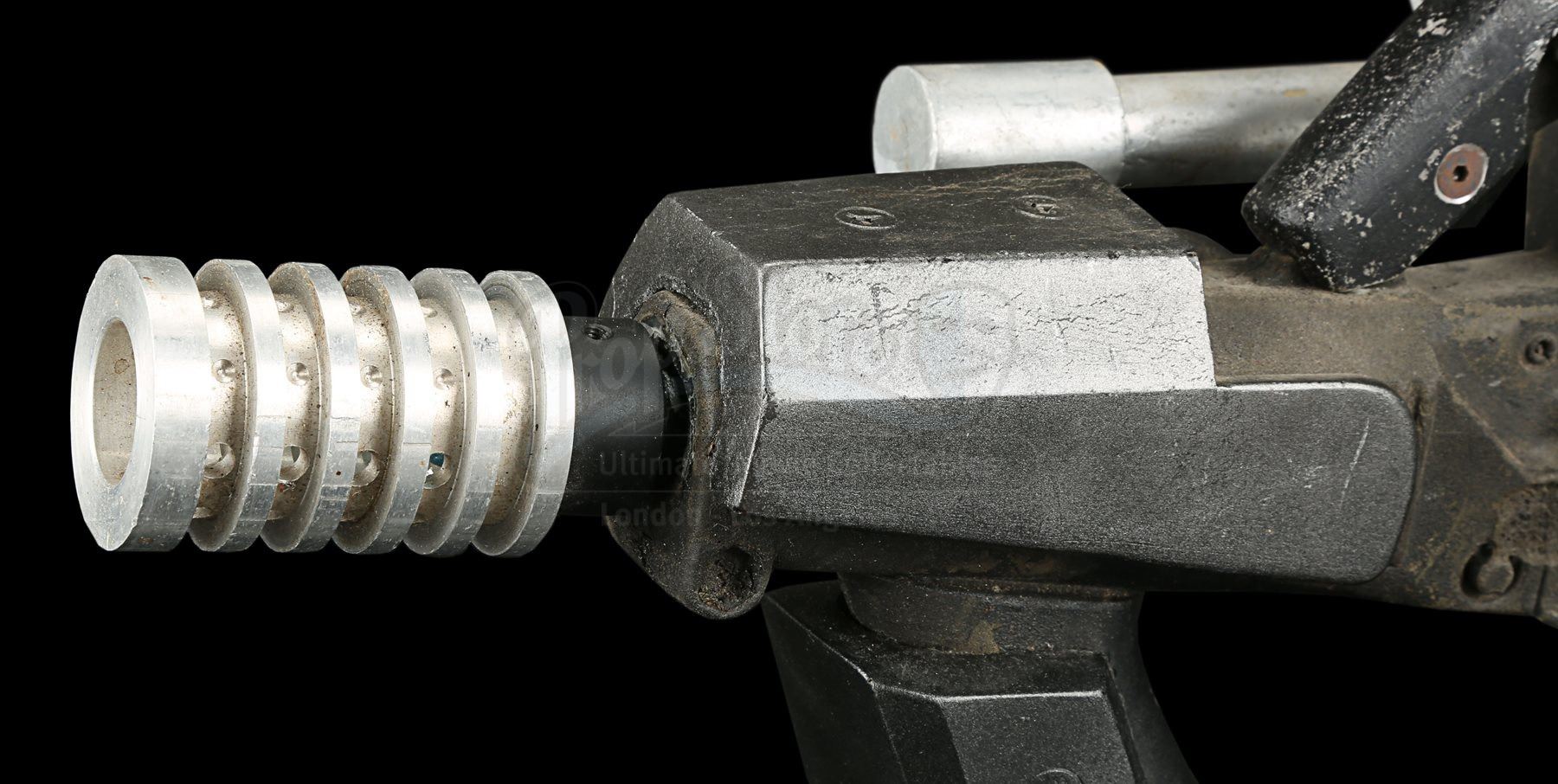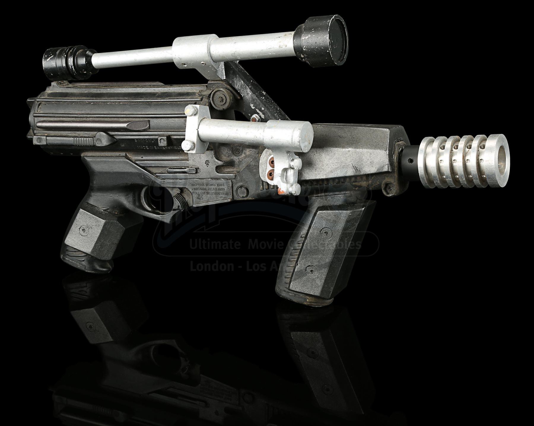 Based on the design of a Calico M961A carbine, the blaster is cast in dense foam with additional components, including a resin faux-scope, grip attachment and metal barrel. The body of the weapon is cast from a Calico submachine gun, with embedded original factory markings on both sides, and is finished in black and faux-silver paint, creating a futuristic appearance. The weapon displays light wear to the paint finish, minor scratches and an orange paint scuff from use during production. Dimensions: 44 cm x 9cm x 25 cm (17 ¼” x 3 ½” x 10”)