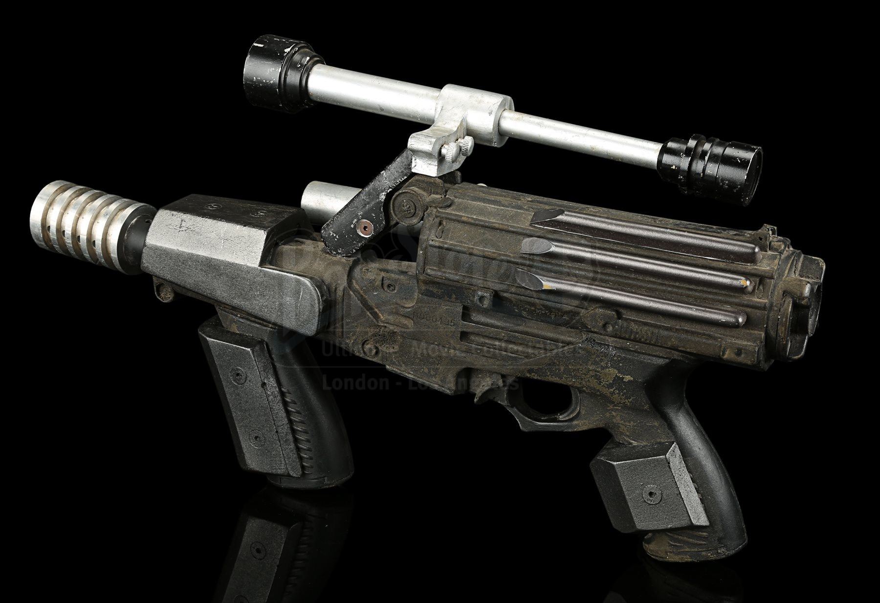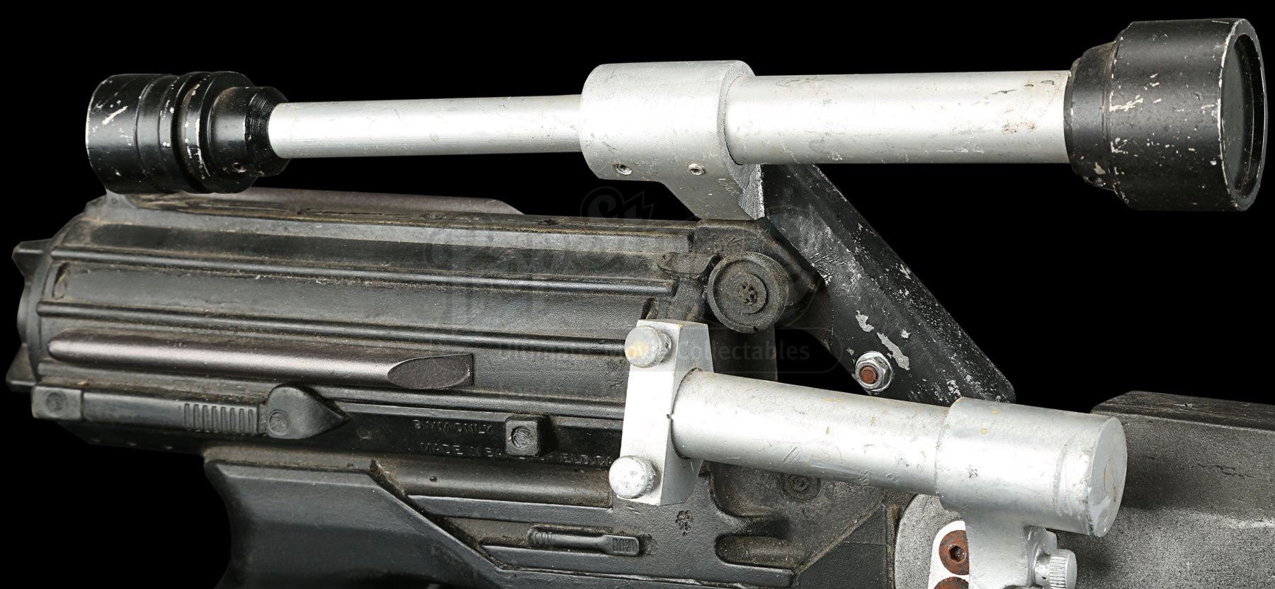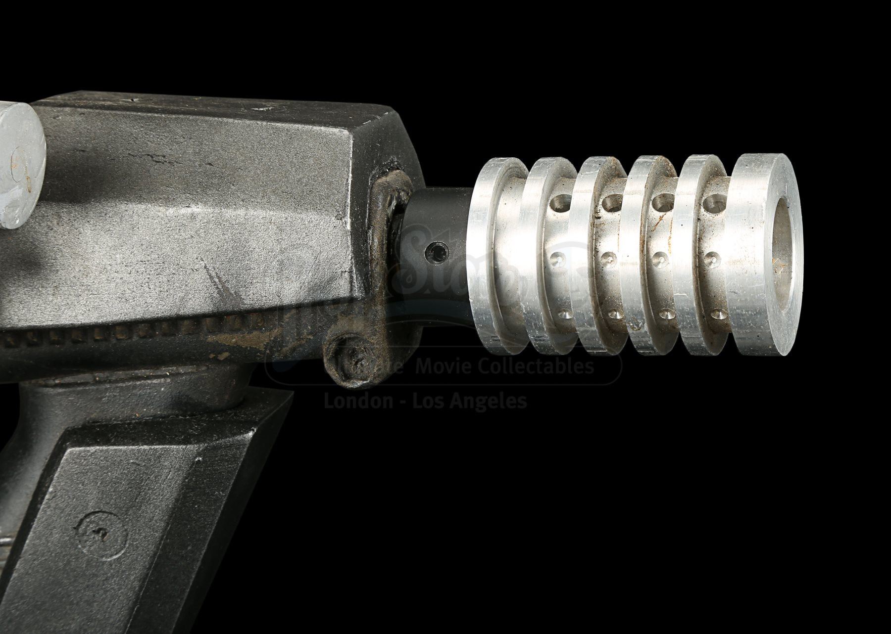 Based on the design of a Calico M961A carbine, the blaster is cast in dense foam with additional components, including a resin faux-scope, grip attachment and metal barrel. The body of the weapon is cast from a Calico submachine gun, with embedded original factory markings on both sides, and is finished in black and faux-silver paint, creating a futuristic appearance. The weapon displays light wear to the paint finish, minor scratches and an orange paint scuff from use during production. Dimensions: 44 cm x 9cm x 25 cm (17 ¼” x 3 ½” x 10”)