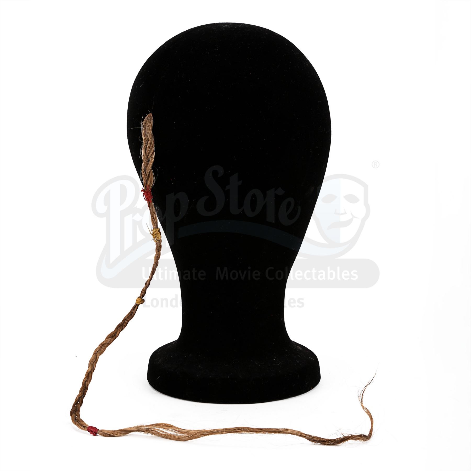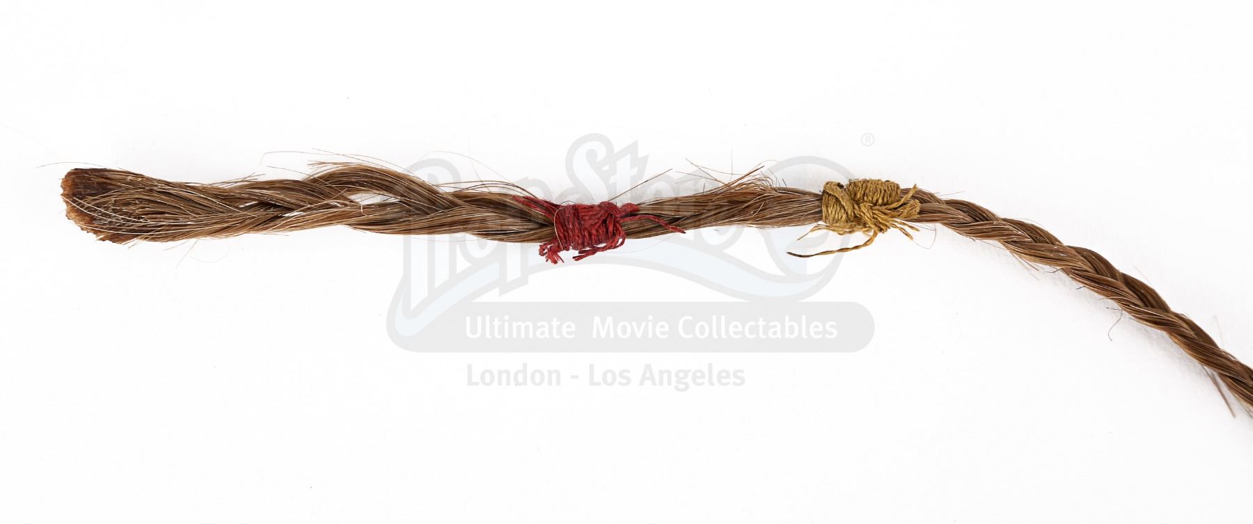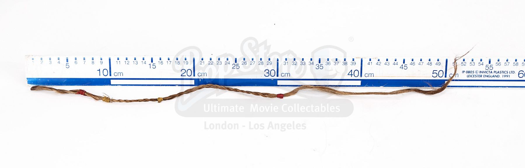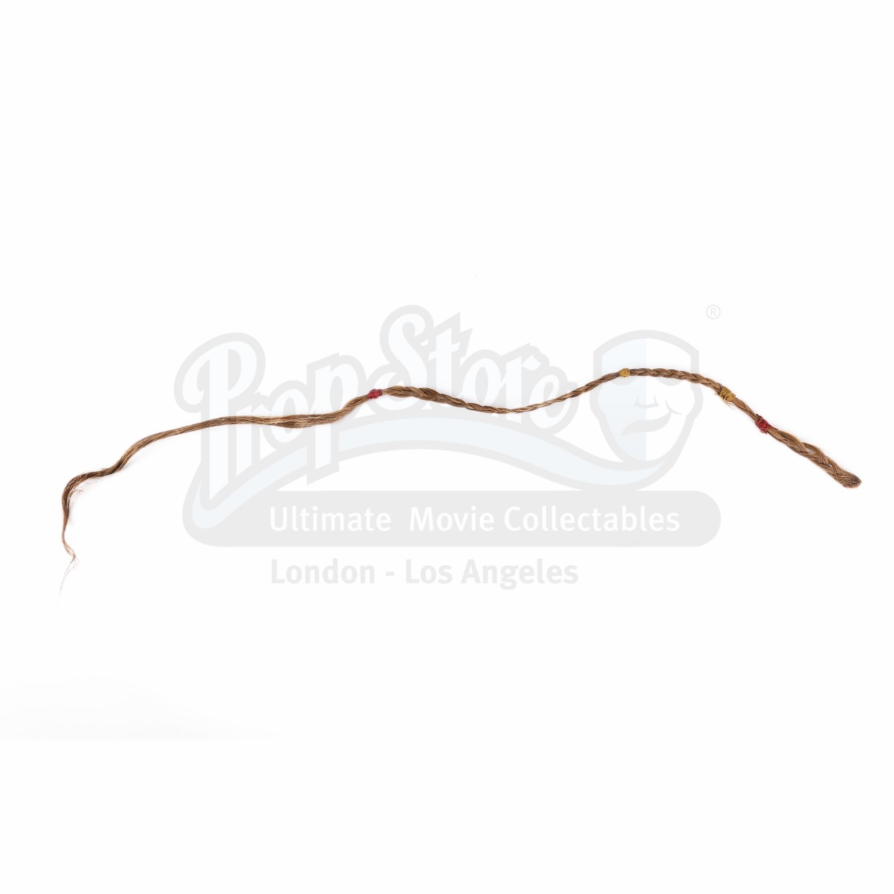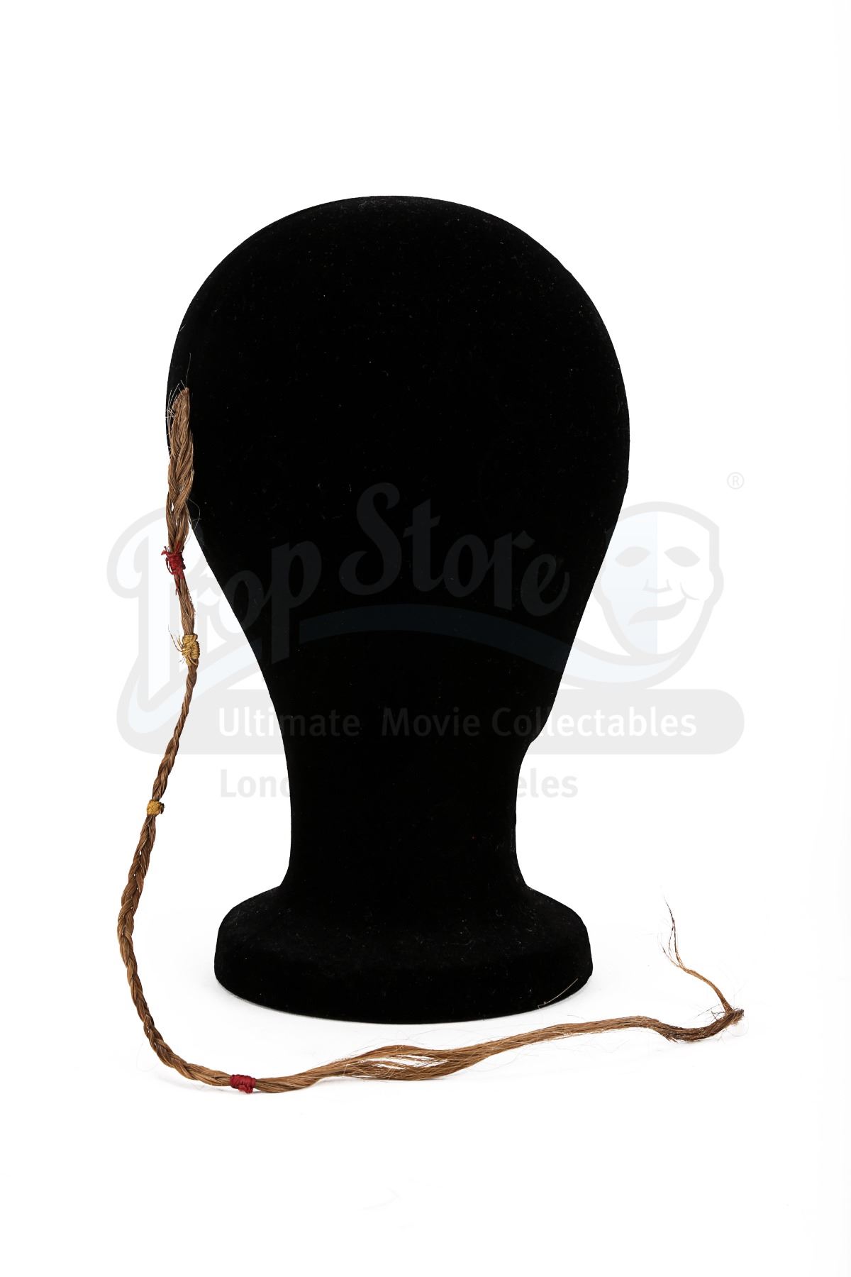 Originally from the collection of hair stylist Sue Love, who worked on several notable productions, including the Star Wars franchise and Withnail & I, the long braid is made from brown synthetic hair and features two bands of red thread and two bands of faux-gold thread. Different coloured bands would be added to these whenever a Padawan progressed in their training. The braid shows signs of production use, including glue remnants at the top, minor wear and loose strands of thread. Dimensions: 56 cm x 1 cm x 0.5 cm (22" x 1/2" x 1/4")