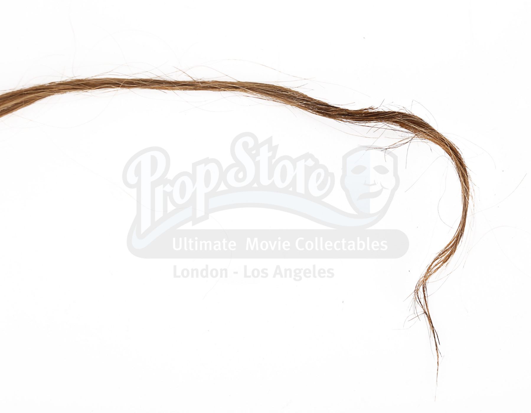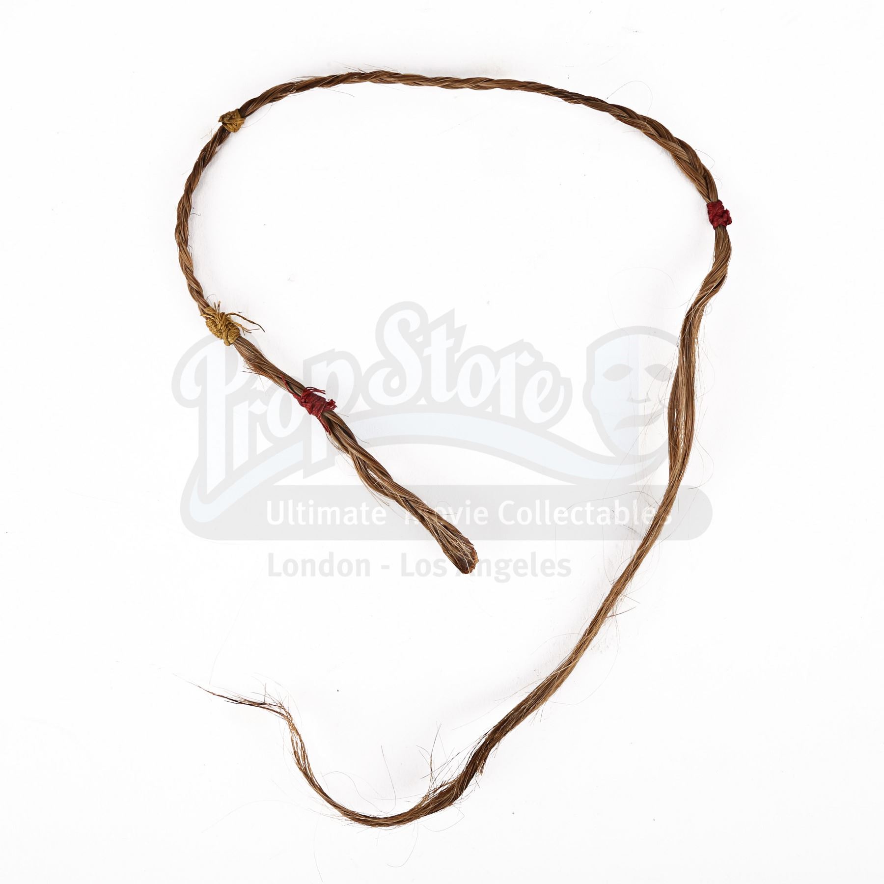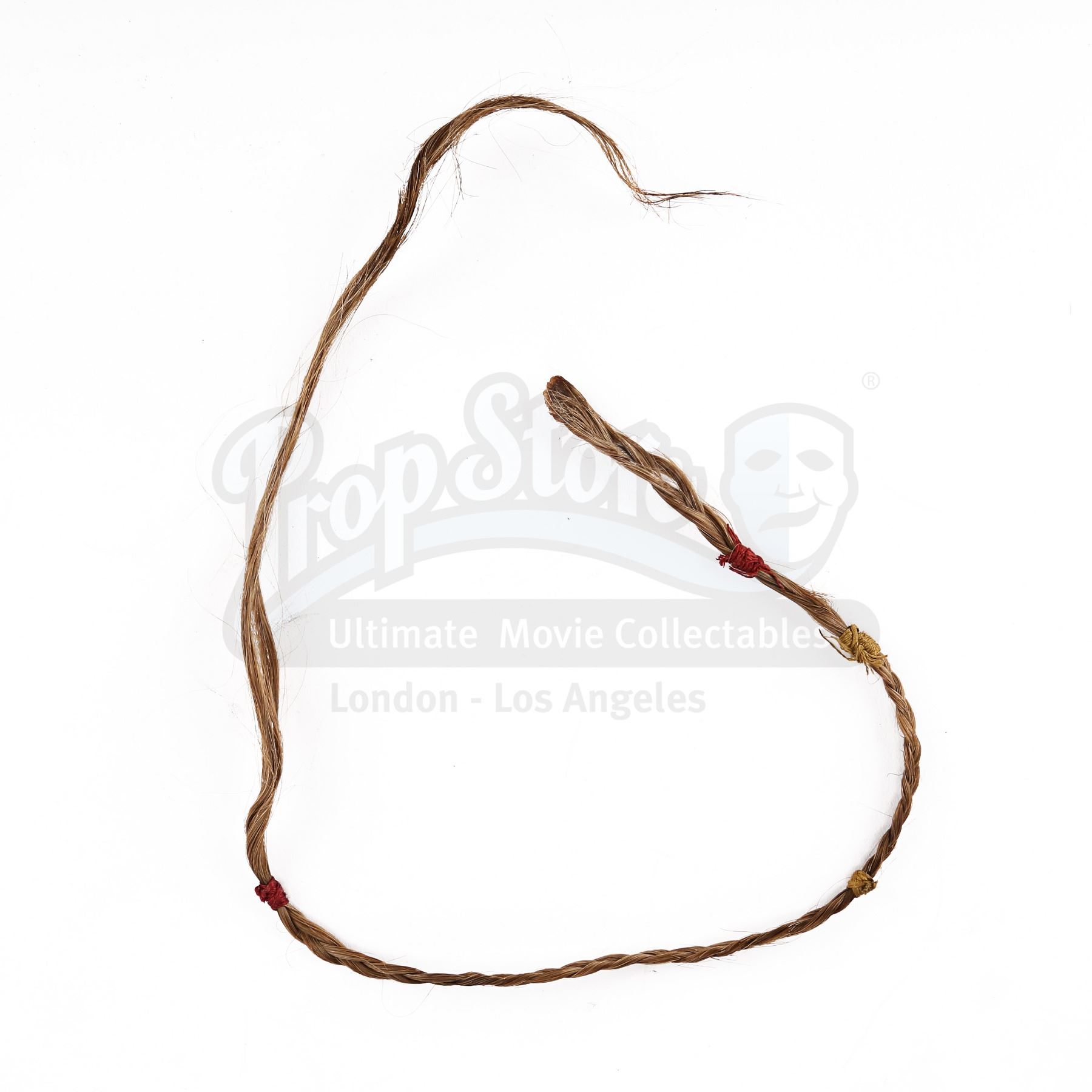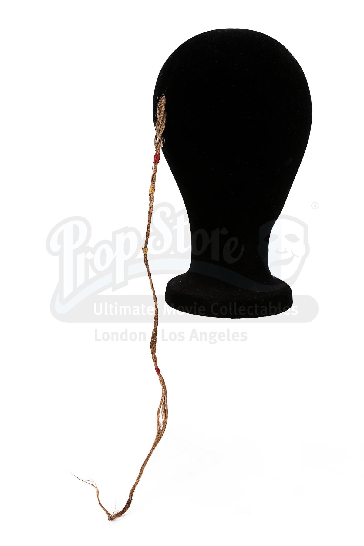 Originally from the collection of hair stylist Sue Love, who worked on several notable productions, including the Star Wars franchise and Withnail & I, the long braid is made from brown synthetic hair and features two bands of red thread and two bands of faux-gold thread. Different coloured bands would be added to these whenever a Padawan progressed in their training. The braid shows signs of production use, including glue remnants at the top, minor wear and loose strands of thread. Dimensions: 56 cm x 1 cm x 0.5 cm (22" x 1/2" x 1/4")