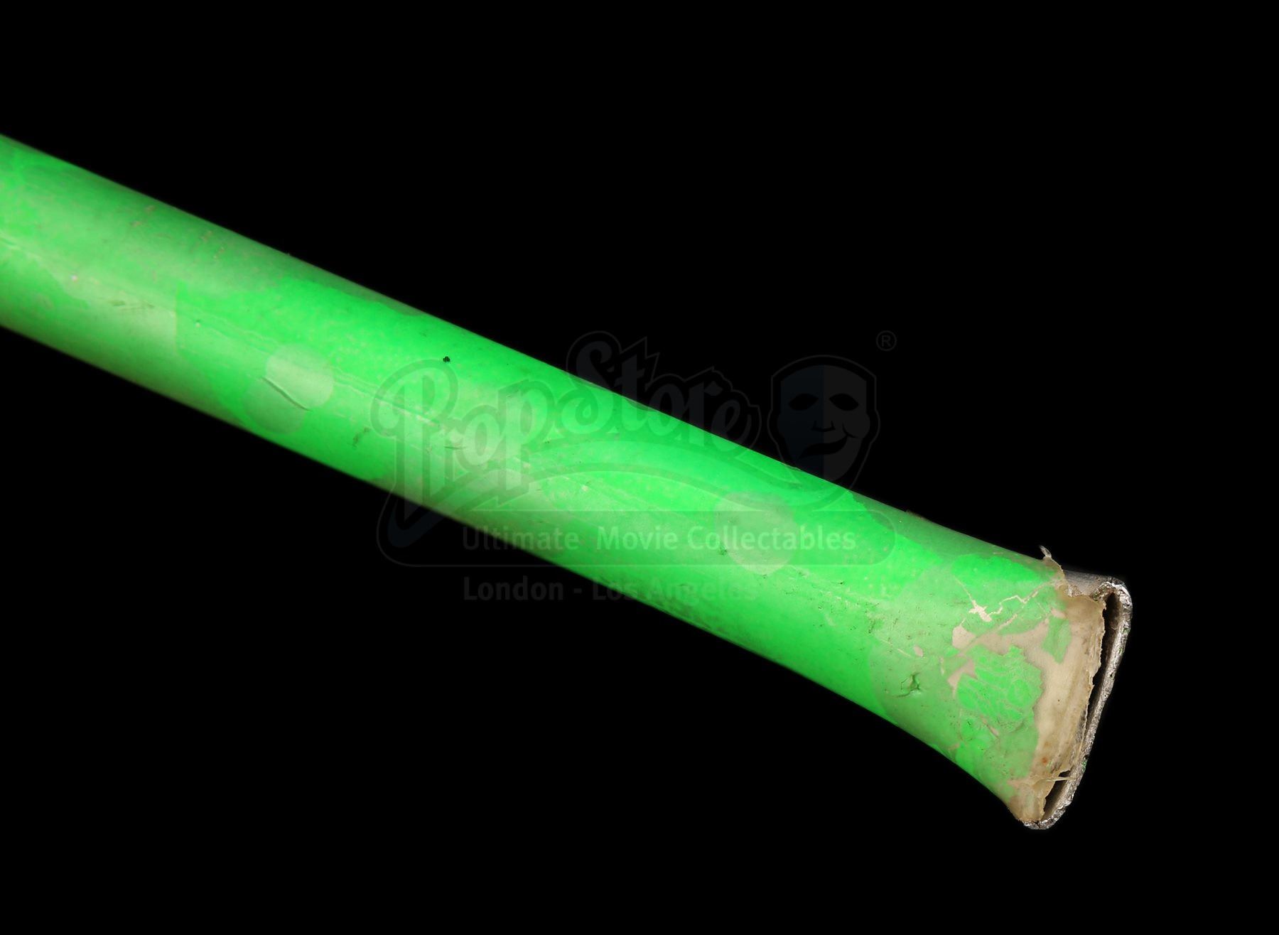 A Ray Park autographed lightsaber blade from George Lucas’ Star Wars: The Phantom Menace. The construction of lightsaber blades evolved throughout the production of the Star Wars prequels, changing from aluminium to carbon fibre for Revenge of the Sith. Hundreds of blades were discarded as they either broke or became bent during battle scenes. The green colour suggests this blade may be attributed to Qui-Gon Jinn (Liam Neeson) or Obi-Wan Kenobi (Ewan McGregor).