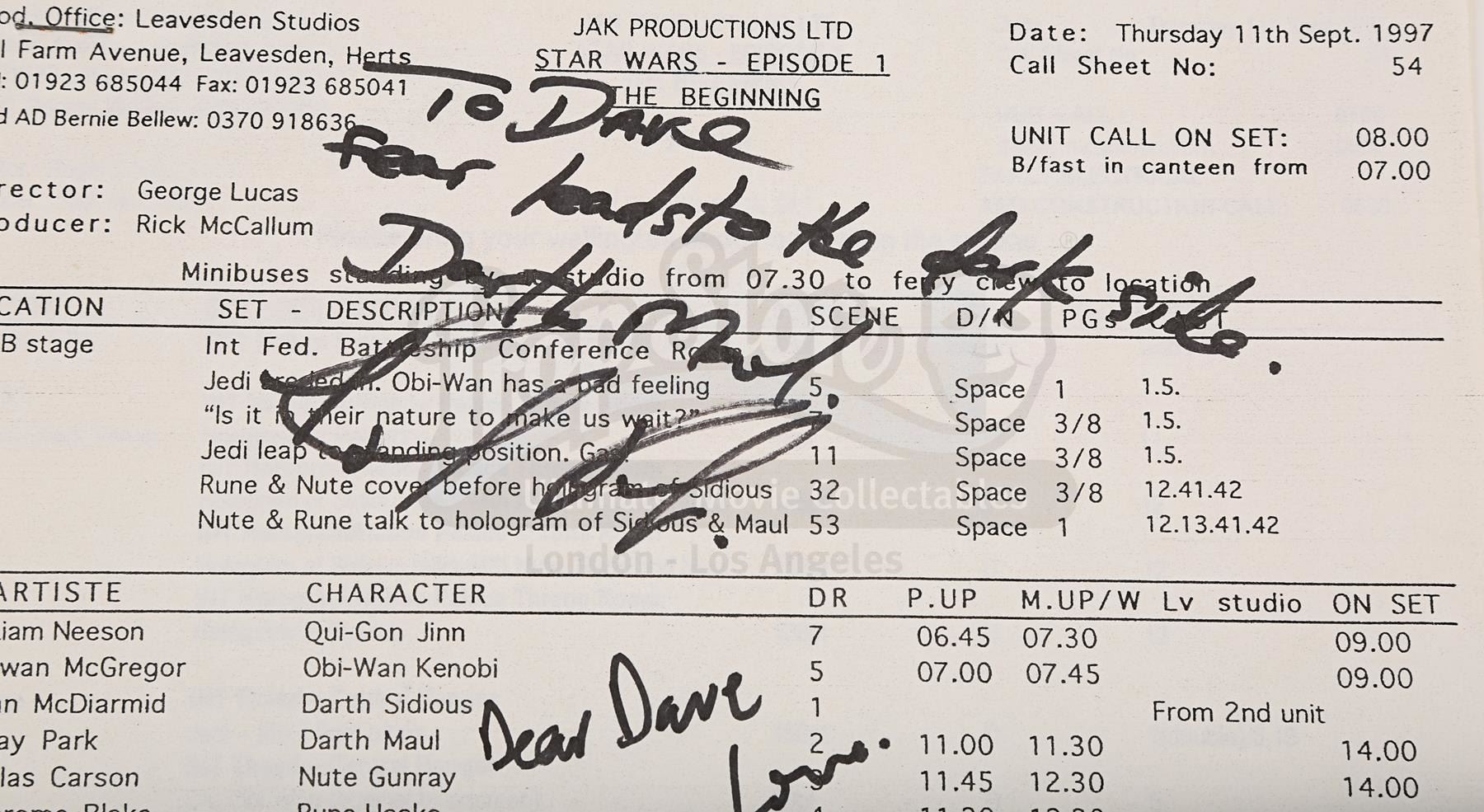 An autographed call sheet from George Lucas' Star Wars: The Phantom Menace. This call sheet was used for the filming of scenes inside the Federation Battleship Conference Room.