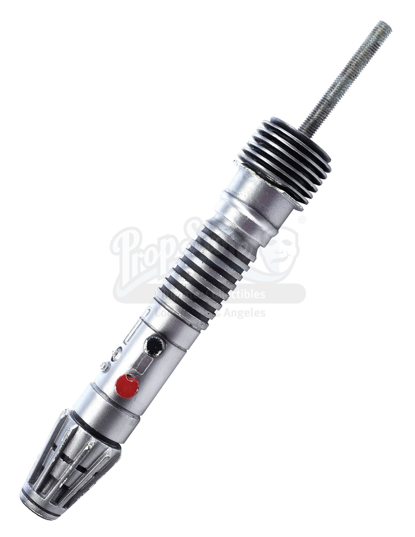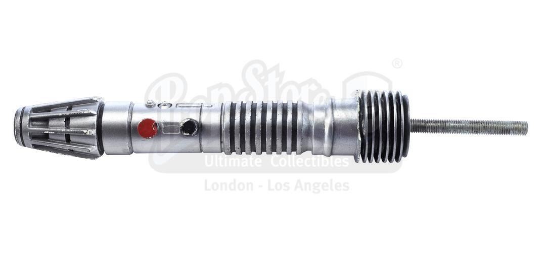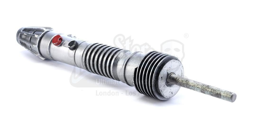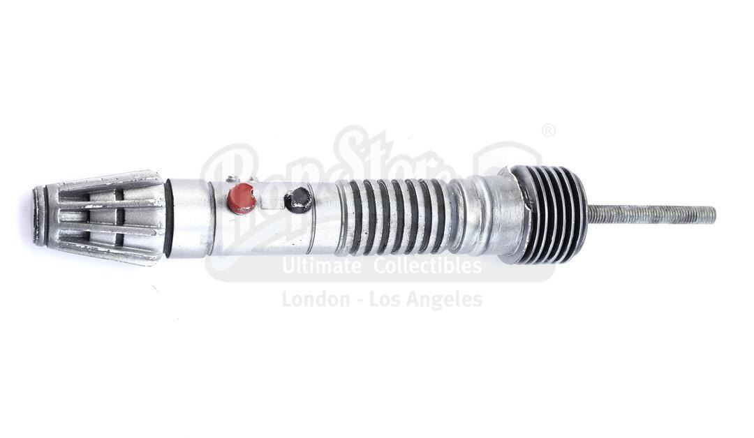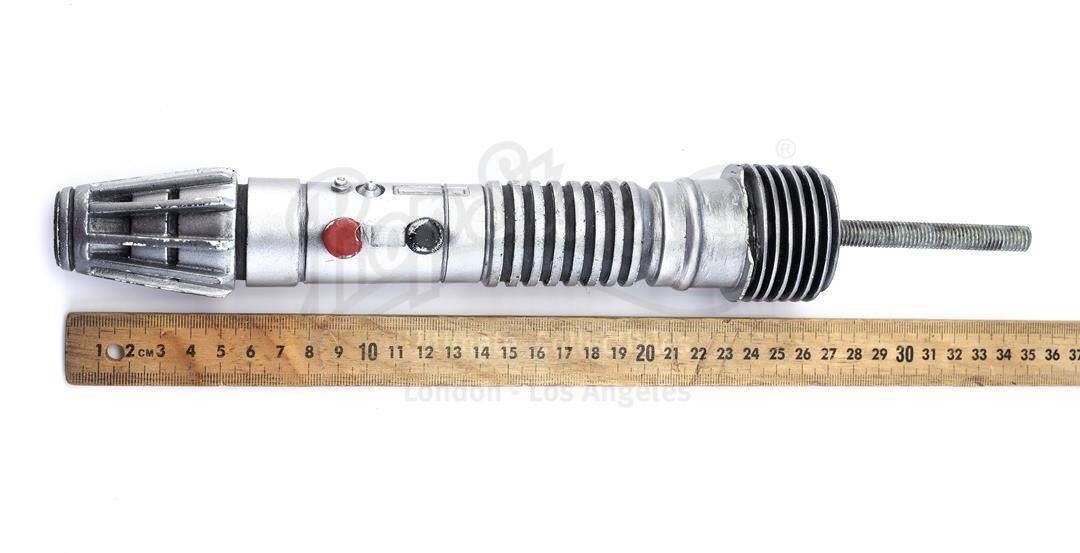 This lightsaber hilt features a resin and metal handgrip with a tapered pommel cap inset with a threaded rod and painted silvertone, black, and red to simulate a metallic finish. The threaded rod allowed for installation of aluminum blades that were used for dueling sequences and replaced frequently as they were damaged on set. The hilt is in good overall condition with some wear from production and handling including small scuffs and cracks in the resin, with one small ridge piece near the blade-end being broken off. Dimensions: 36.25 cm x 7 cm x 5.75 cm (14 1/4" x 2 3/4" x 2 1/4")