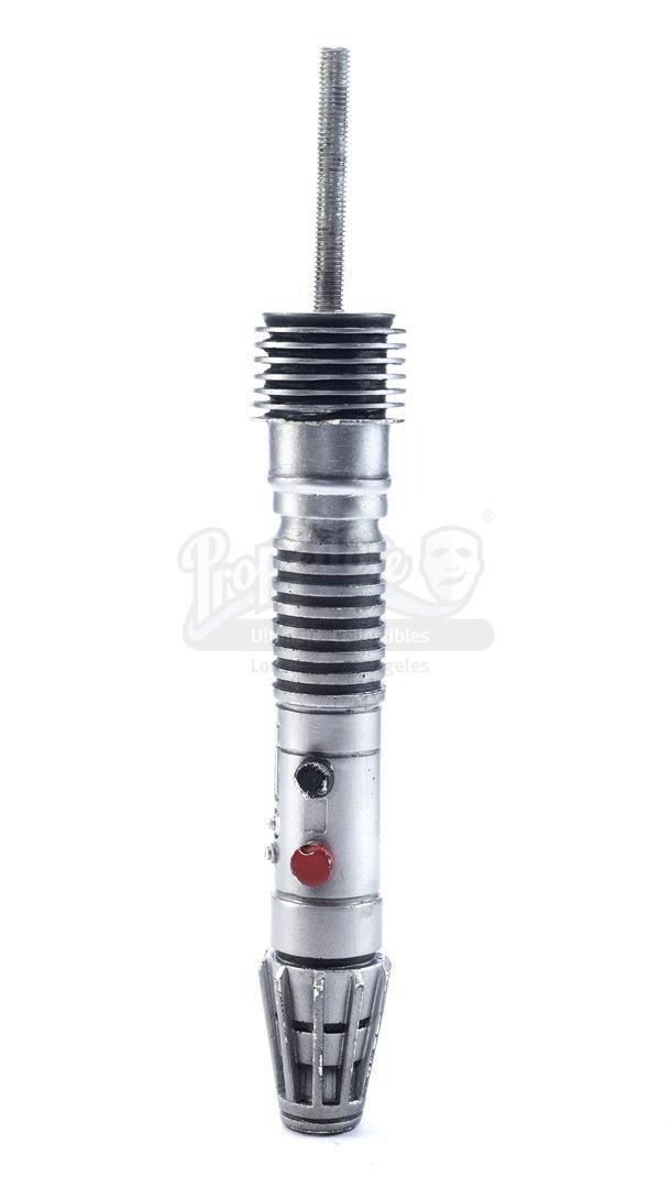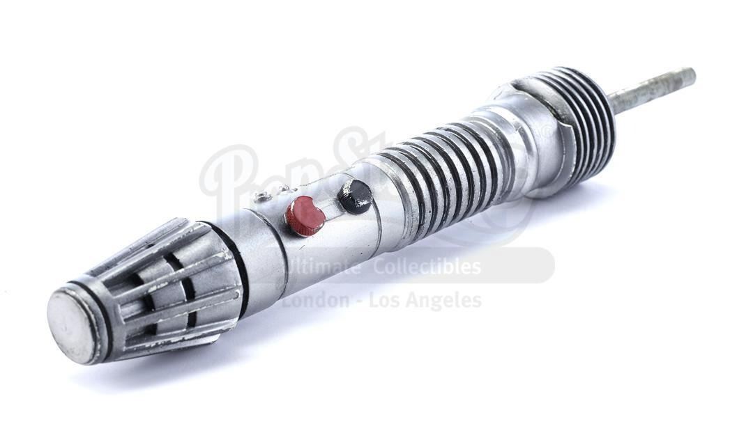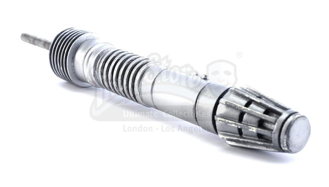 Background Jedi's/Plo Koon's (Matt Sloan) dueling lightsaber hilt from George Lucas' Star Wars: The Phantom Menace and Star Wars: Attack of the Clones. A hilt initially designed and built for The Phantom Menace, the lightsaber became specifically associated with Plo Koon, a Kel Dor Jedi Master on the Jedi High Council, in the subsequent films.