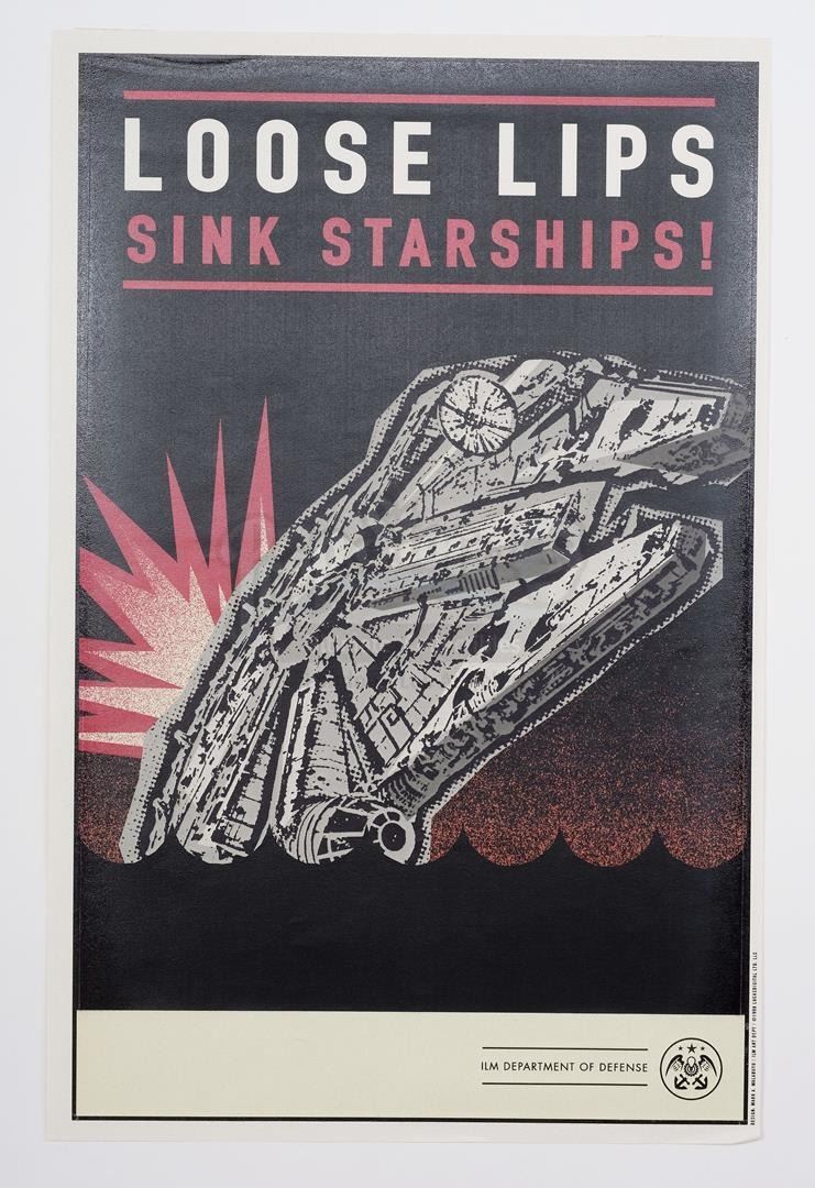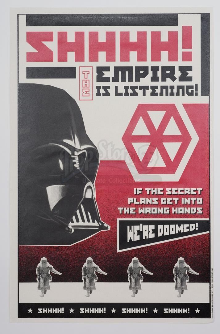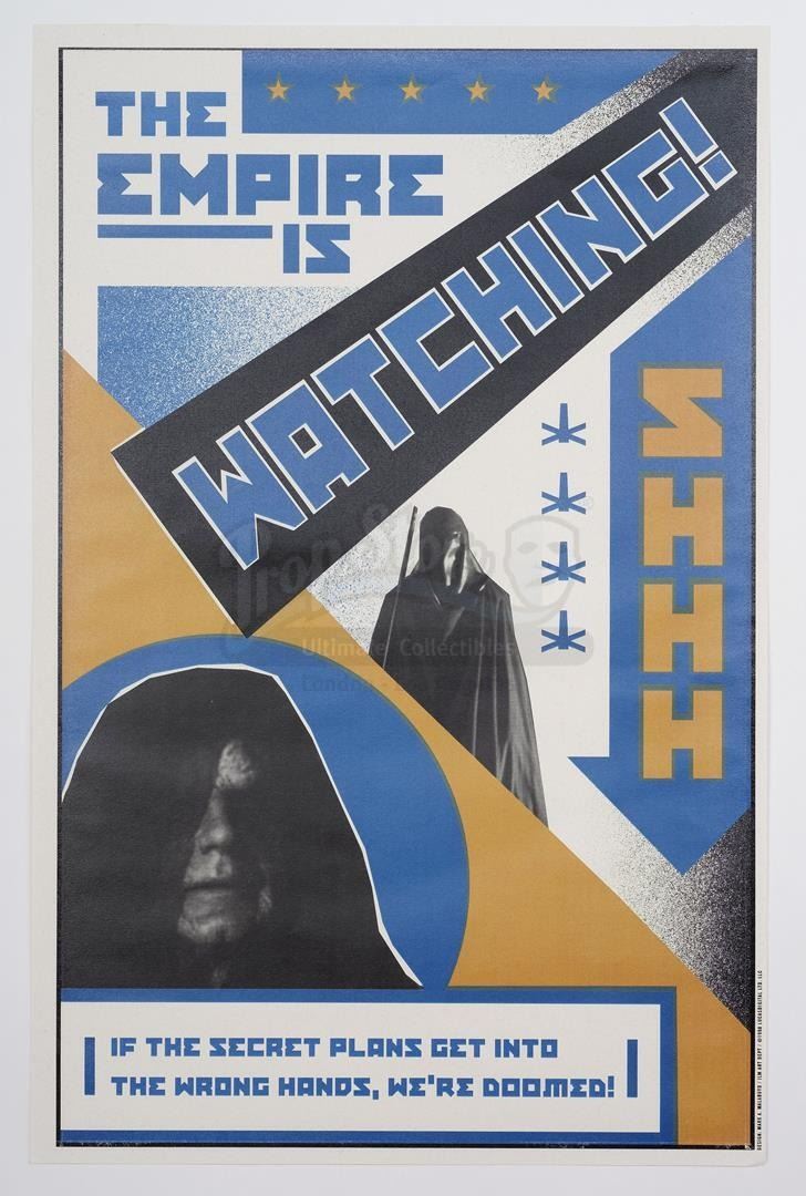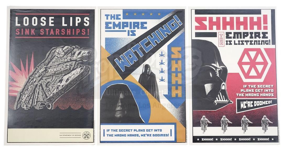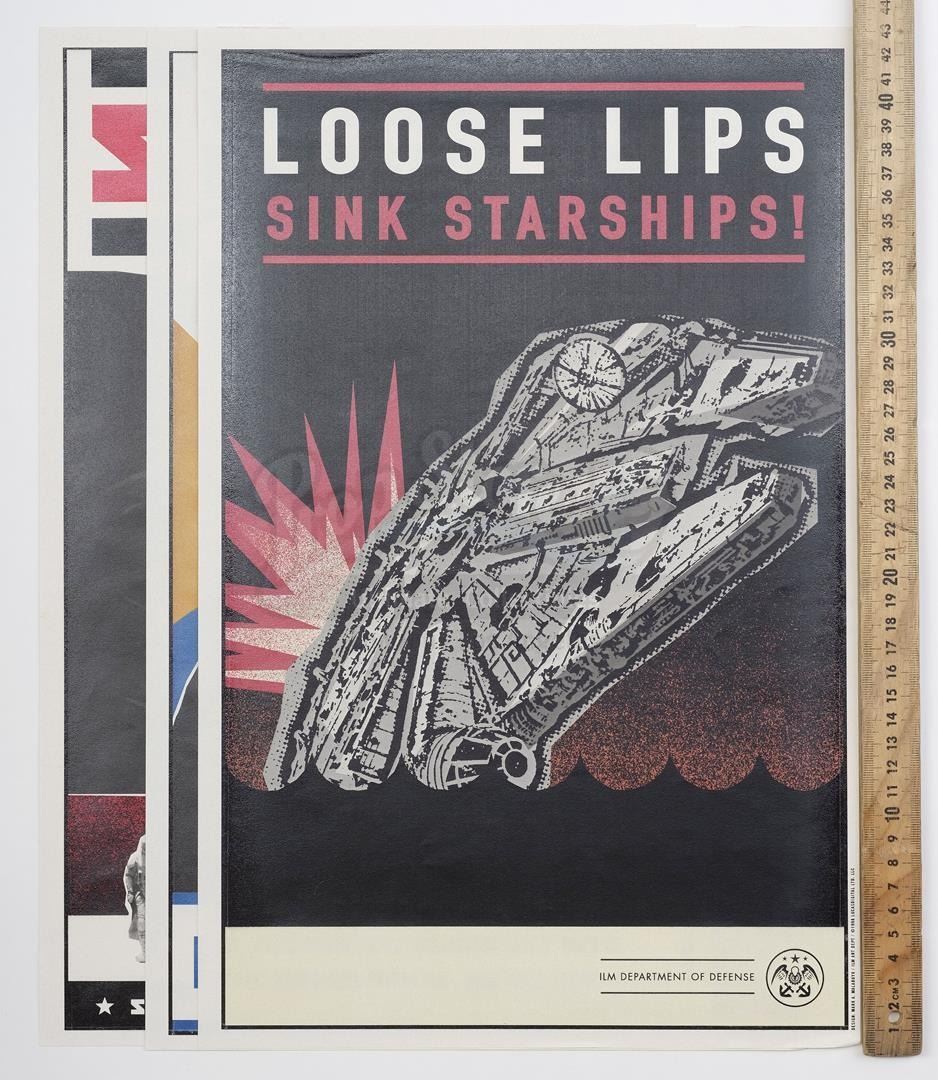 Designed by Industrial Light & Magic (ILM) artist Mark Malabuyo, these three posters are colour-printed on semi-gloss poster paper with three distinctive designs: "SHHHH! The Empire is Listening!" with images of Darth Vader (David Prowse) and Snow Troopers; "Loose Lips Sink Starships!" with an image of the Millenium Falcon; and "The Empire is Watching!" with an image of the Emperor (Ian McDiarmid) and one of his personal guards. The posters are in excellent overall condition with minimal wear from use and age. Dimensions (each): 49 cm x 38.25 cm x 2.5 (19 1/4" x 15 1/2" x 1")