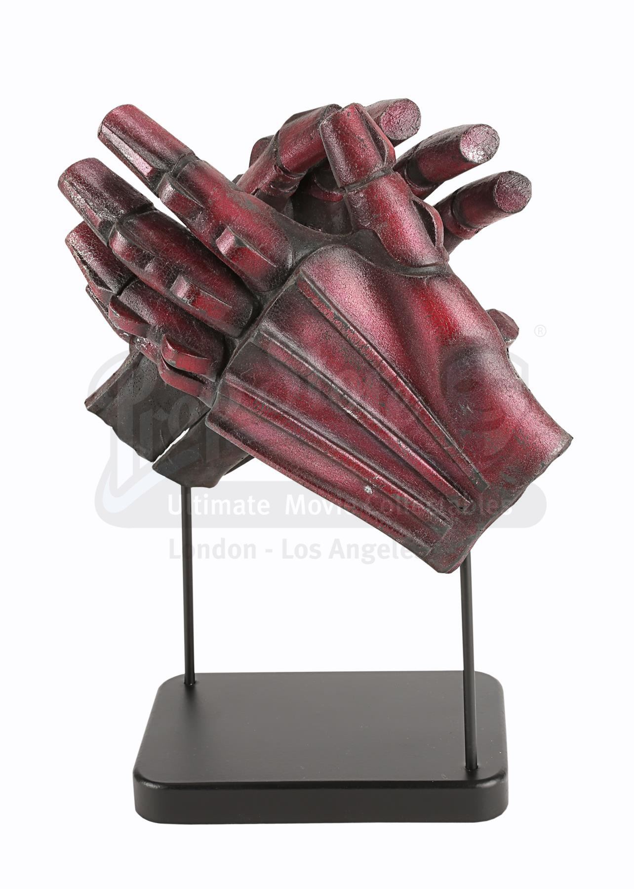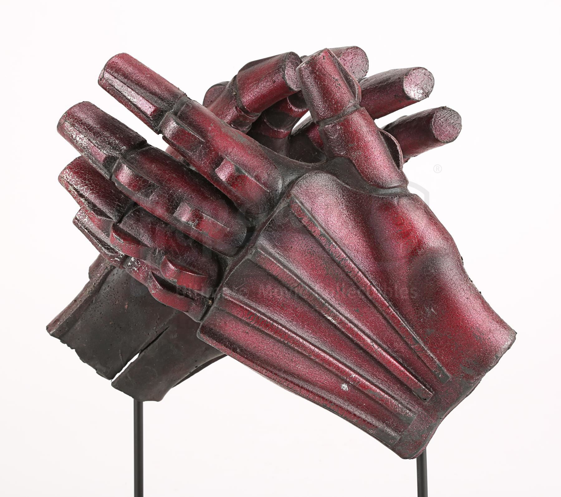 Cast in rubber, these one-piece gloves feature ridges along the back, squared fingertips, and raised wiring detailing which runs along each fingers. The hands have been finished in metallic red paint with darker shades added for definition. Various-sized square €˜contact' detailing adorns both palms and the wrists feature intentional cuts to allow easy fitting and removal. Presented on a black custom-made display stand, the hands exhibit paint wear, remnants of dirt from production use and minor flaking. Dimensions (displayed): 12 cm x 22 cm x 32 cm (4 3/4" x 9 3/4" x 13 3/4")