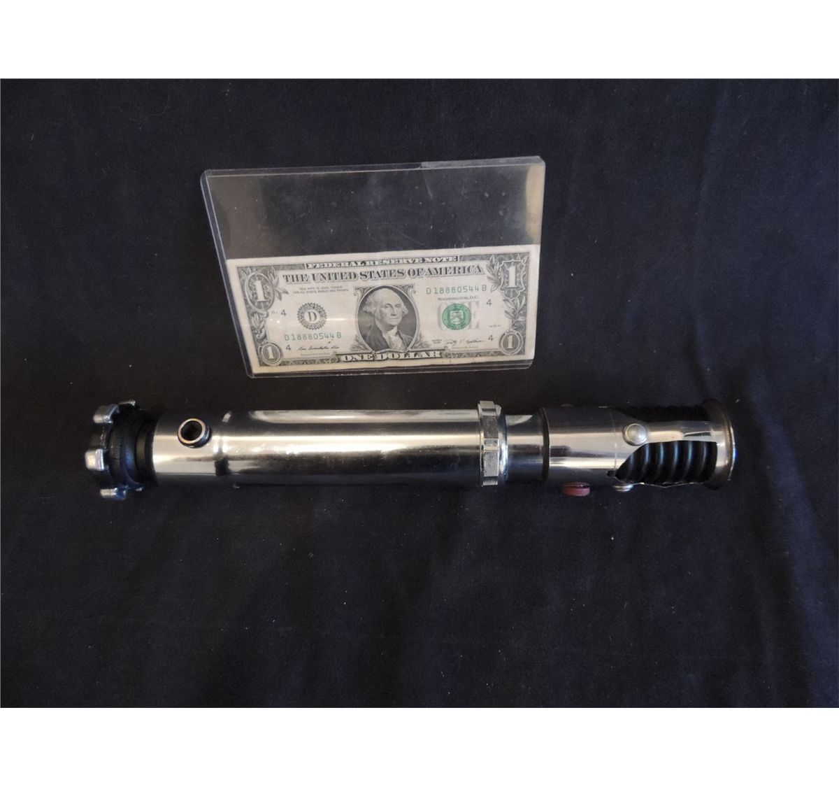 This is a OOAK though 2 of 2 incomplete Prototype OBI-WAN KENOBI Lightsaber from the original production of STAR WARS EPISODE 1, THE PHANTOM MENACE! All this is missing is that the hilt pummel. The only difference I see from the Screen Used version is the hilt does not protrude as far out. This one has a crystal though broken in the end to reflect light. An attempt at more functionality.