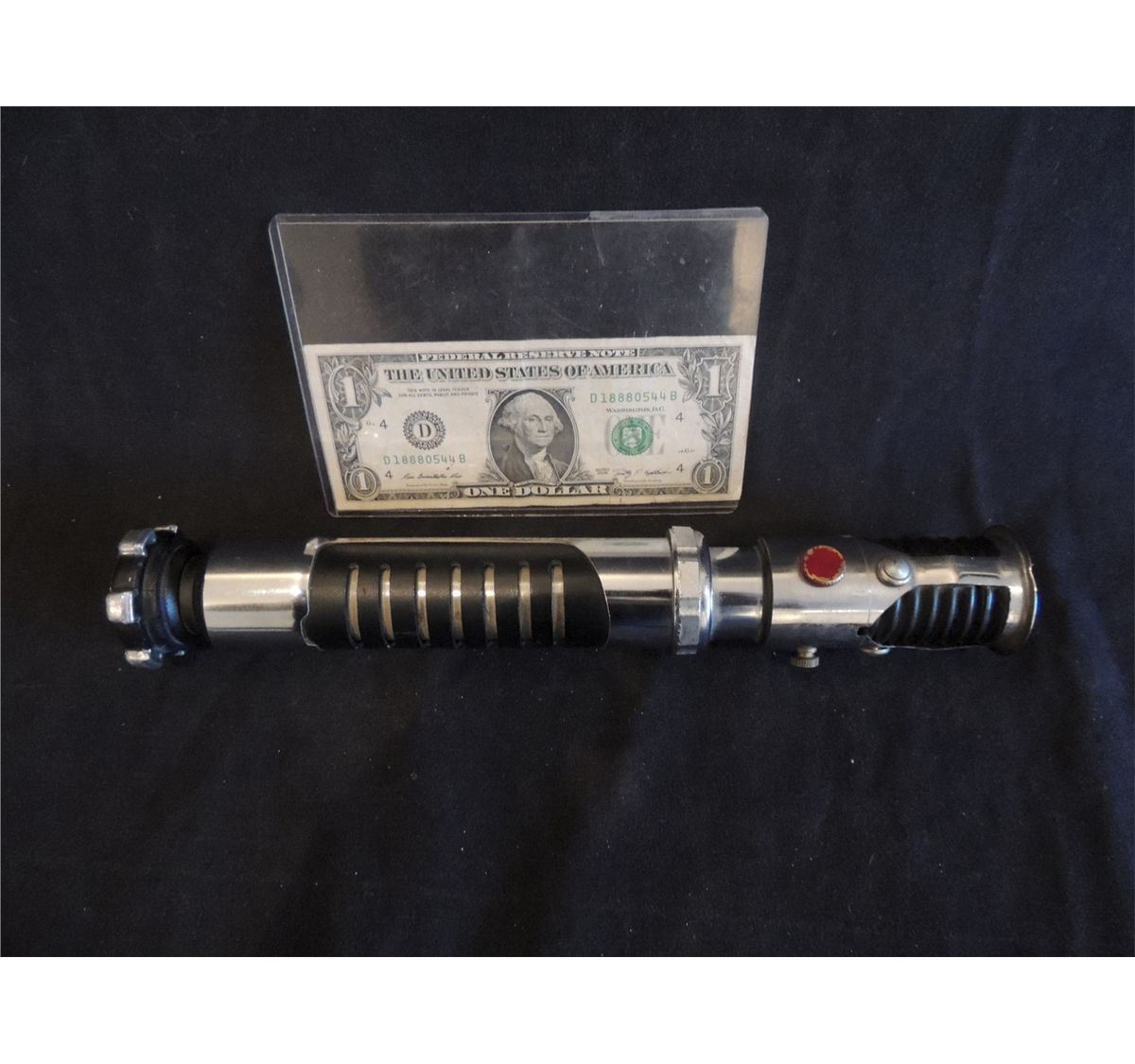 This is a OOAK though 2 of 2 incomplete Prototype OBI-WAN KENOBI Lightsaber from the original production of STAR WARS EPISODE 1, THE PHANTOM MENACE! All this is missing is that the hilt pummel. The only difference I see from the Screen Used version is the hilt does not protrude as far out. This one has a crystal though broken in the end to reflect light. An attempt at more functionality.