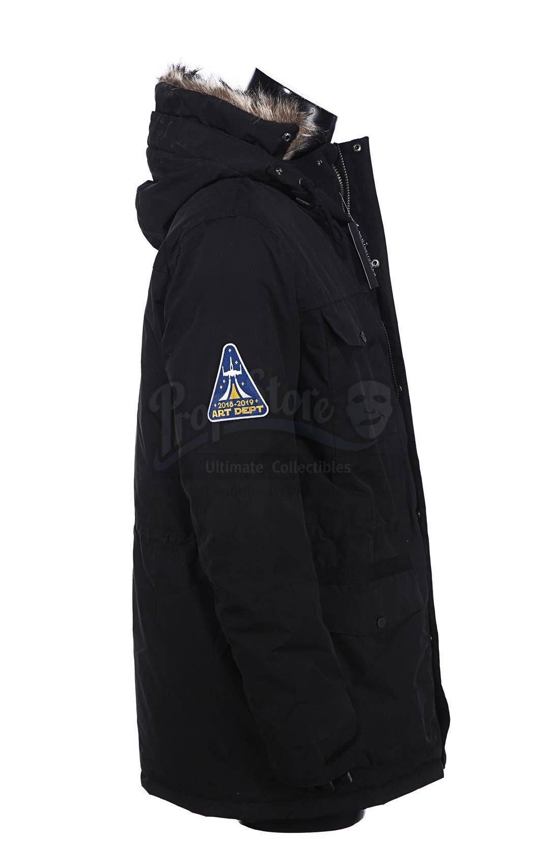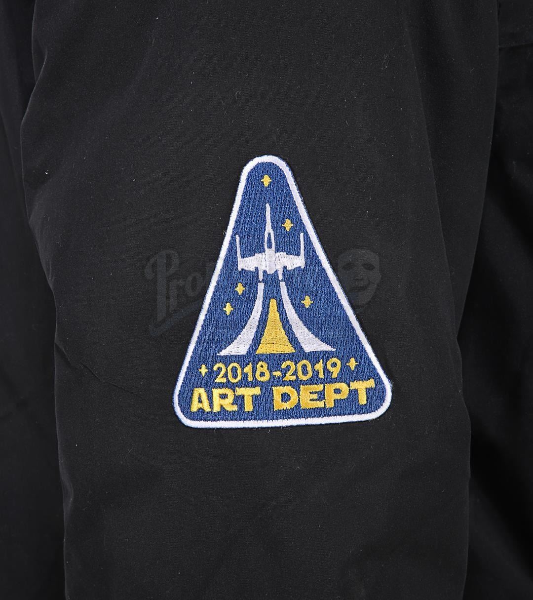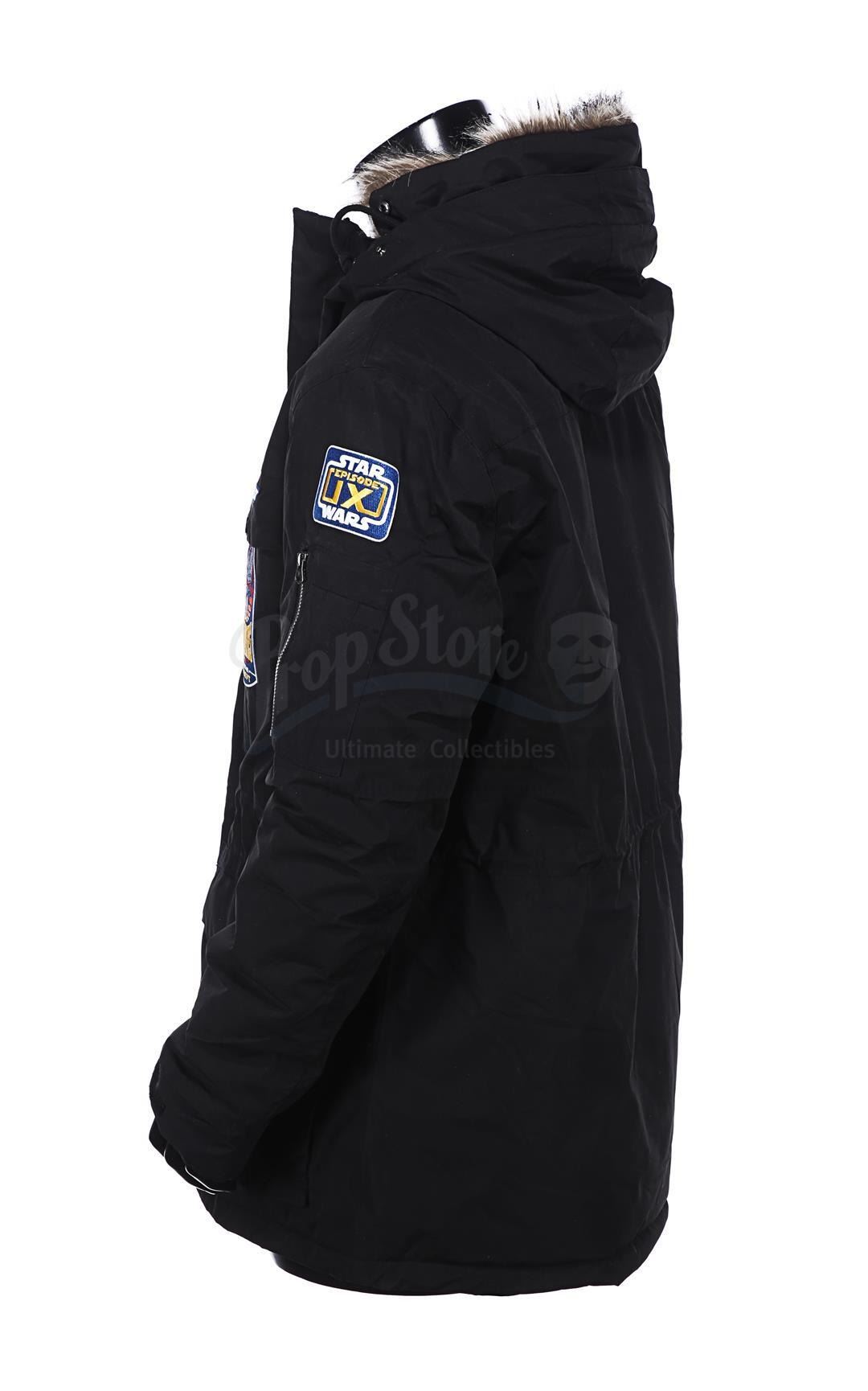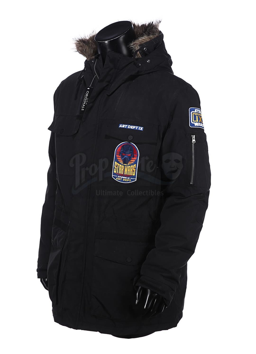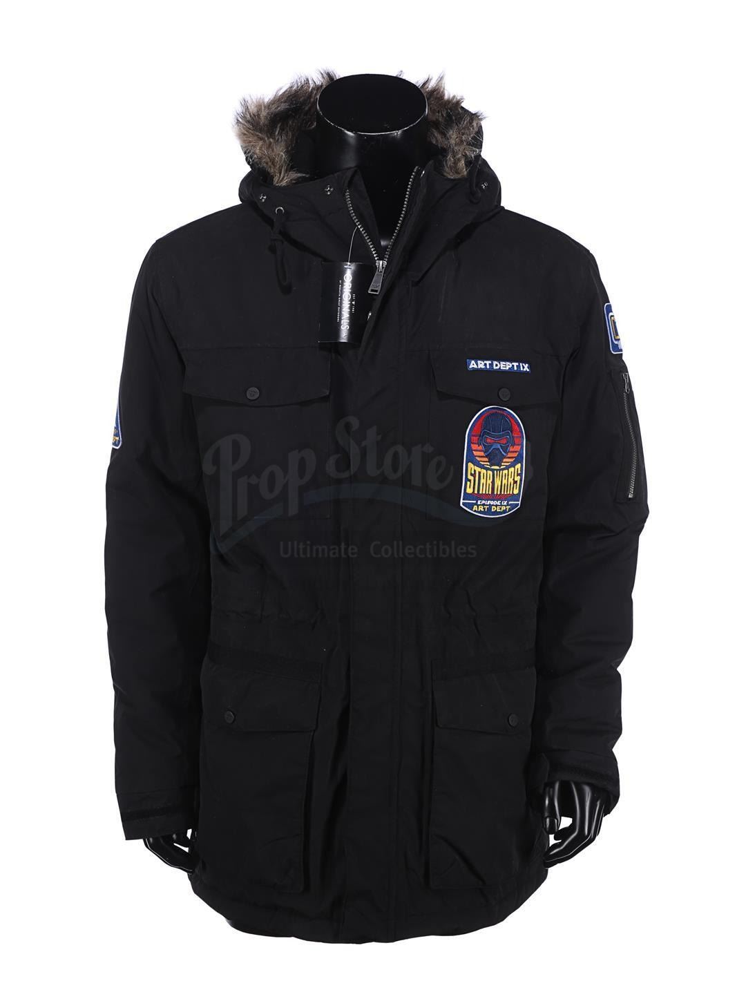 An art department crew parka from the production of J.J. Abrams' Star Wars: The Rise of Skywalker. The Regatta Great Outdoors parka jacket is made of black polyester, with a zip fastening down the front and a faux-fur trim on the hood. The left breast pocket is decorated with a large embroidered patch featuring an emblem of Kylo Ren's helmet with the text "Star Wars, Episode IX, Art Dept" positioned below. Two different coloured patches are sewn to the top of the sleeves, and the jacket is labelled as a size large. The parka comes with its original tag attached to the zip, and displays some minor marks on the front.