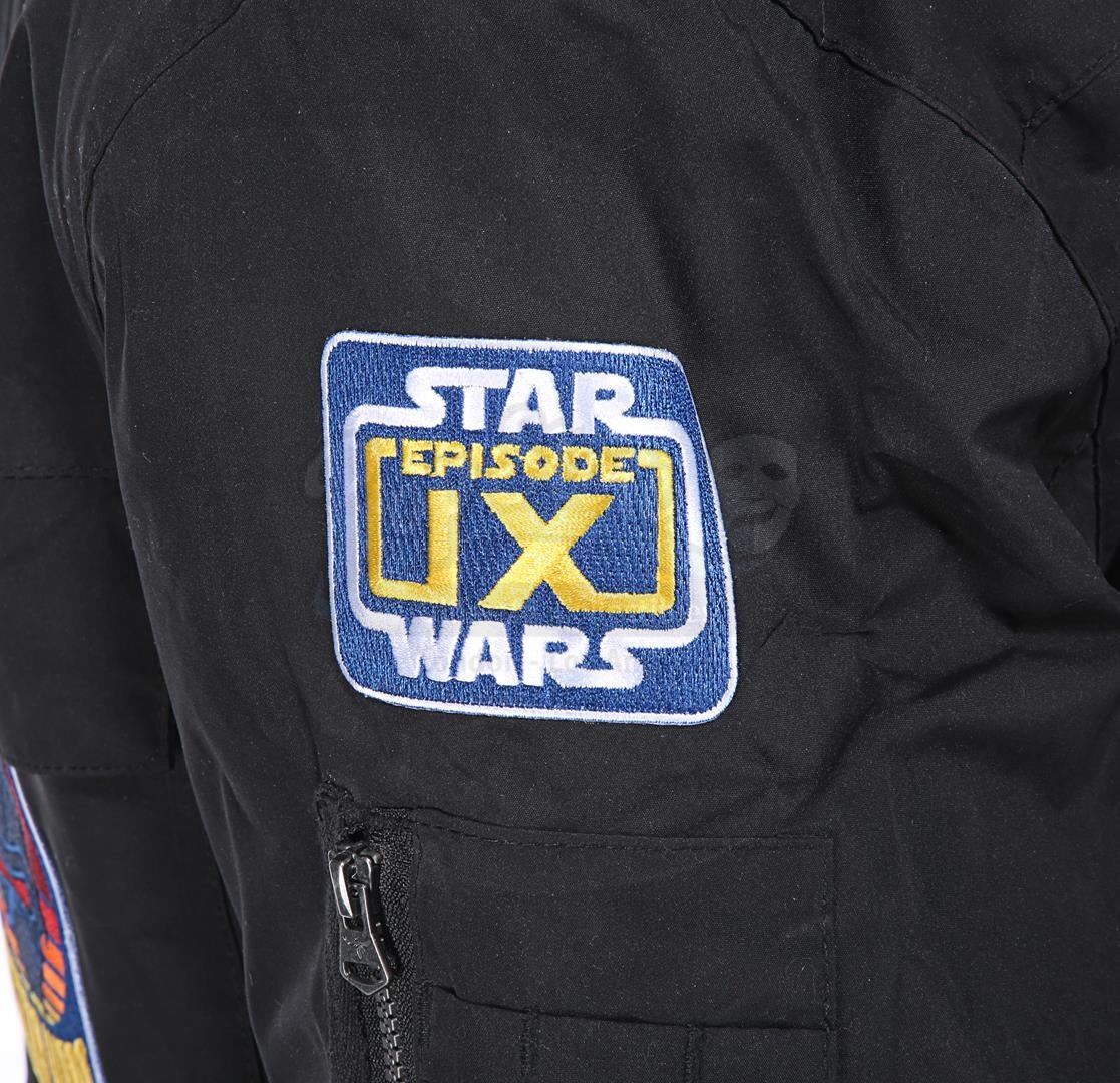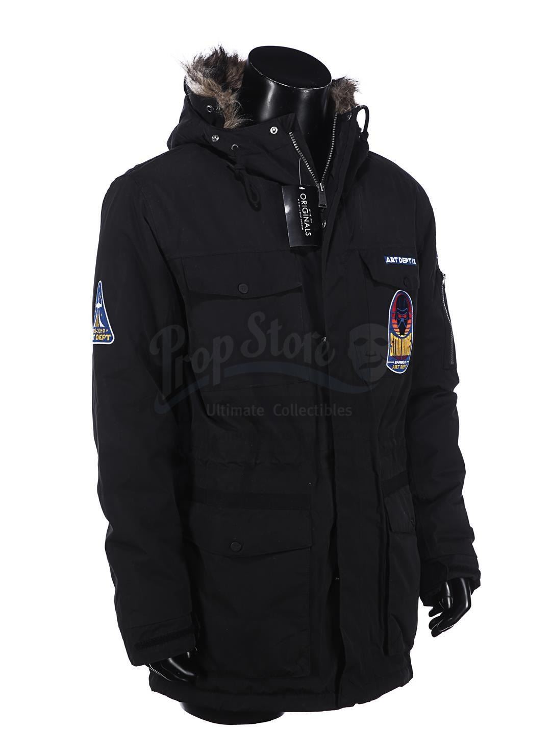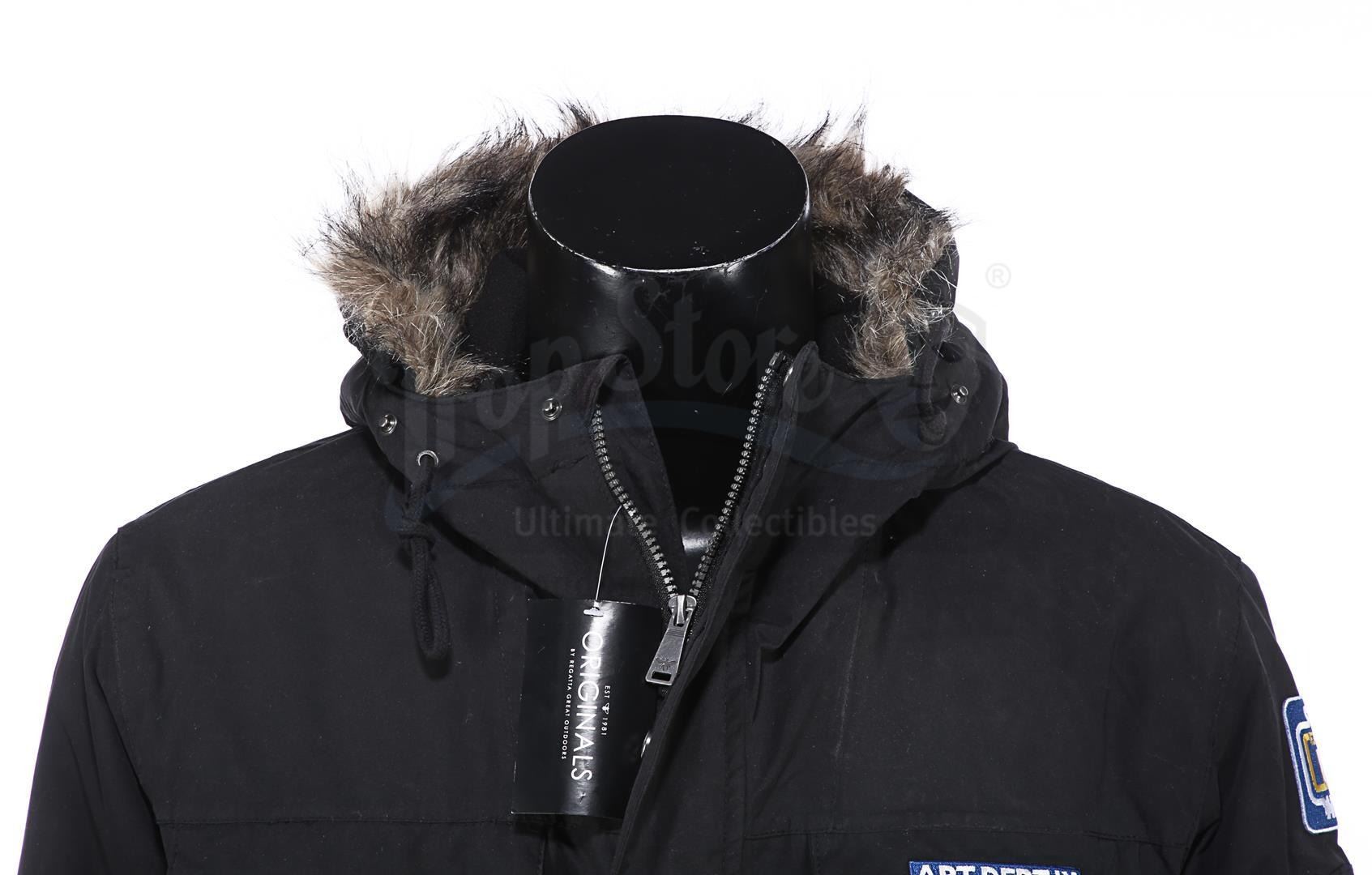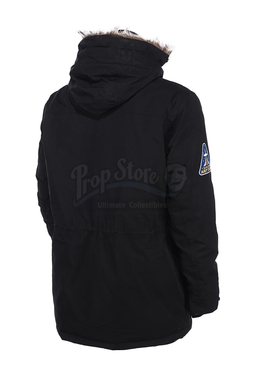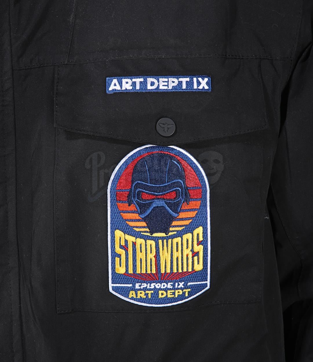 An art department crew parka from the production of J.J. Abrams' Star Wars: The Rise of Skywalker. The Regatta Great Outdoors parka jacket is made of black polyester, with a zip fastening down the front and a faux-fur trim on the hood. The left breast pocket is decorated with a large embroidered patch featuring an emblem of Kylo Ren's helmet with the text "Star Wars, Episode IX, Art Dept" positioned below. Two different coloured patches are sewn to the top of the sleeves, and the jacket is labelled as a size large. The parka comes with its original tag attached to the zip, and displays some minor marks on the front.