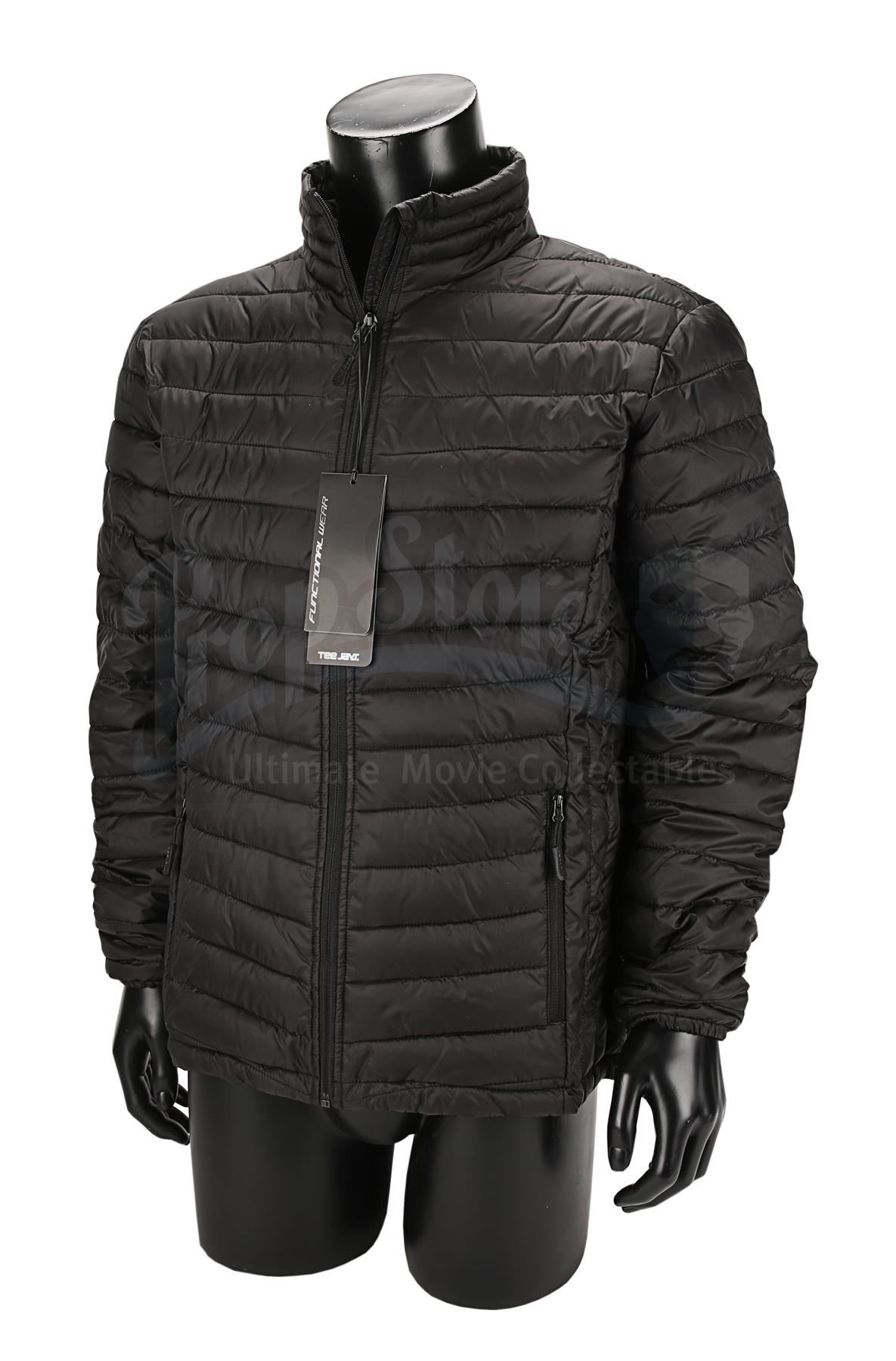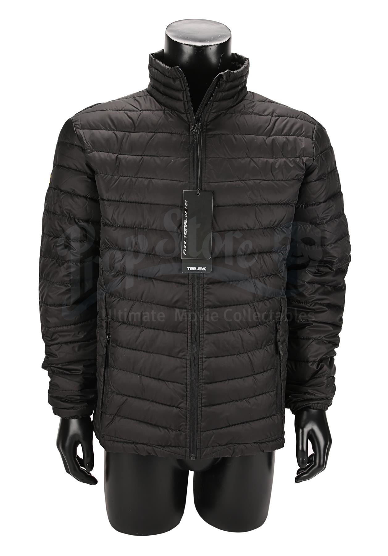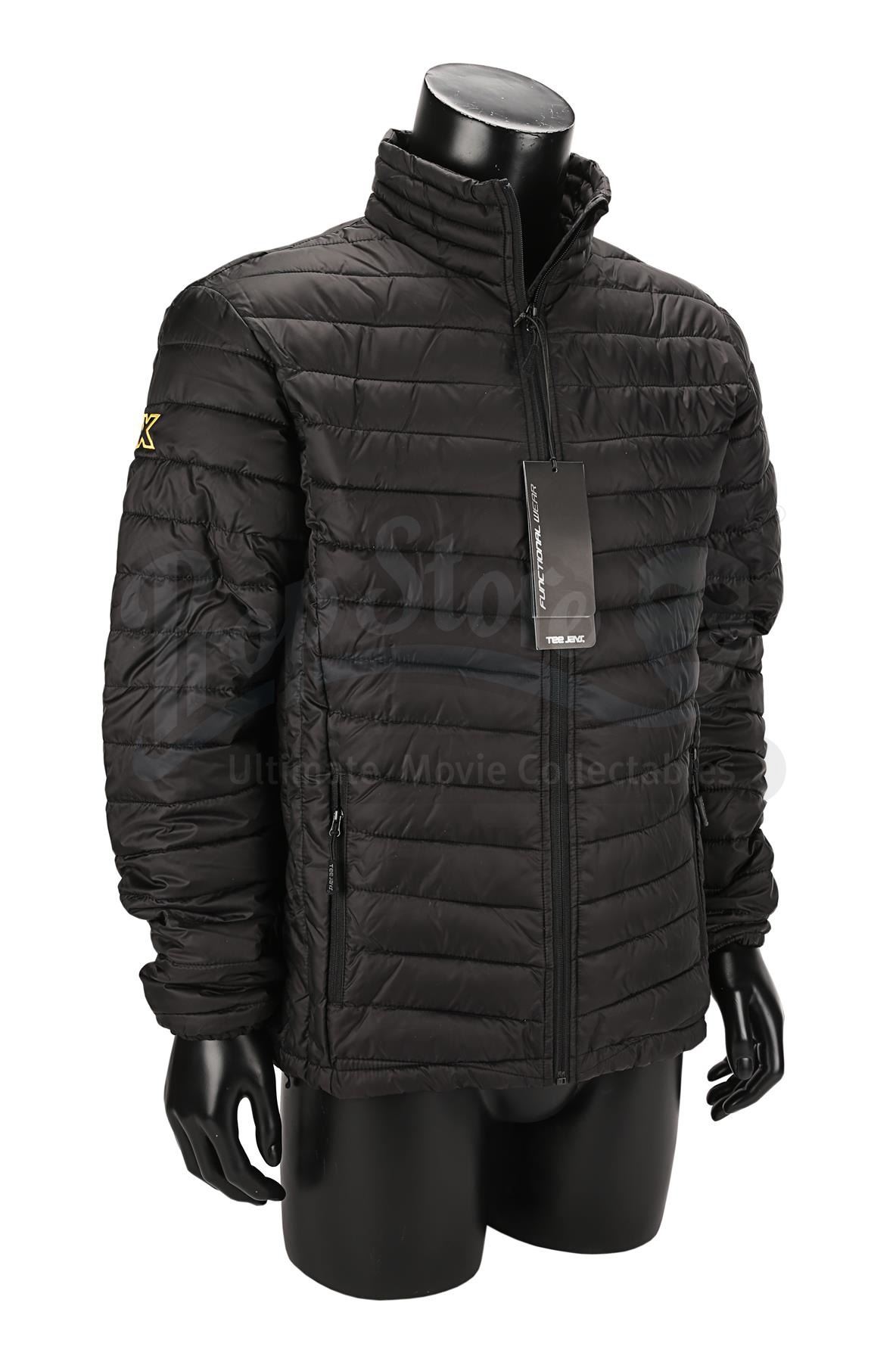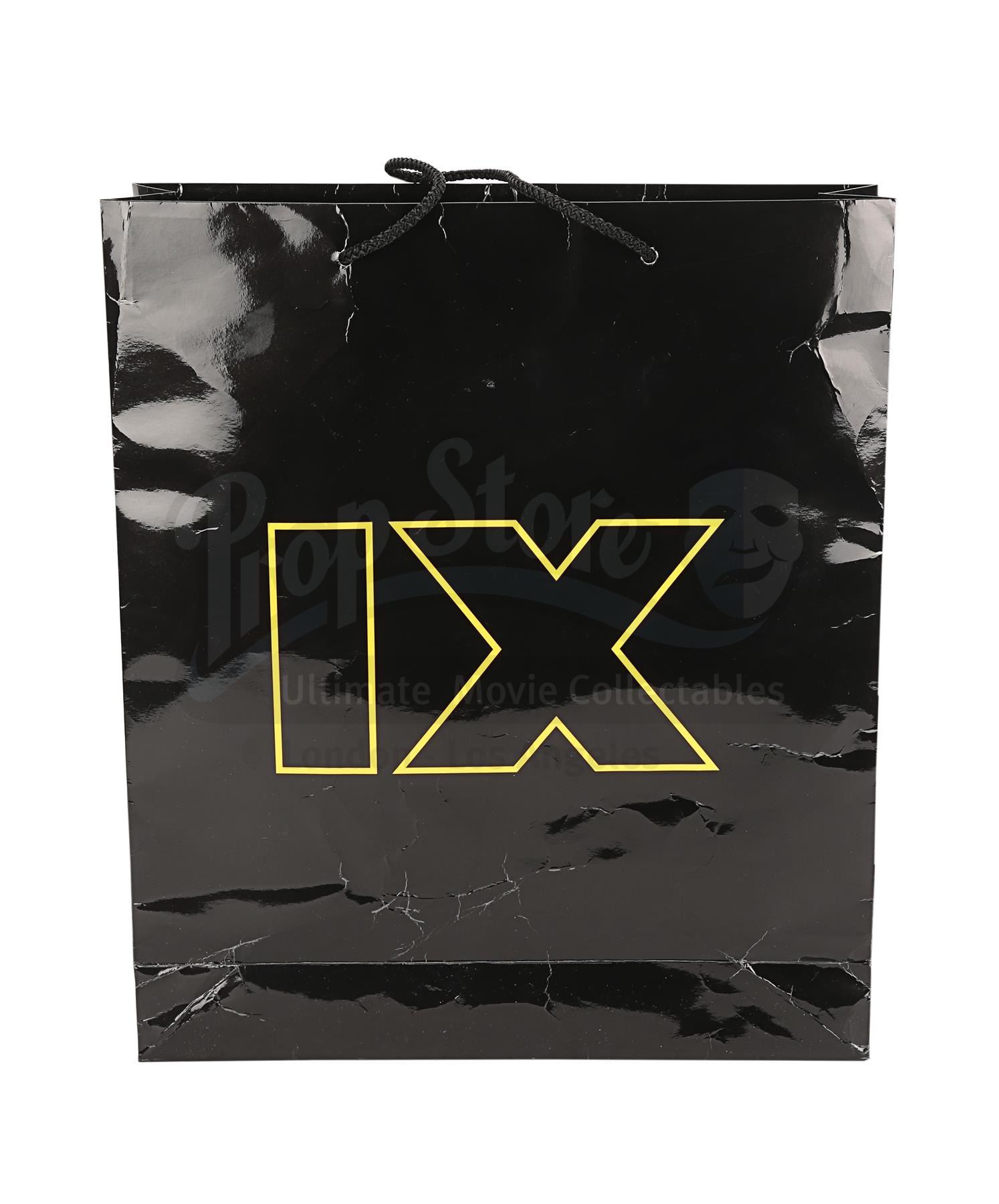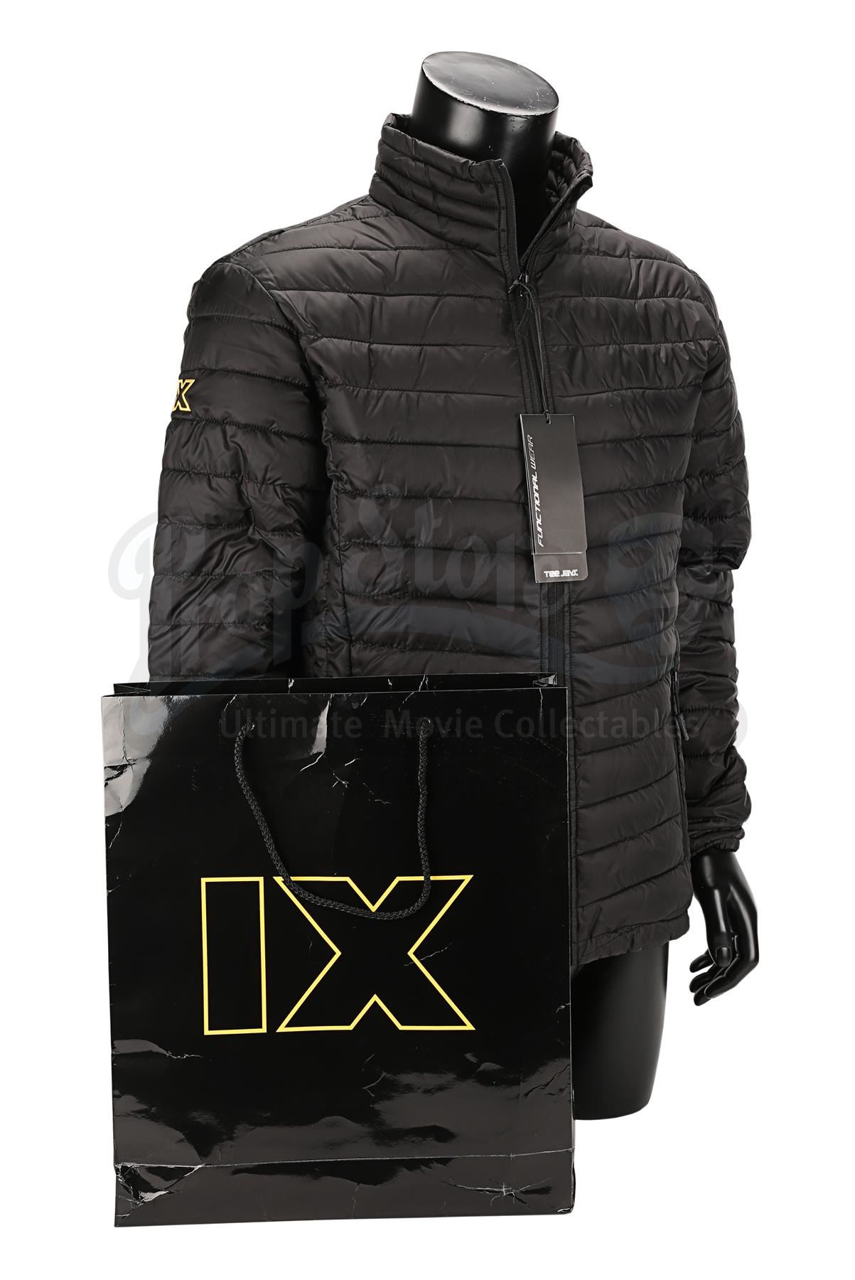 A crew jacket, gift bag and thank-you note from J.J. Abrams' Star Wars: The Rise of Skywalker. The black Tee Jays puffer jacket is made from polyester and features a zip fastening down the front, with the right sleeve displaying the numerals "IX" embroidered in yellow. Labelled as a size large, the jacket comes with its original tags attached to the zip. Made from black paper, the gift bag features "IX" printed in yellow on both sides and a pair of black string handles.
