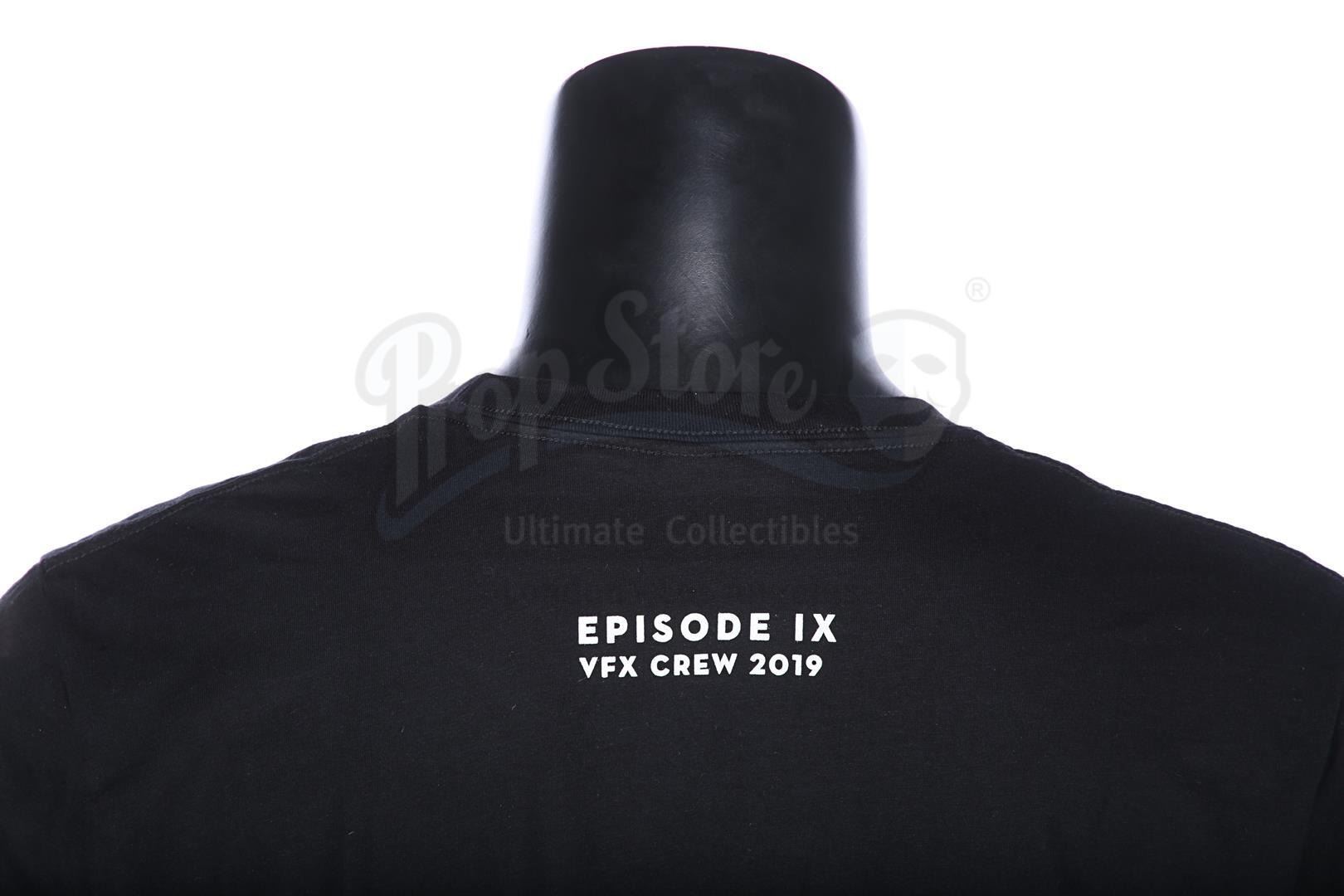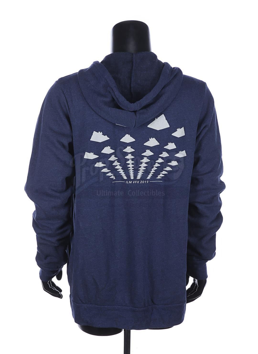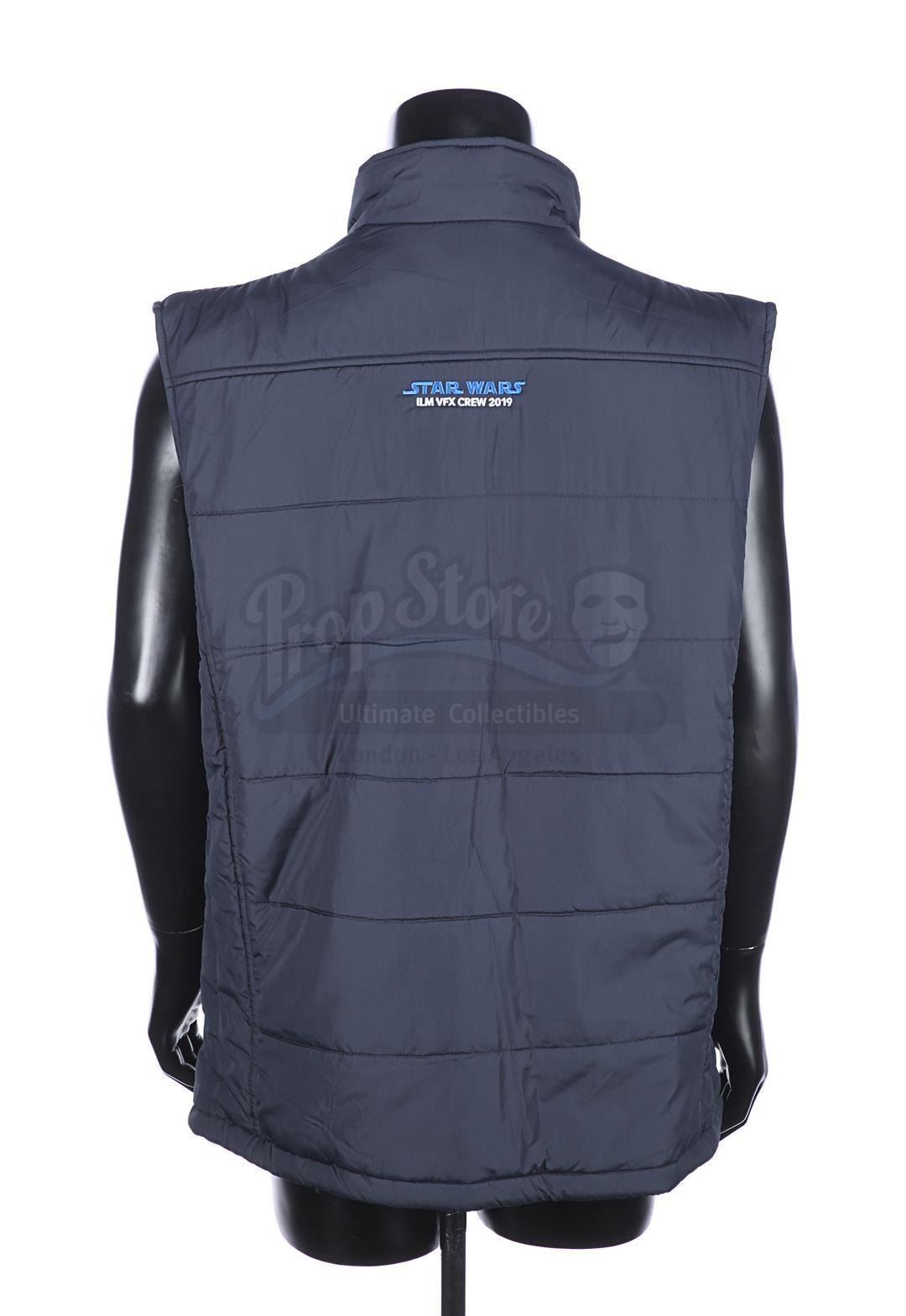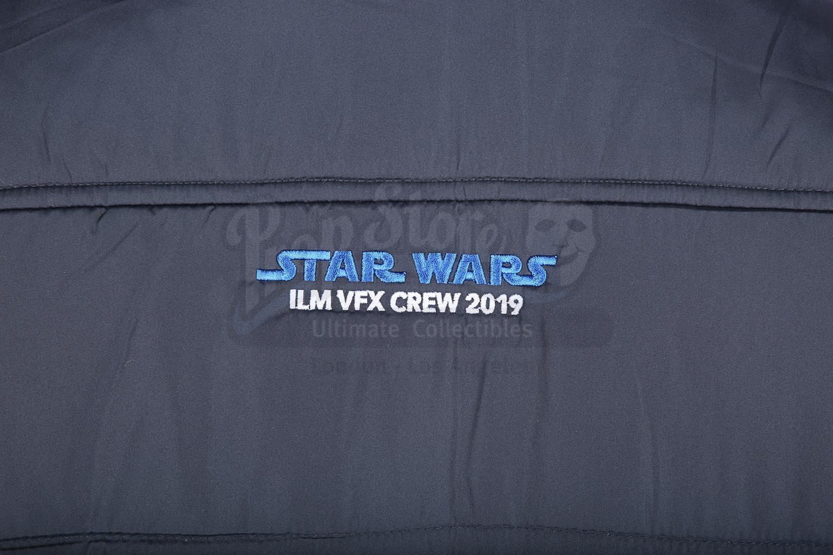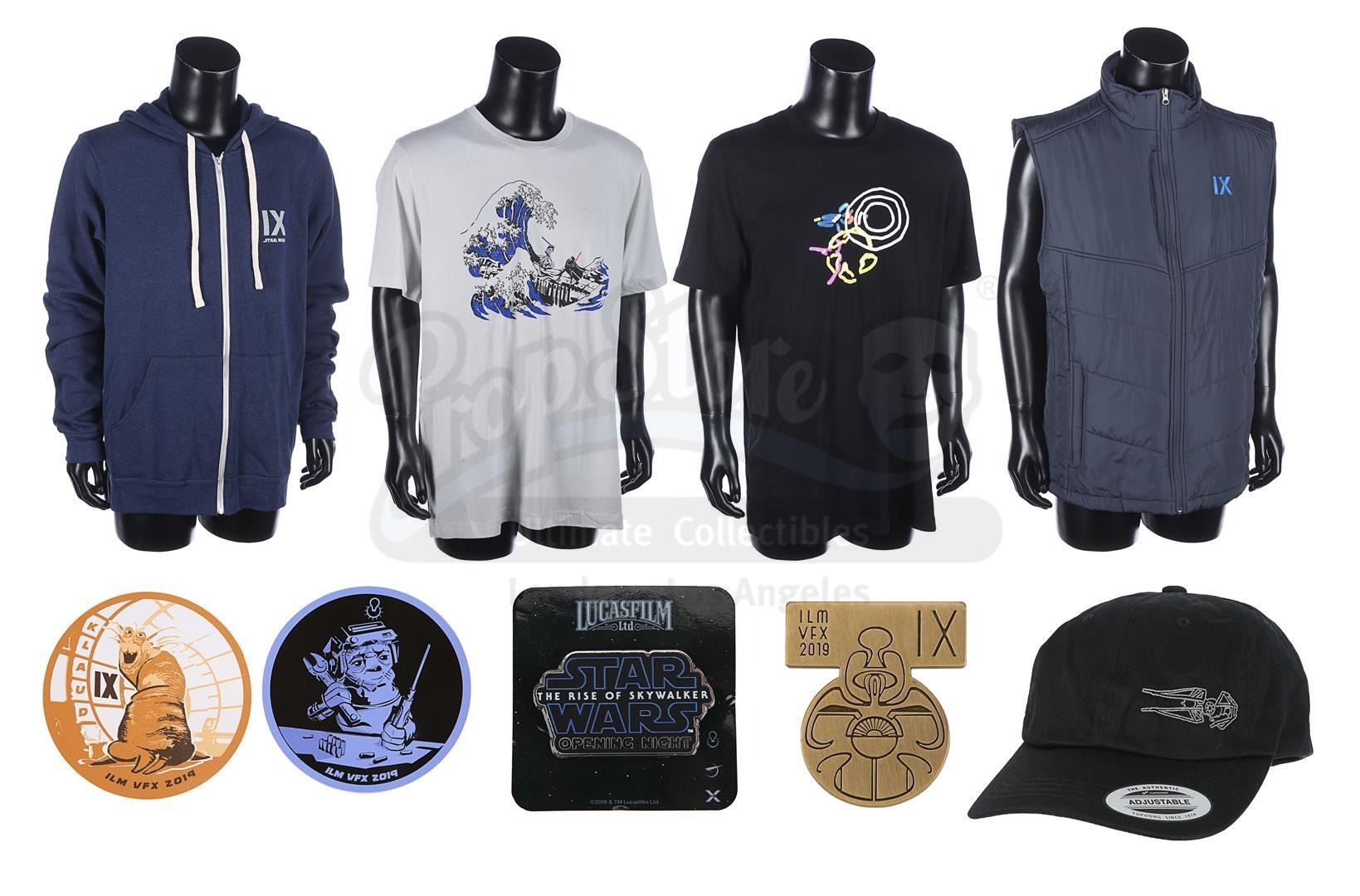 A set of ILM VFX crew items from the production of J.J. Abrams' Star Wars: The Rise of Skywalker. The lot consists of a navy padded gilet featuring "IX" embroidered in blue on the front (size XL); a blue zip-up hoodie with a fleet of First Order Star Destroyers printed in grey on the back (size XL); a black T-shirt displaying an abstract design (size XL); a grey T-shirt decorated with a battle scene involving Rey (Daisy Ridley) and Kylo Ren (Adam Driver) surrounded by waves (size XL); a black cotton Yupoong adjustable cap; a bronze-coloured Medal of Yavin pin; a Disney "Opening Night" pin; and two round stickers featuring different designs. The set displays minimal wear from use. Dimensions (each sticker): 9 cm x 9 cm (3 1/2" x 3 1/2"); (larger pin): 4.5 cm x 4 cm x 1.5 cm (1 3/4" x 1 1/2" x 1/2")