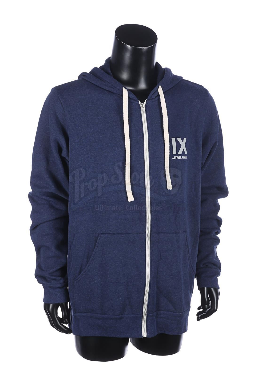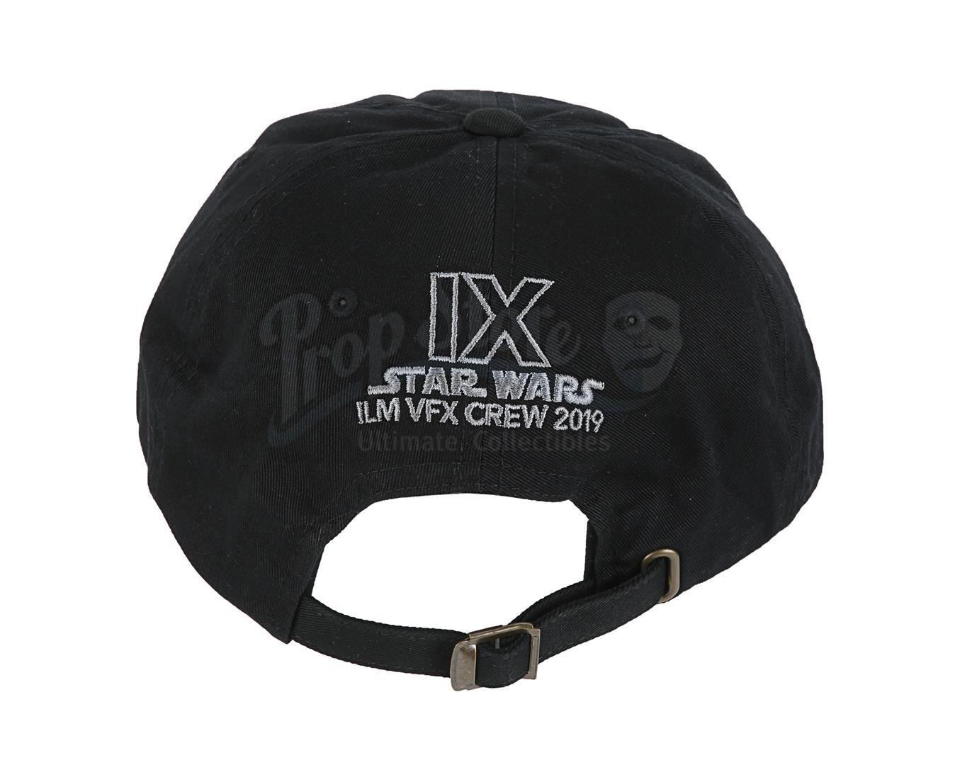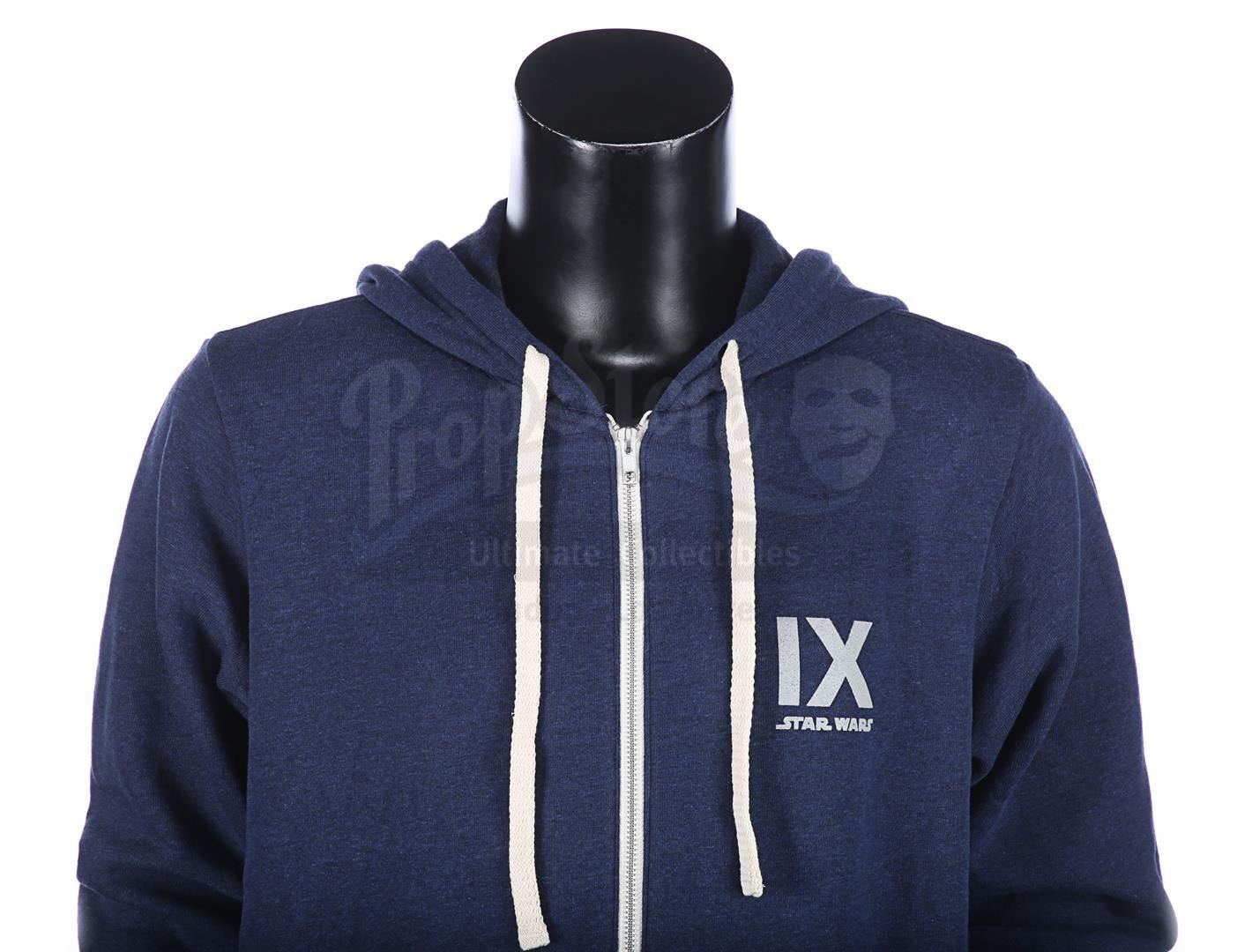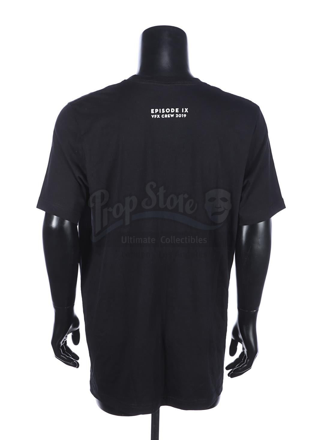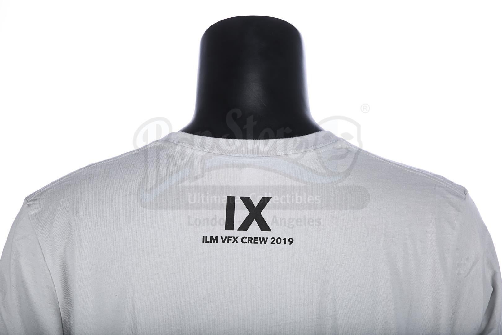 A set of ILM VFX crew items from the production of J.J. Abrams' Star Wars: The Rise of Skywalker. The lot consists of a navy padded gilet featuring "IX" embroidered in blue on the front (size XL); a blue zip-up hoodie with a fleet of First Order Star Destroyers printed in grey on the back (size XL); a black T-shirt displaying an abstract design (size XL); a grey T-shirt decorated with a battle scene involving Rey (Daisy Ridley) and Kylo Ren (Adam Driver) surrounded by waves (size XL); a black cotton Yupoong adjustable cap; a bronze-coloured Medal of Yavin pin; a Disney "Opening Night" pin; and two round stickers featuring different designs. The set displays minimal wear from use. Dimensions (each sticker): 9 cm x 9 cm (3 1/2" x 3 1/2"); (larger pin): 4.5 cm x 4 cm x 1.5 cm (1 3/4" x 1 1/2" x 1/2")