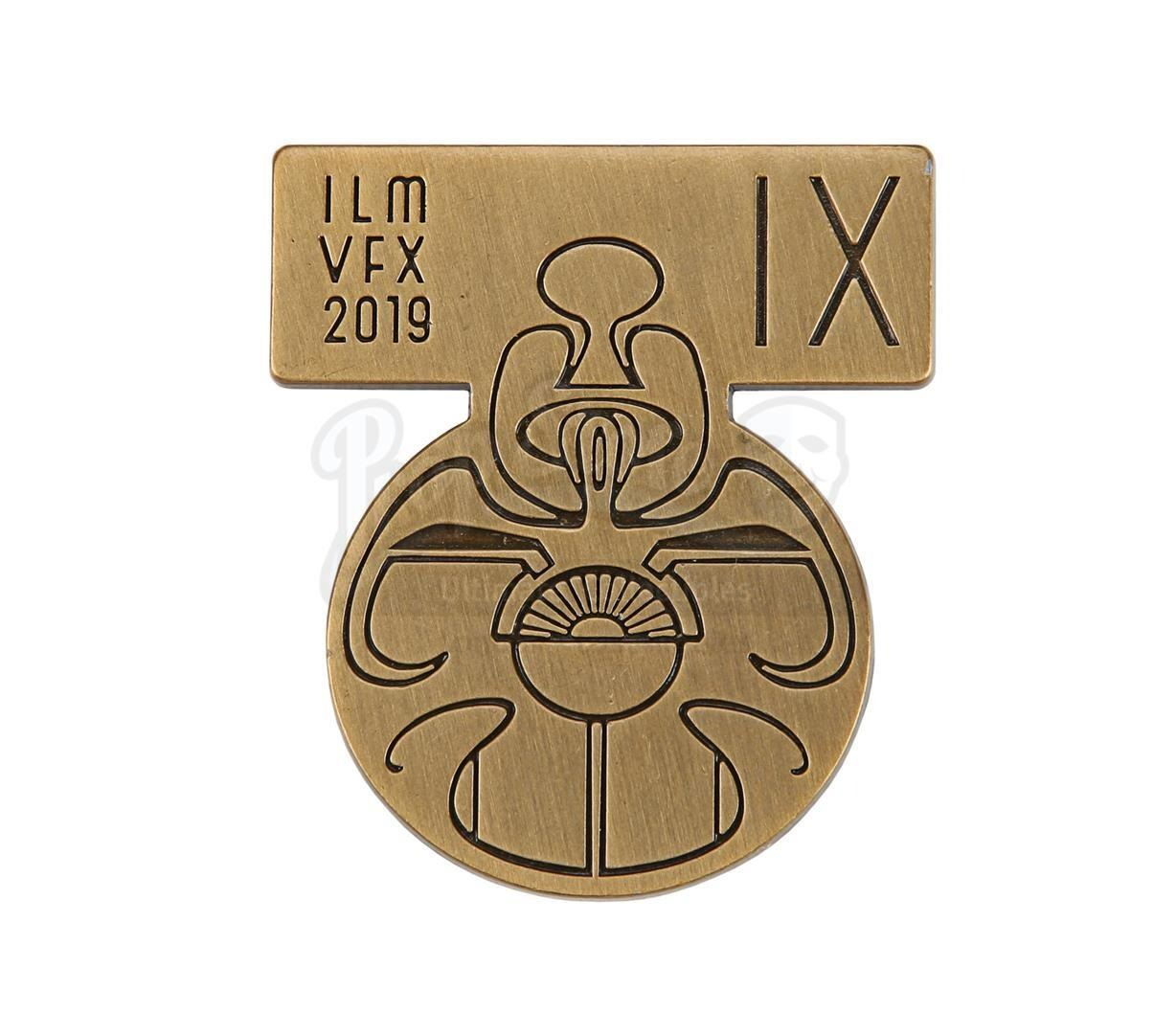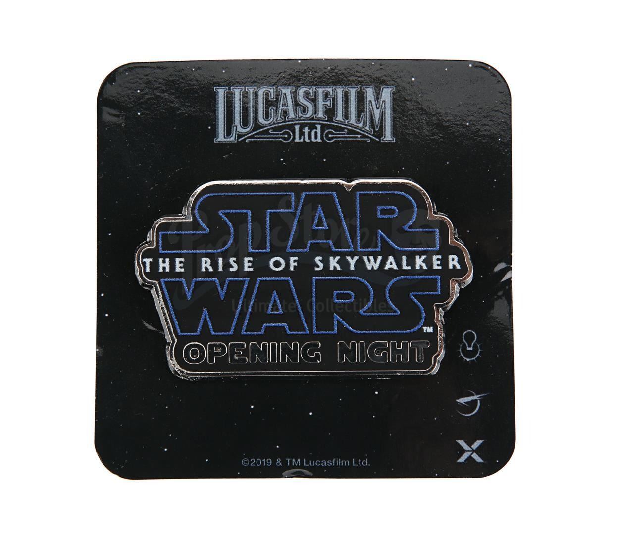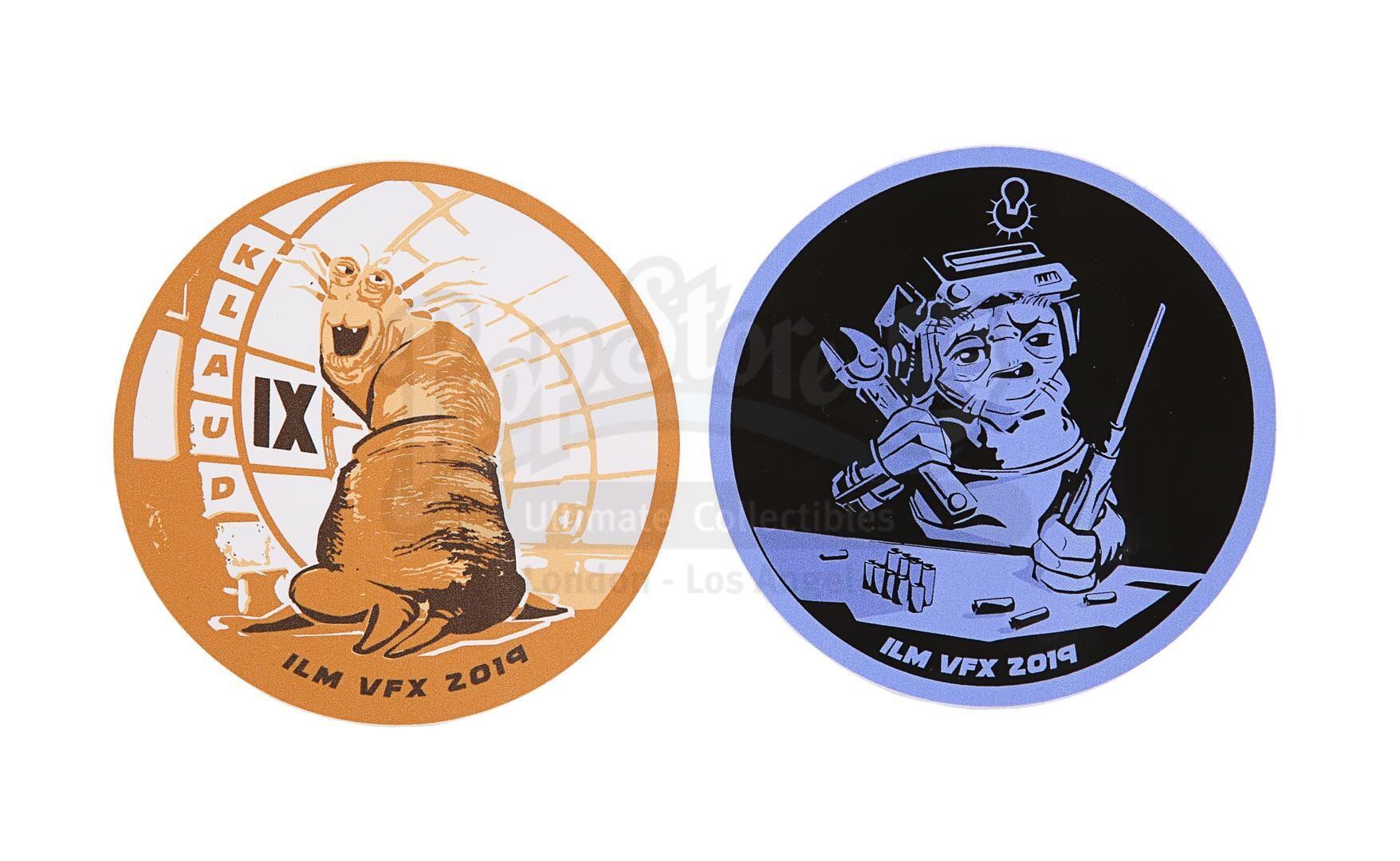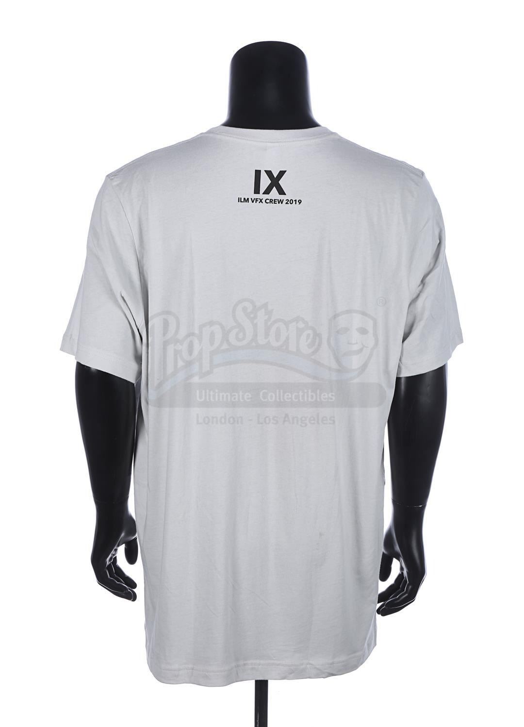 A set of ILM VFX crew items from the production of J.J. Abrams' Star Wars: The Rise of Skywalker. The lot consists of a navy padded gilet featuring "IX" embroidered in blue on the front (size XL); a blue zip-up hoodie with a fleet of First Order Star Destroyers printed in grey on the back (size XL); a black T-shirt displaying an abstract design (size XL); a grey T-shirt decorated with a battle scene involving Rey (Daisy Ridley) and Kylo Ren (Adam Driver) surrounded by waves (size XL); a black cotton Yupoong adjustable cap; a bronze-coloured Medal of Yavin pin; a Disney "Opening Night" pin; and two round stickers featuring different designs. The set displays minimal wear from use. Dimensions (each sticker): 9 cm x 9 cm (3 1/2" x 3 1/2"); (larger pin): 4.5 cm x 4 cm x 1.5 cm (1 3/4" x 1 1/2" x 1/2")