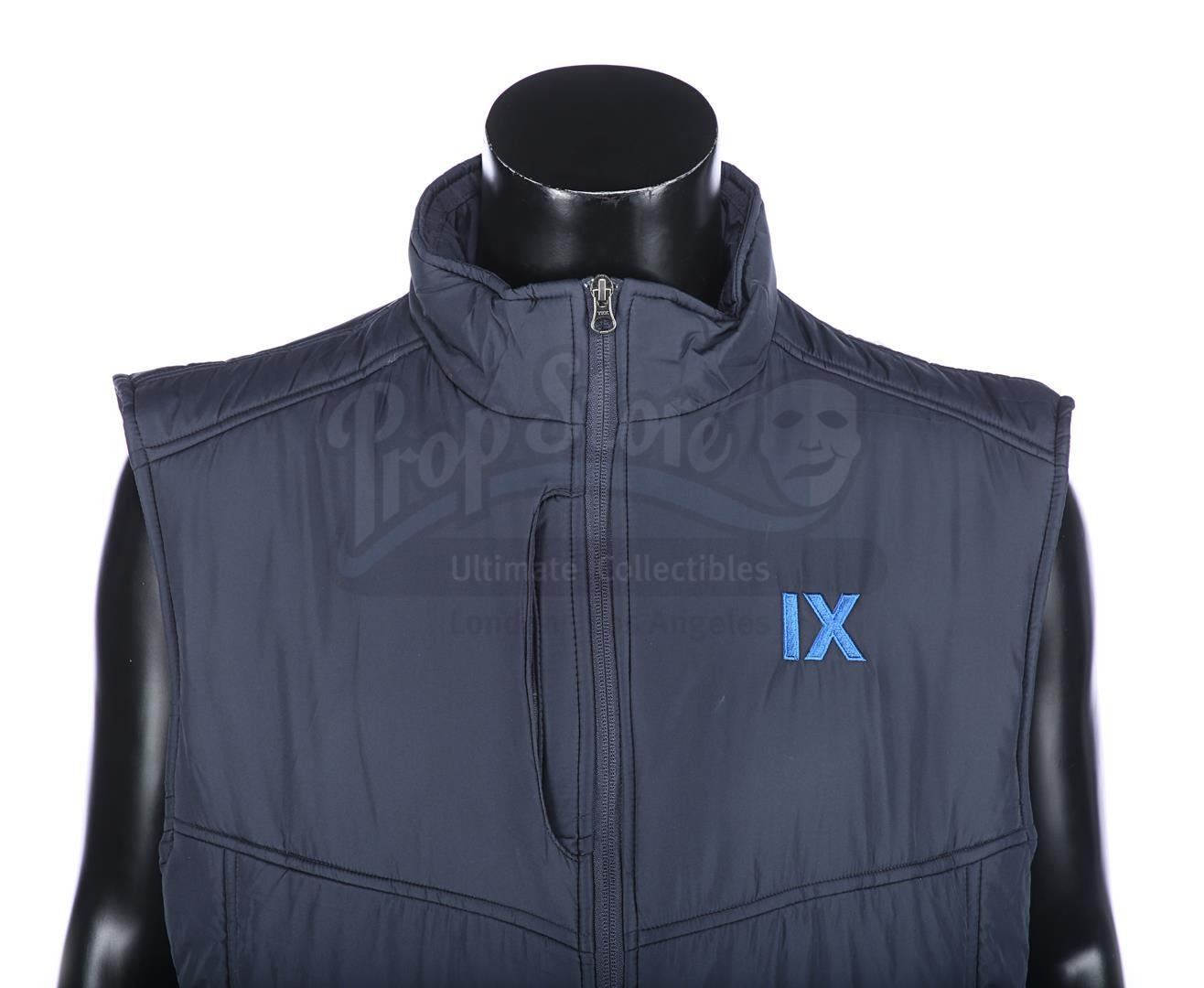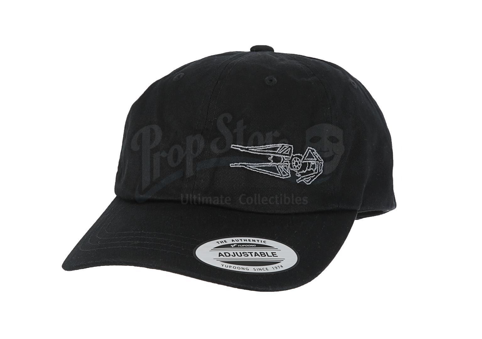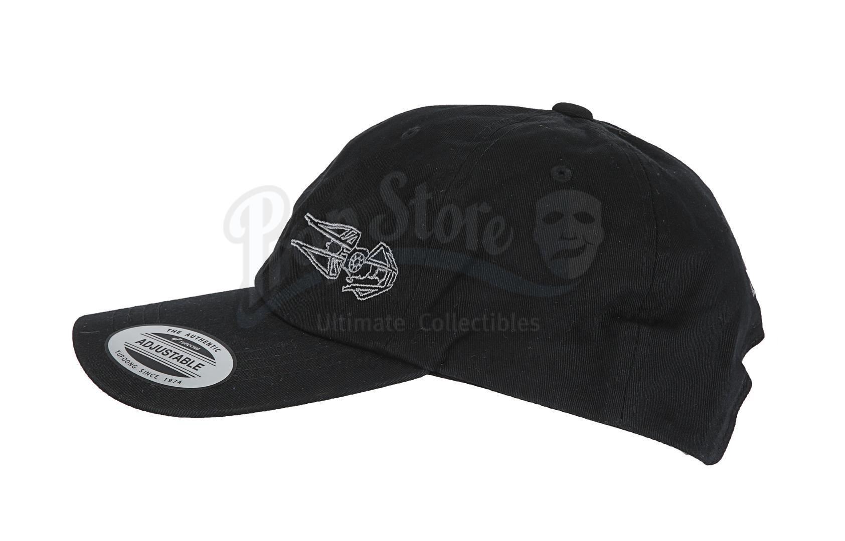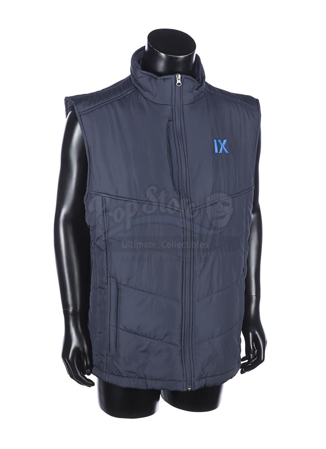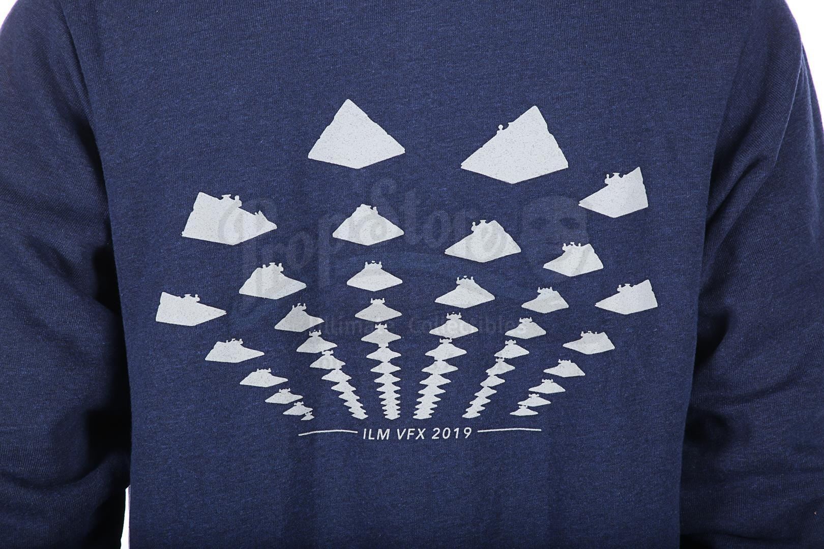 A set of ILM VFX crew items from the production of J.J. Abrams' Star Wars: The Rise of Skywalker. The lot consists of a navy padded gilet featuring "IX" embroidered in blue on the front (size XL); a blue zip-up hoodie with a fleet of First Order Star Destroyers printed in grey on the back (size XL); a black T-shirt displaying an abstract design (size XL); a grey T-shirt decorated with a battle scene involving Rey (Daisy Ridley) and Kylo Ren (Adam Driver) surrounded by waves (size XL); a black cotton Yupoong adjustable cap; a bronze-coloured Medal of Yavin pin; a Disney "Opening Night" pin; and two round stickers featuring different designs. The set displays minimal wear from use. Dimensions (each sticker): 9 cm x 9 cm (3 1/2" x 3 1/2"); (larger pin): 4.5 cm x 4 cm x 1.5 cm (1 3/4" x 1 1/2" x 1/2")