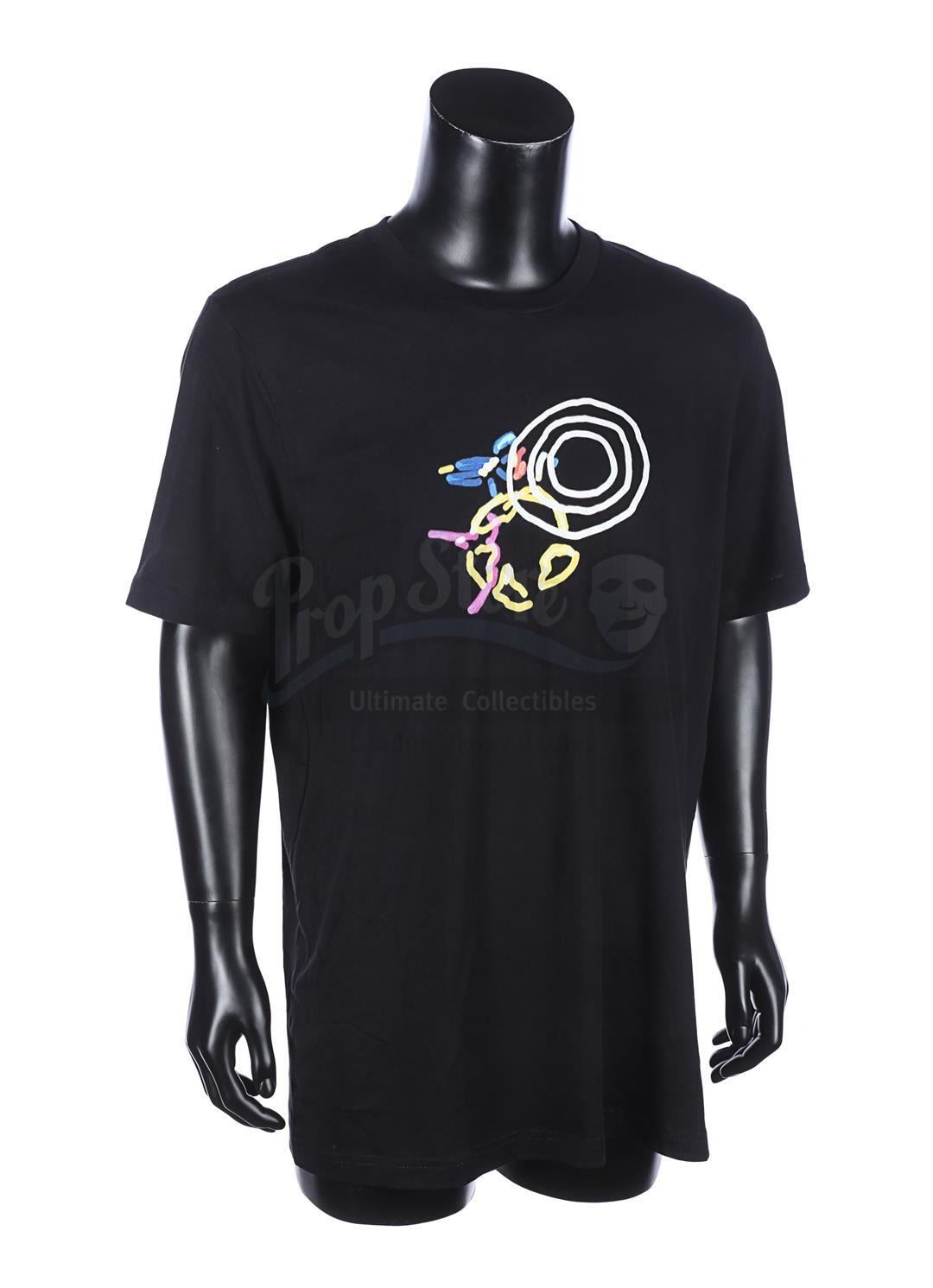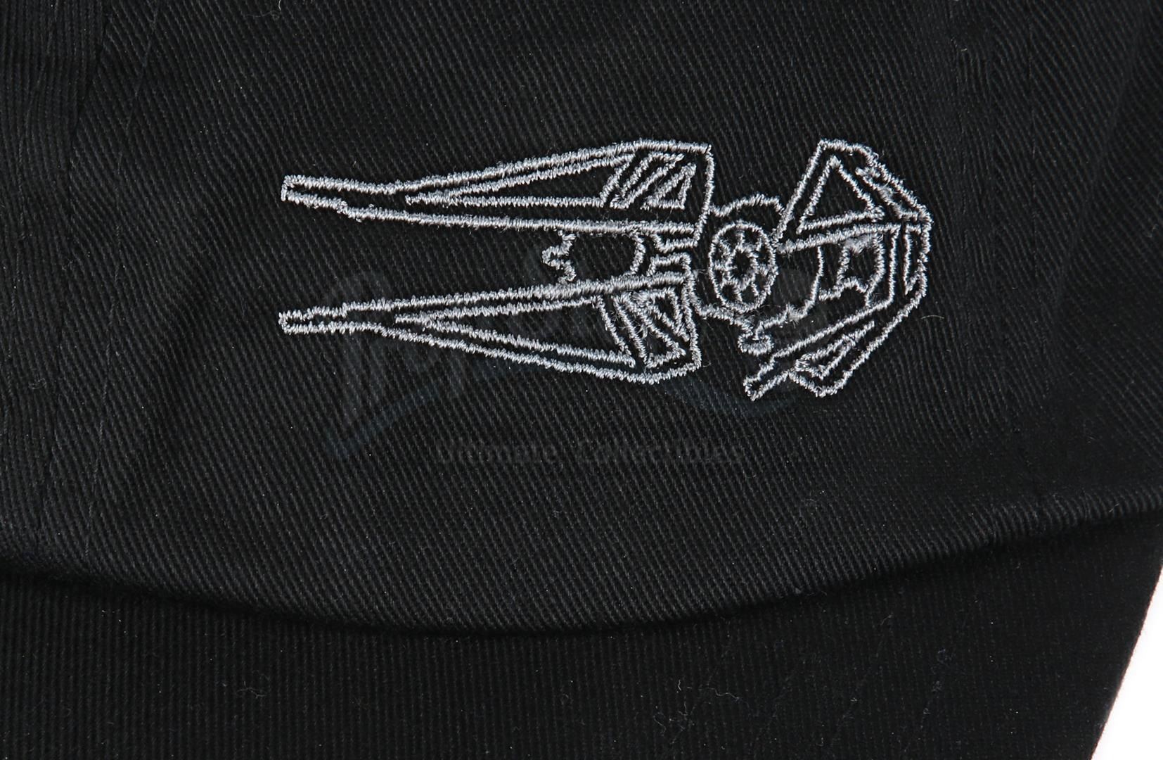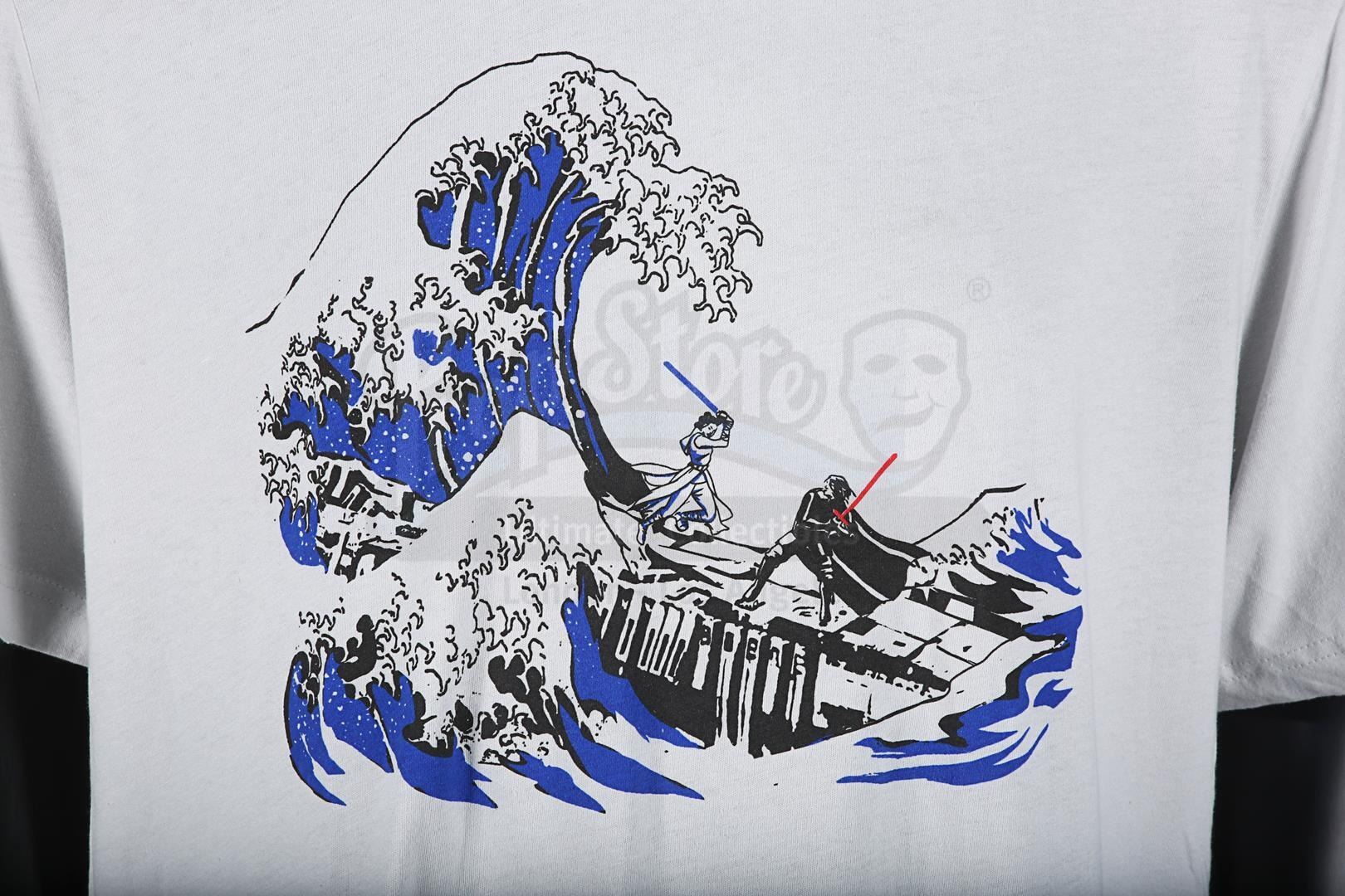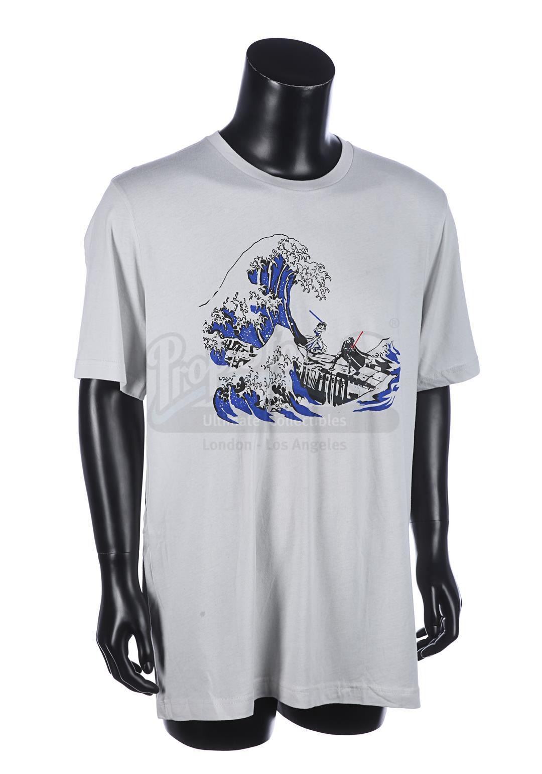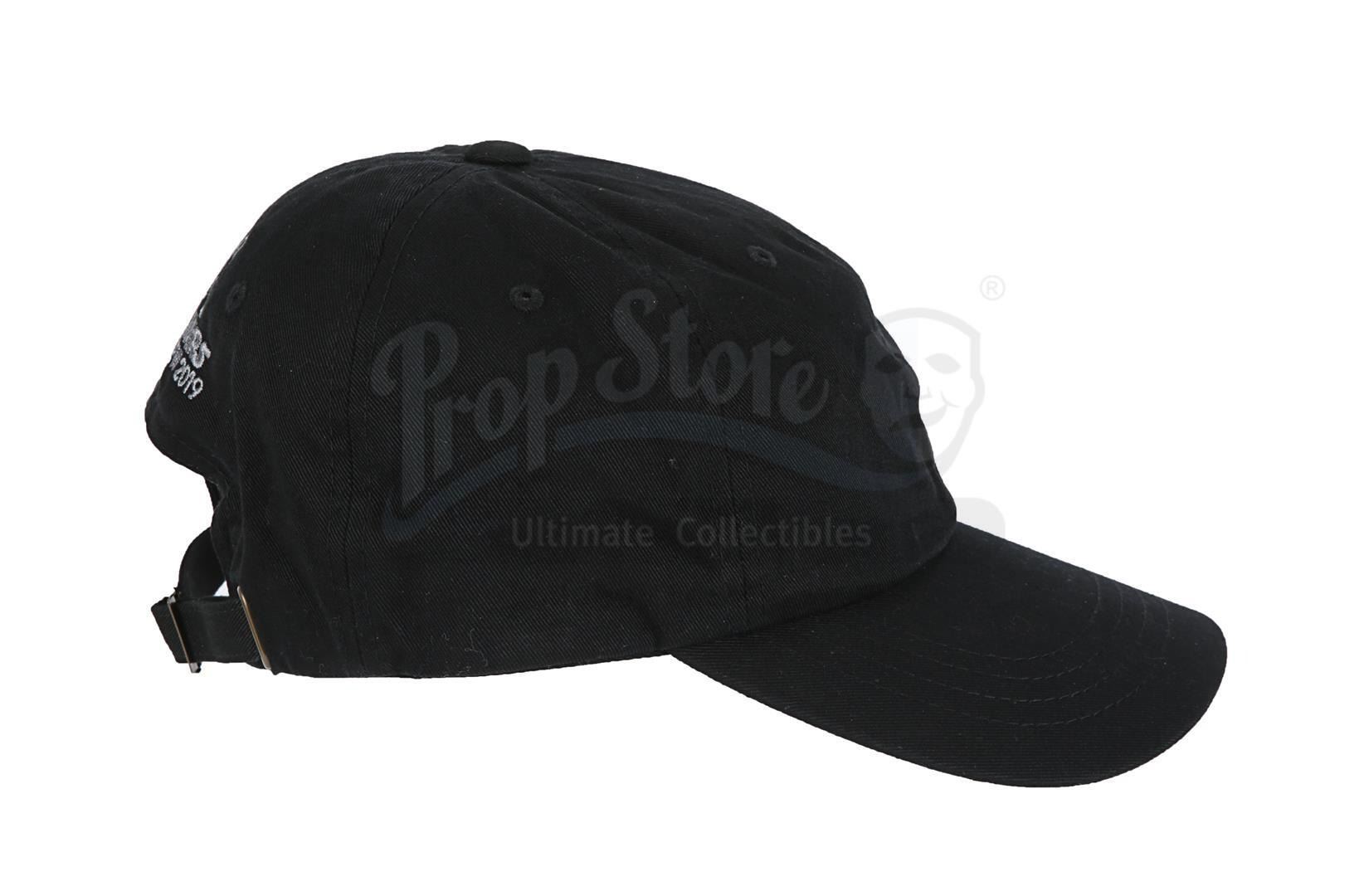 A set of ILM VFX crew items from the production of J.J. Abrams' Star Wars: The Rise of Skywalker. The lot consists of a navy padded gilet featuring "IX" embroidered in blue on the front (size XL); a blue zip-up hoodie with a fleet of First Order Star Destroyers printed in grey on the back (size XL); a black T-shirt displaying an abstract design (size XL); a grey T-shirt decorated with a battle scene involving Rey (Daisy Ridley) and Kylo Ren (Adam Driver) surrounded by waves (size XL); a black cotton Yupoong adjustable cap; a bronze-coloured Medal of Yavin pin; a Disney "Opening Night" pin; and two round stickers featuring different designs. The set displays minimal wear from use. Dimensions (each sticker): 9 cm x 9 cm (3 1/2" x 3 1/2"); (larger pin): 4.5 cm x 4 cm x 1.5 cm (1 3/4" x 1 1/2" x 1/2")
