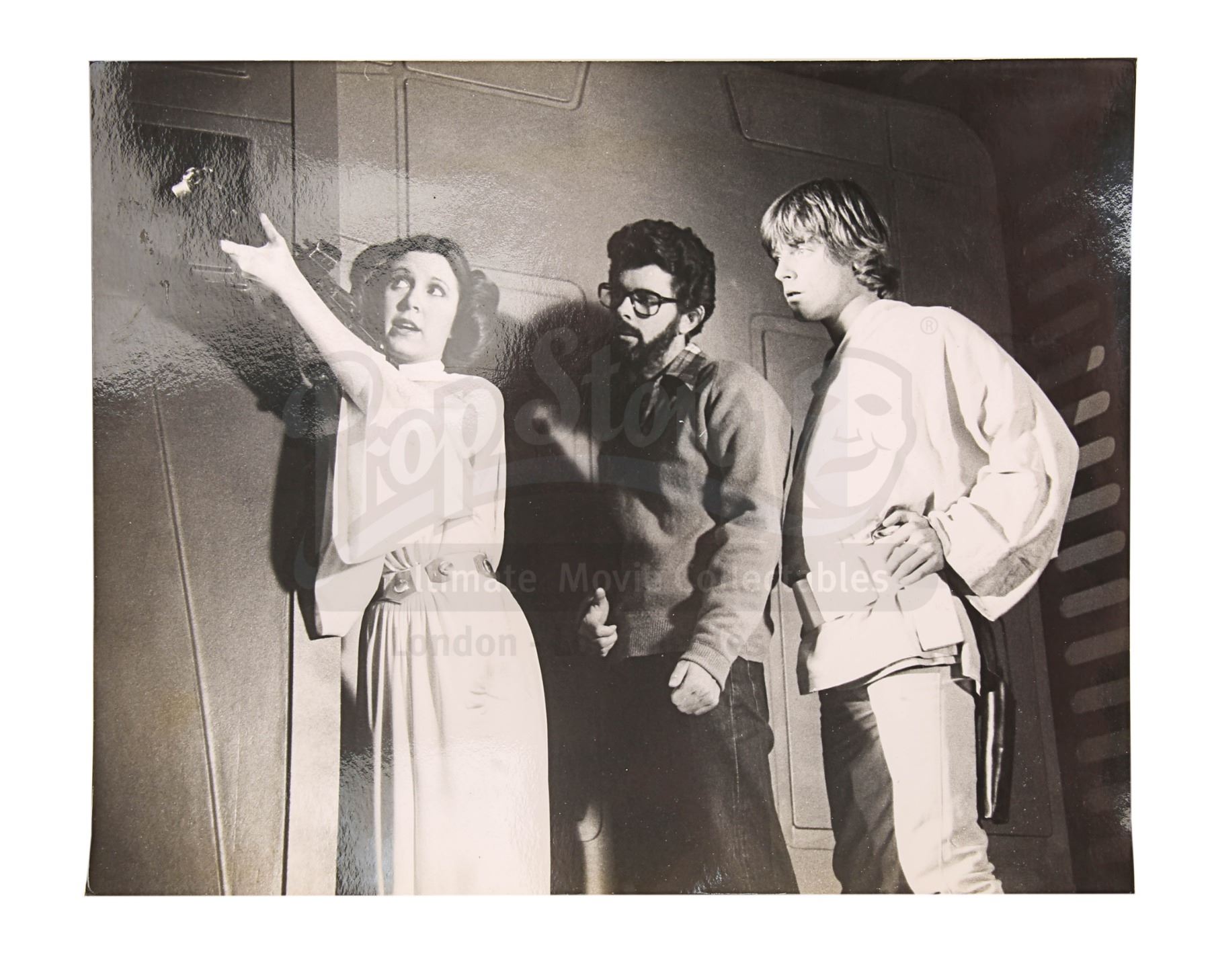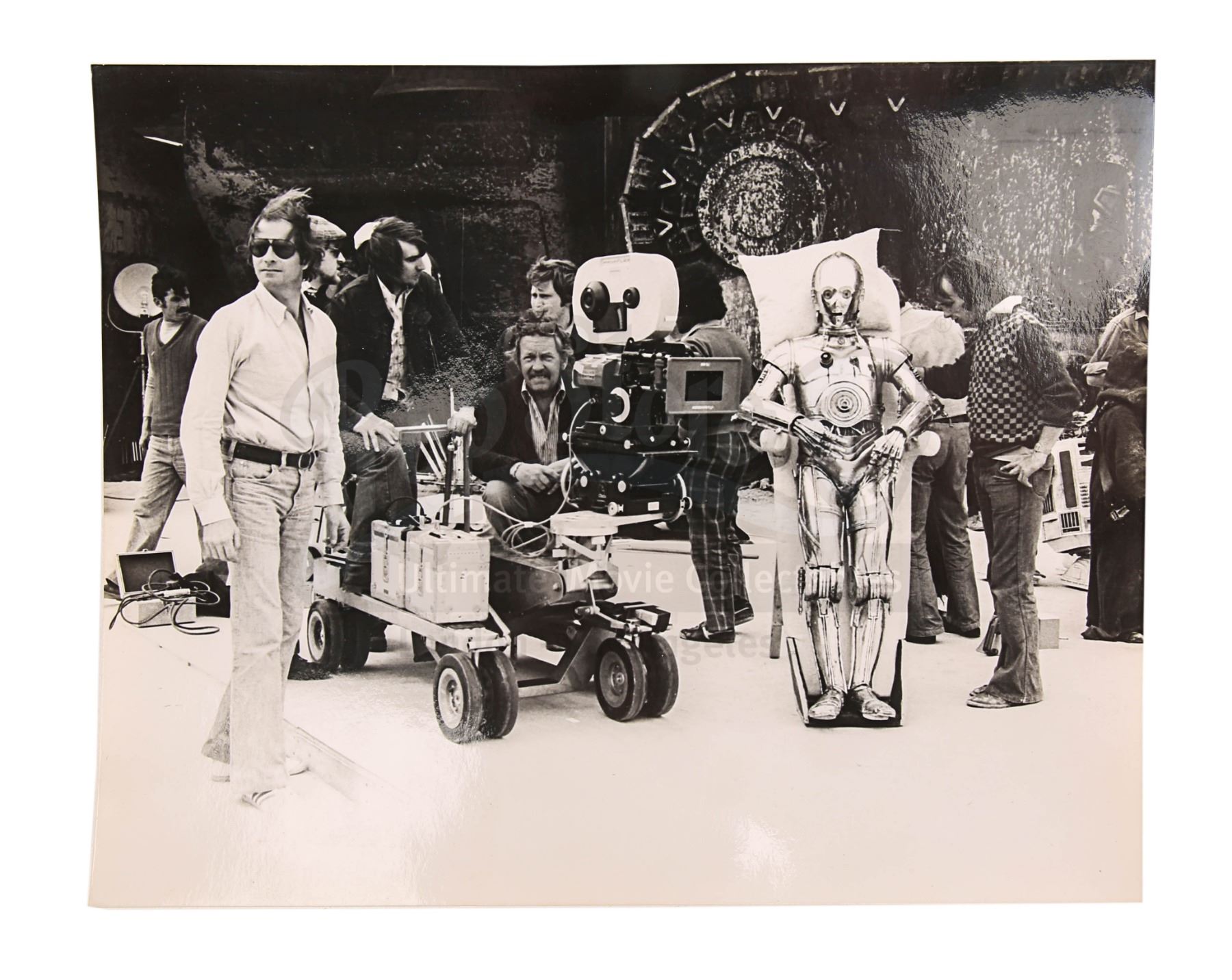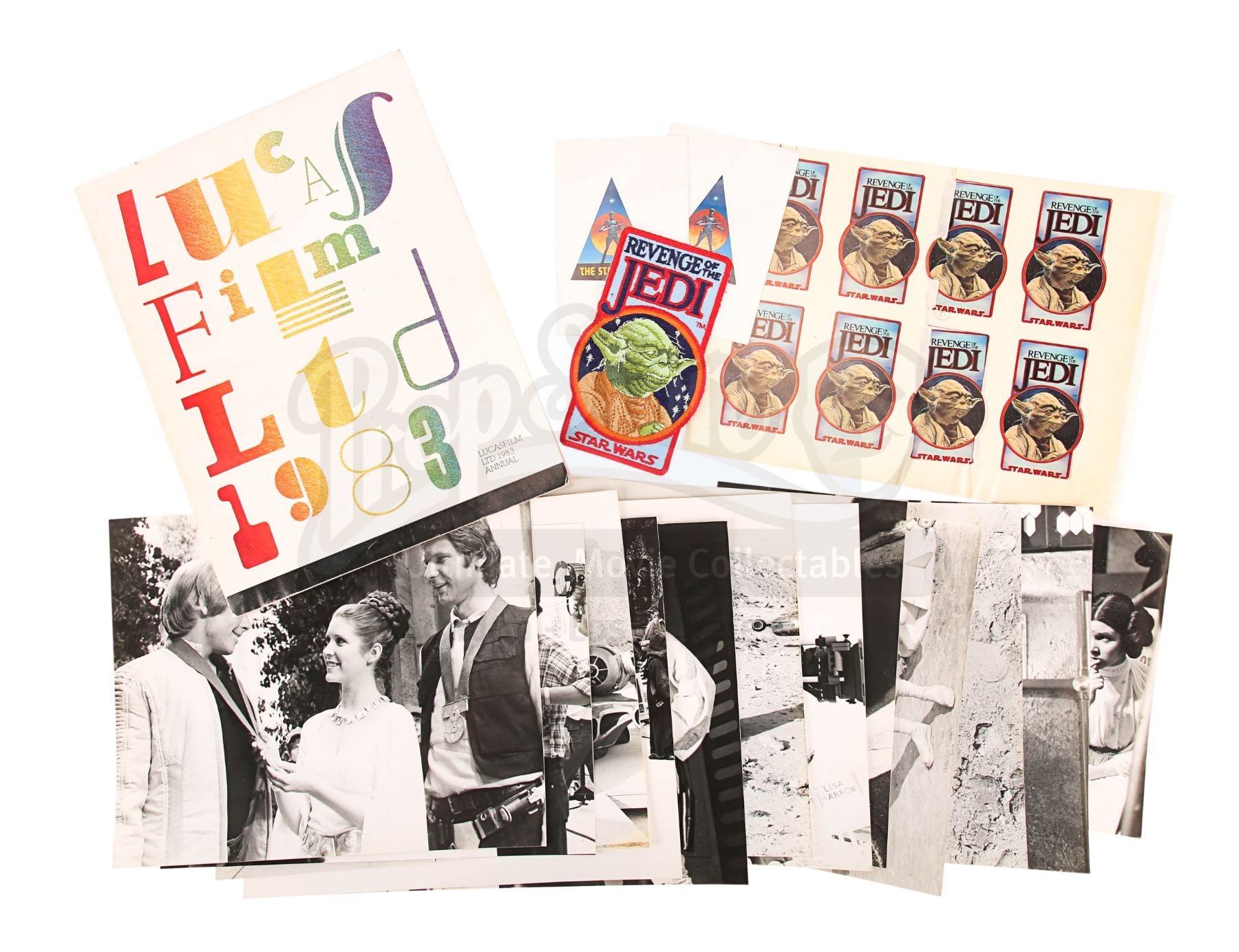 An archive of behind-the-scenes stills, a Lucasfilm Ltd annual from 1983, and a set of crew stickers from the original Star Wars trilogy. This item comes from the personal collection of legendary producer Robert Watts. Comprising a set of 12, the black-and-white stills were taken during the filming of A New Hope and show key cast members, droids, director George Lucas and others.