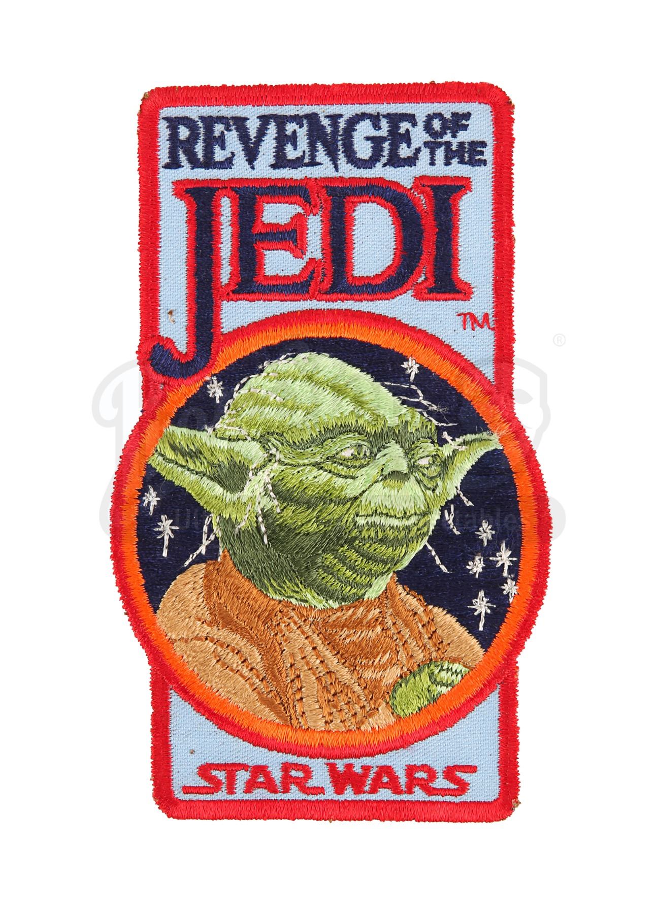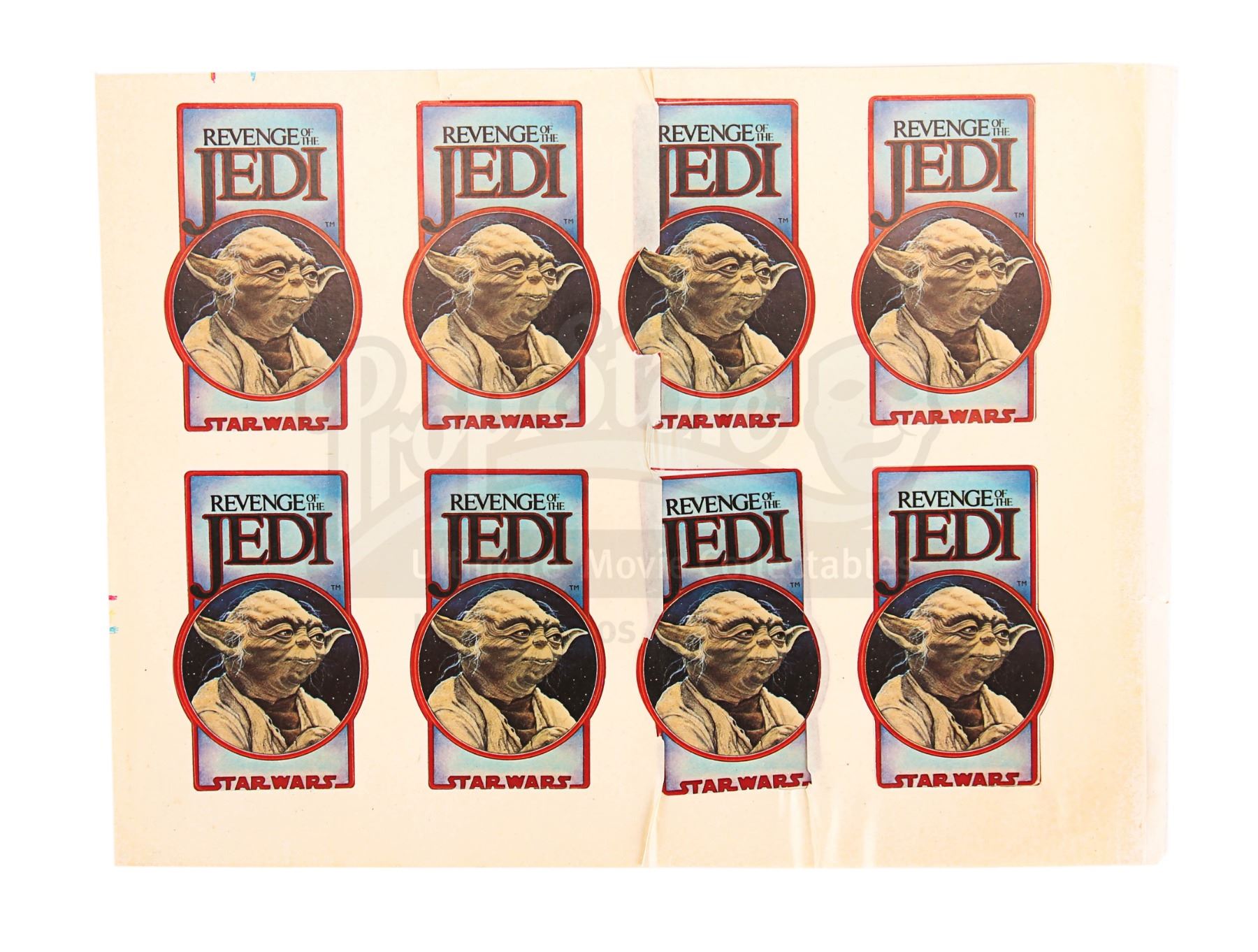 Annuals were gifted to Lucasfilm employees during their yearly picnic at Skywalker Ranch. This set of stickers includes two triangular stickers designed by Ralph McQuarrie and a sheet of uncut stickers featuring Return of the Jedi's original title "Revenge of the Jedi" with an image of Yoda. The lot is completed by a colourful embroidered patch of the same Yoda design. The lot exhibits minor wear, including light scratches, plucks around the patch outline, and crease lines, notably on the annual cover and uncut sticker sheet. Dimensions (annual): 28 cm x 22 cm x 1 cm (11" x 8 3/4" x 1/2"); (each photo): 20 cm x 25.5 cm (8" x 10"); (sticker sheet): 19 cm x 25 cm (7 1/2" x 10")