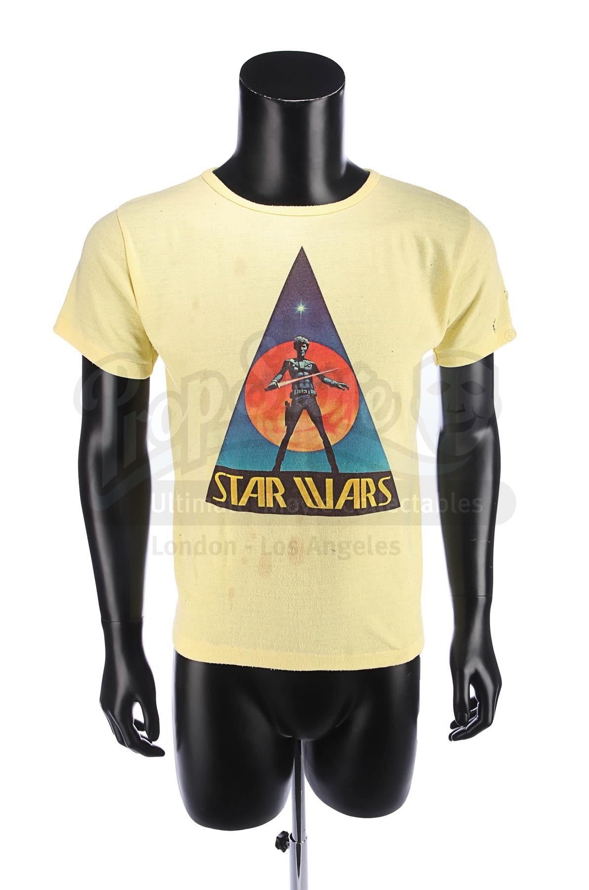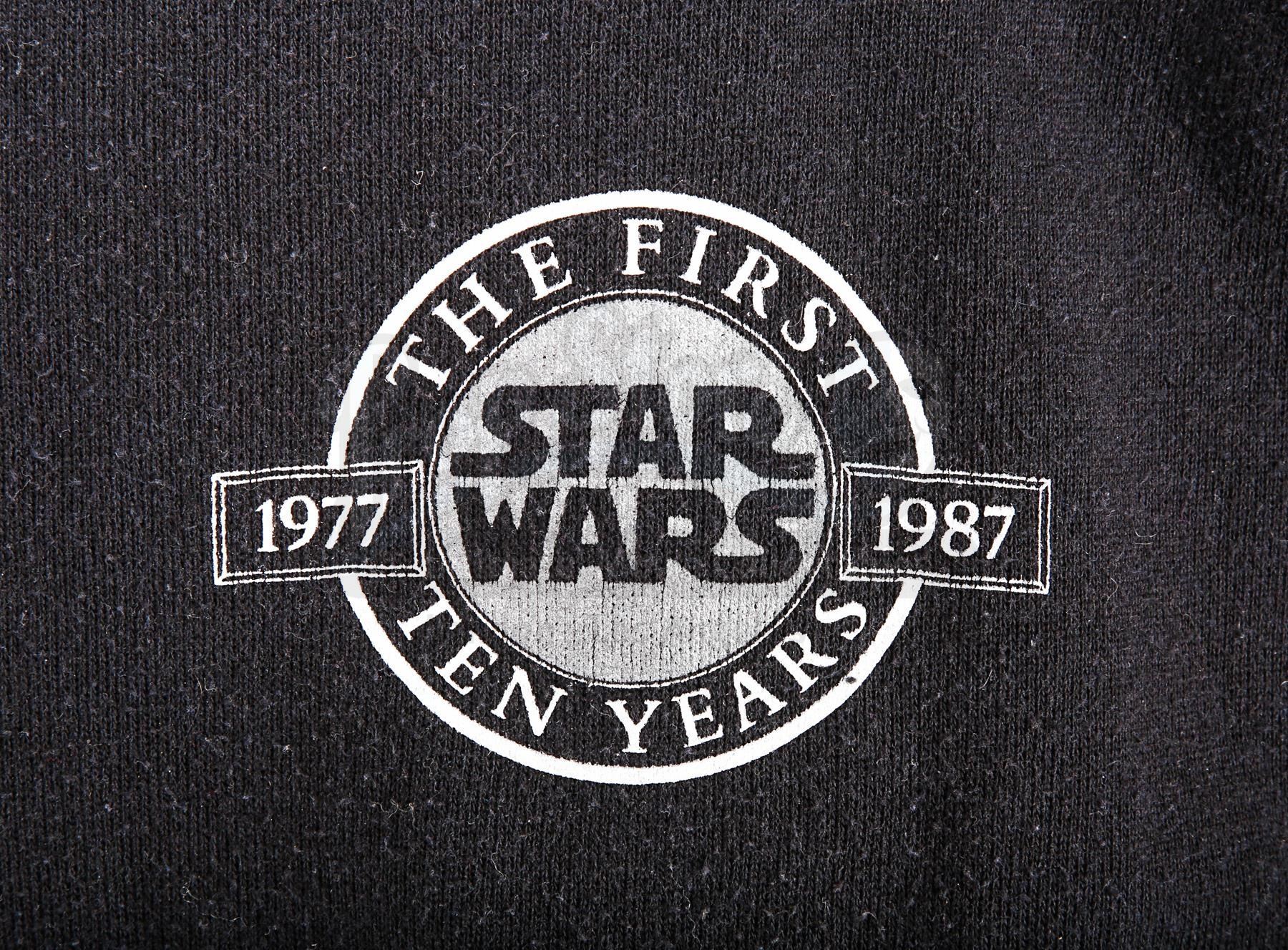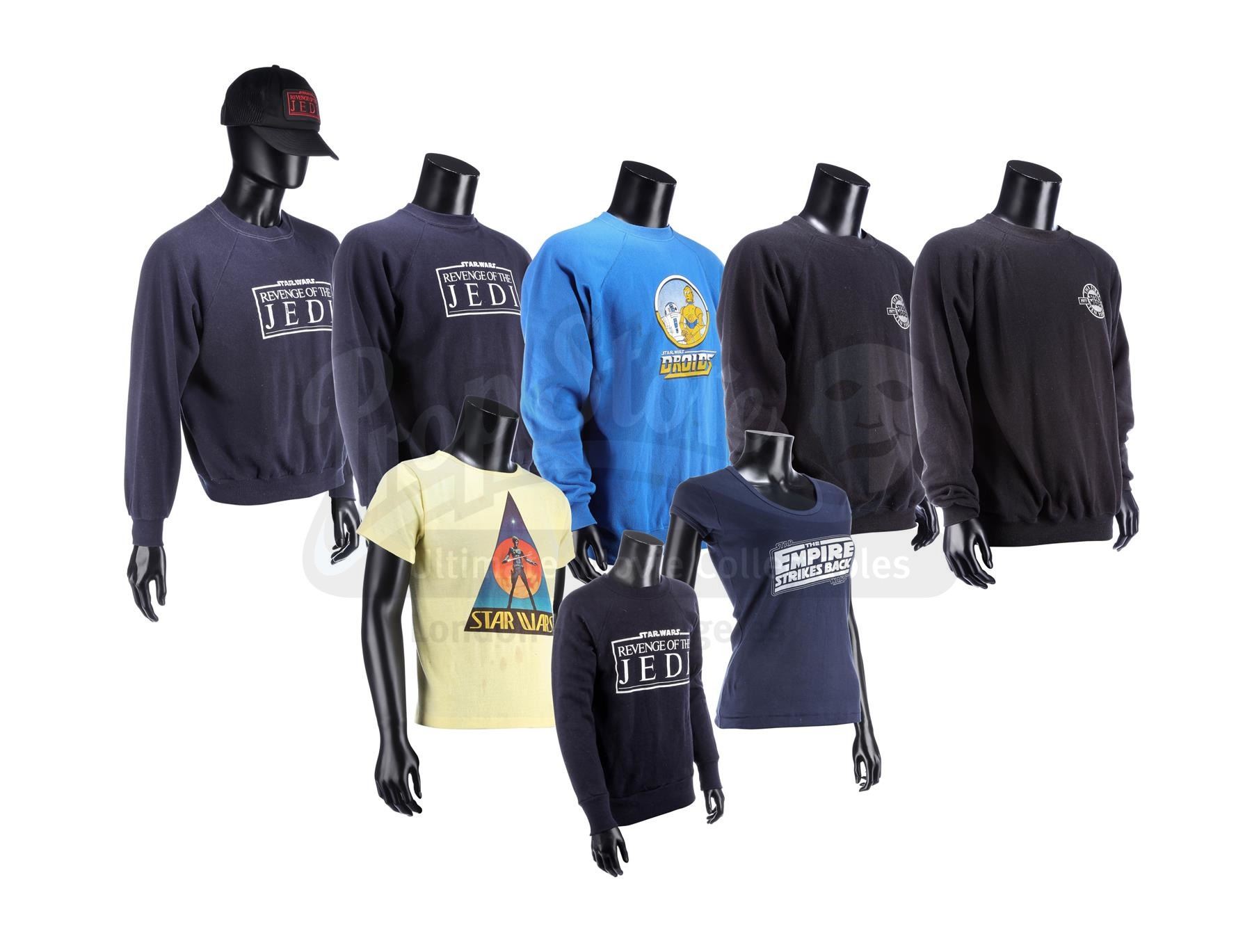 A collection of nine crew items from the original Star Wars trilogy. These items come from the personal collection of legendary producer Robert Watts. The lot consists of a black mesh crew cap featuring "Revenge of the Jedi" embroidered in red on the front; two navy blue "Revenge of the Jedi" sweatshirts (size L); a matching children's sweatshirt (size S); a navy ladies' The Empire Strikes Back T-shirt (size M); a blue Star Wars: Droids sweatshirt (size XL); two black "The First Ten Years" sweatshirts (size XL); and a yellow Star Wars T-shirt (size L), featuring a triangular logo designed by Ralph McQuarrie. The set displays light wear from production use, including several marks and minor plucks, and cracks have formed in some of the printed titles.