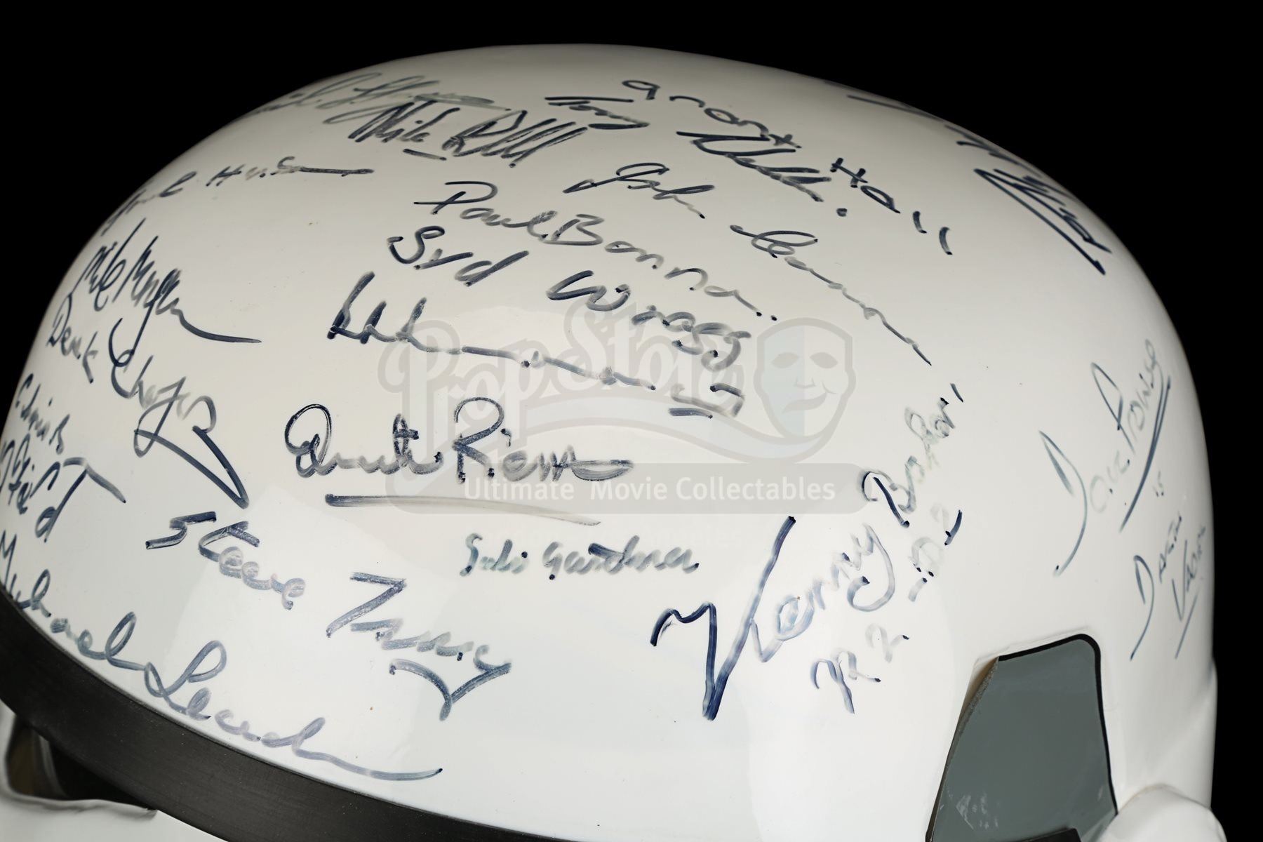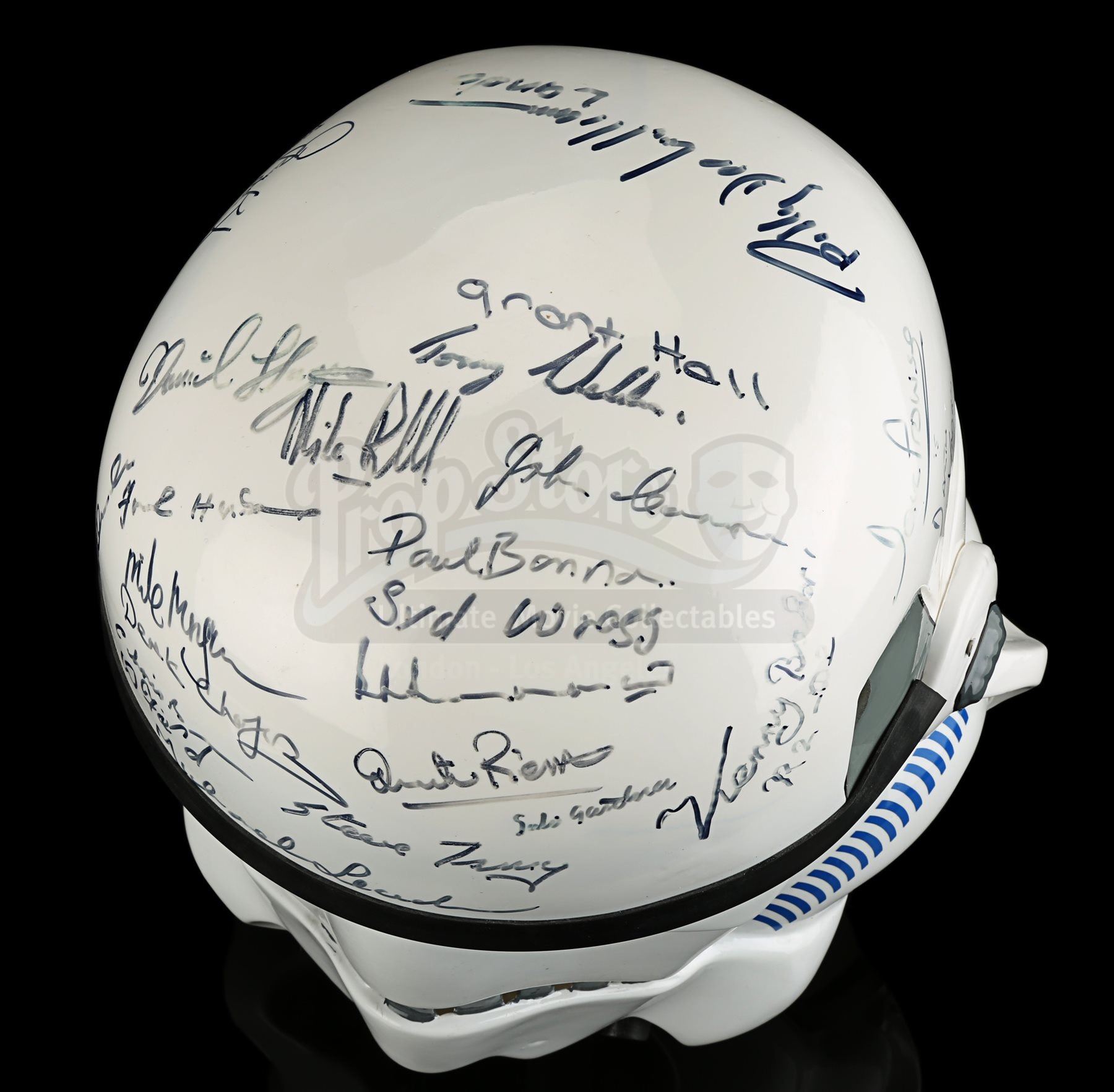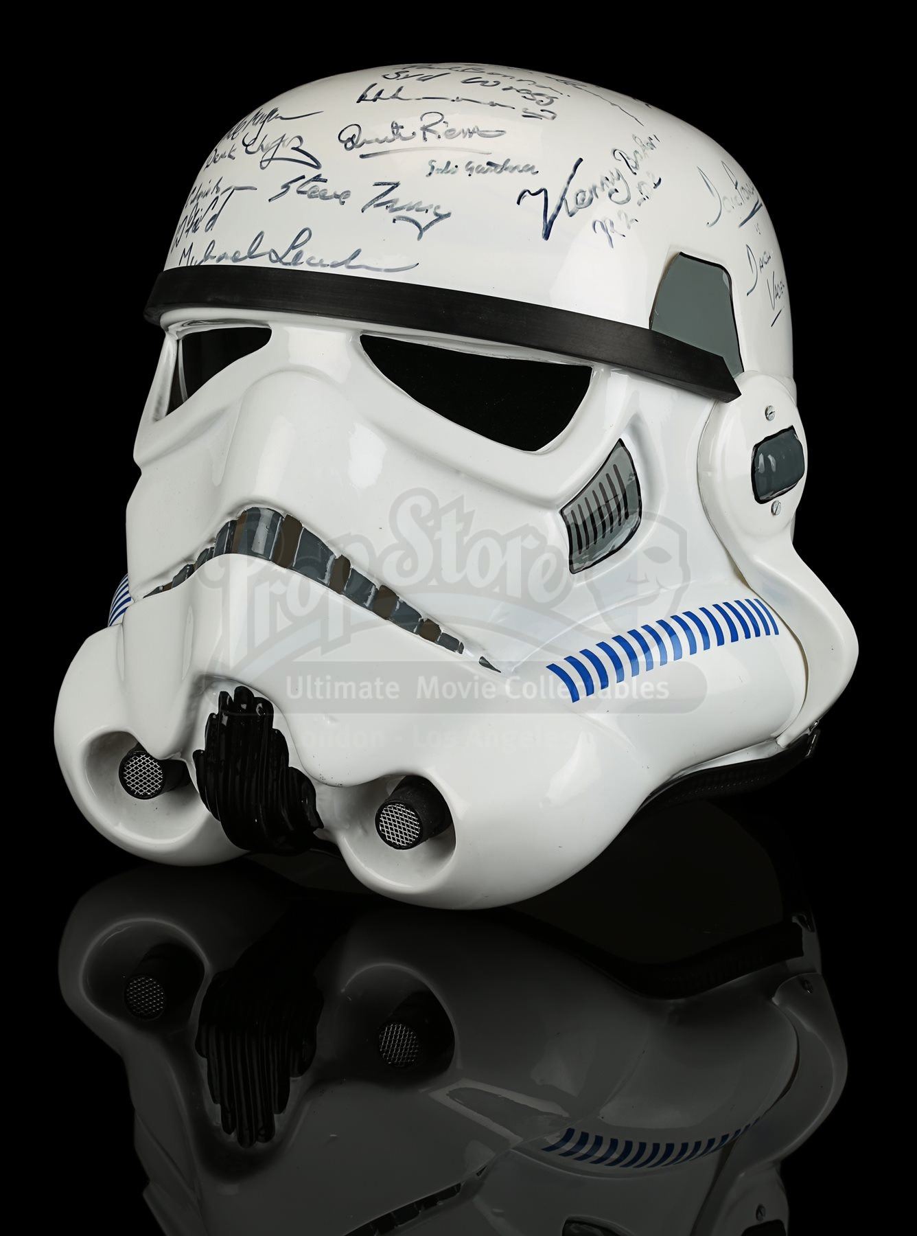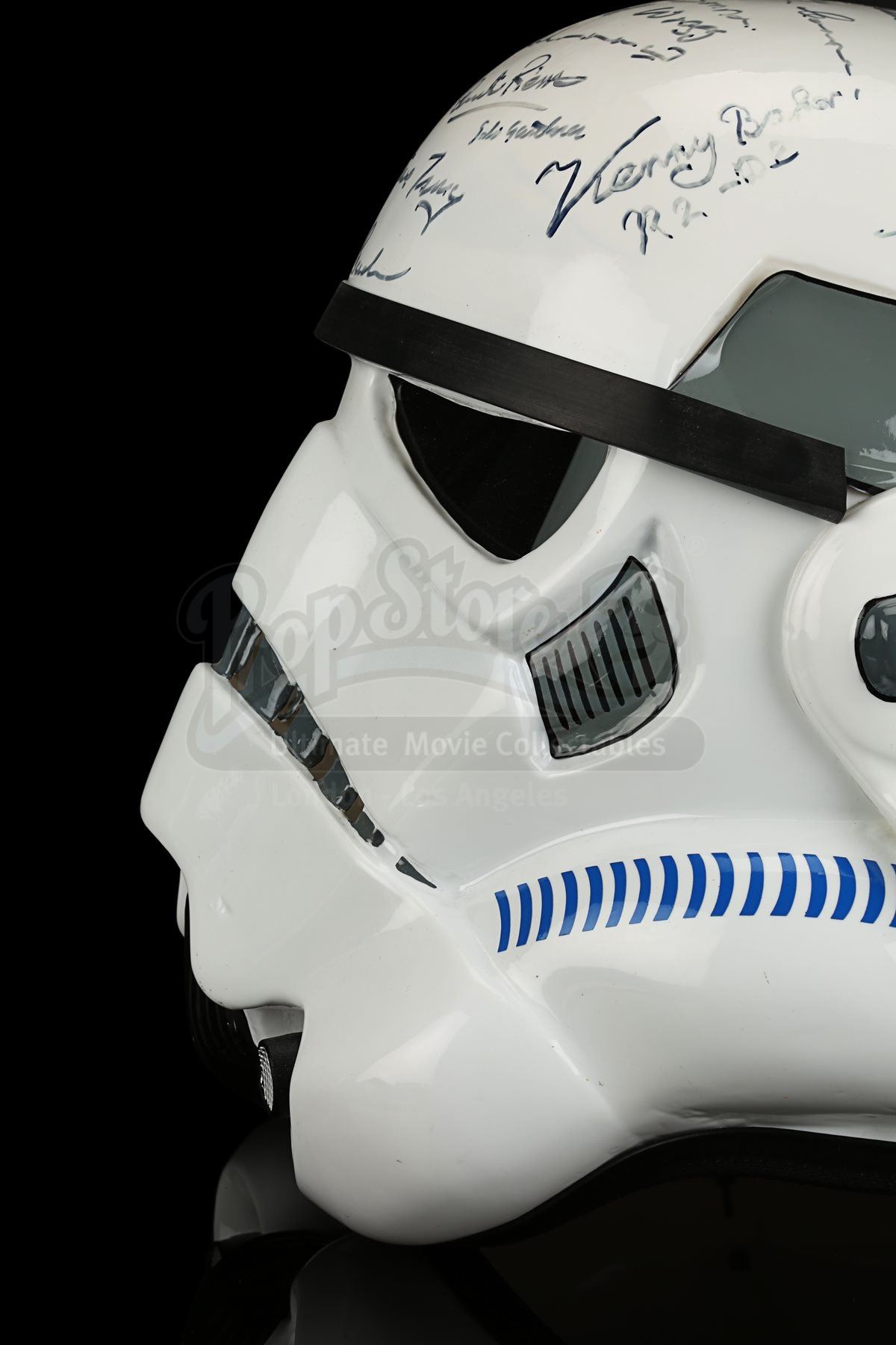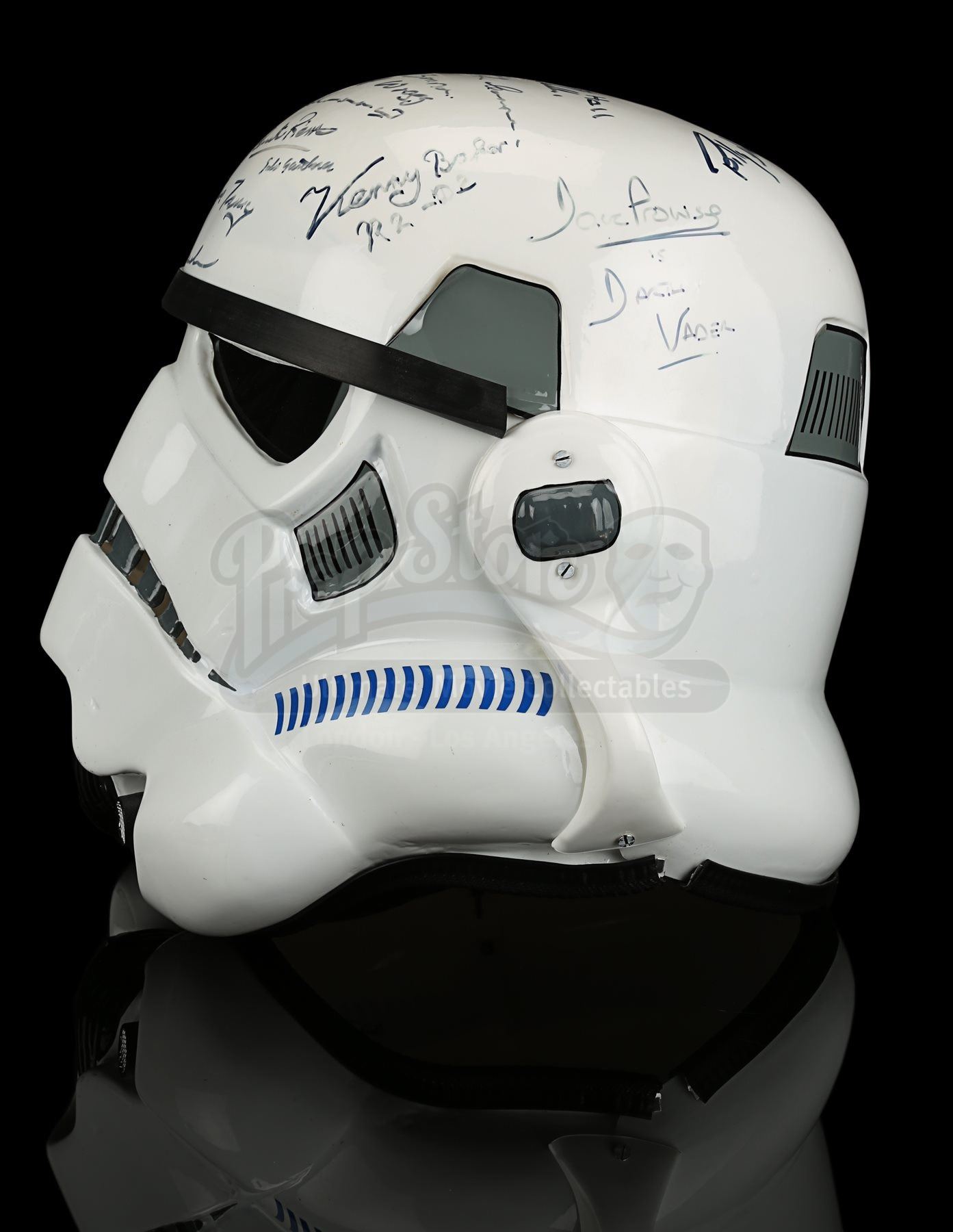 An autographed replica stormtrooper helmet from the original Star Wars trilogy. Made of white vacuum-formed plastic, the helmet displays a black rubber trim along the brow and neck, green acrylic lenses installed in the eye holes and various decals, including blue tube stripes on the cheeks.