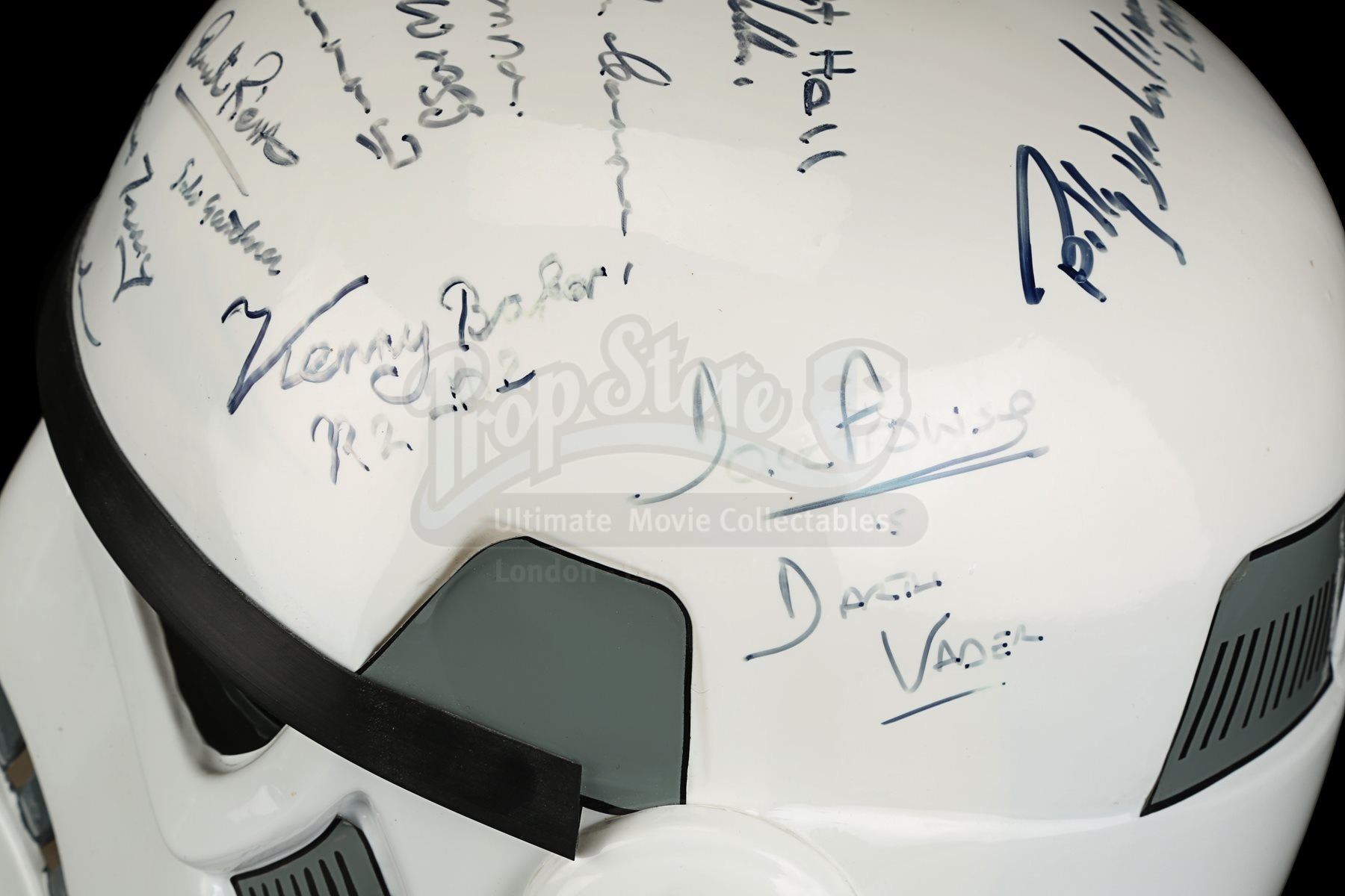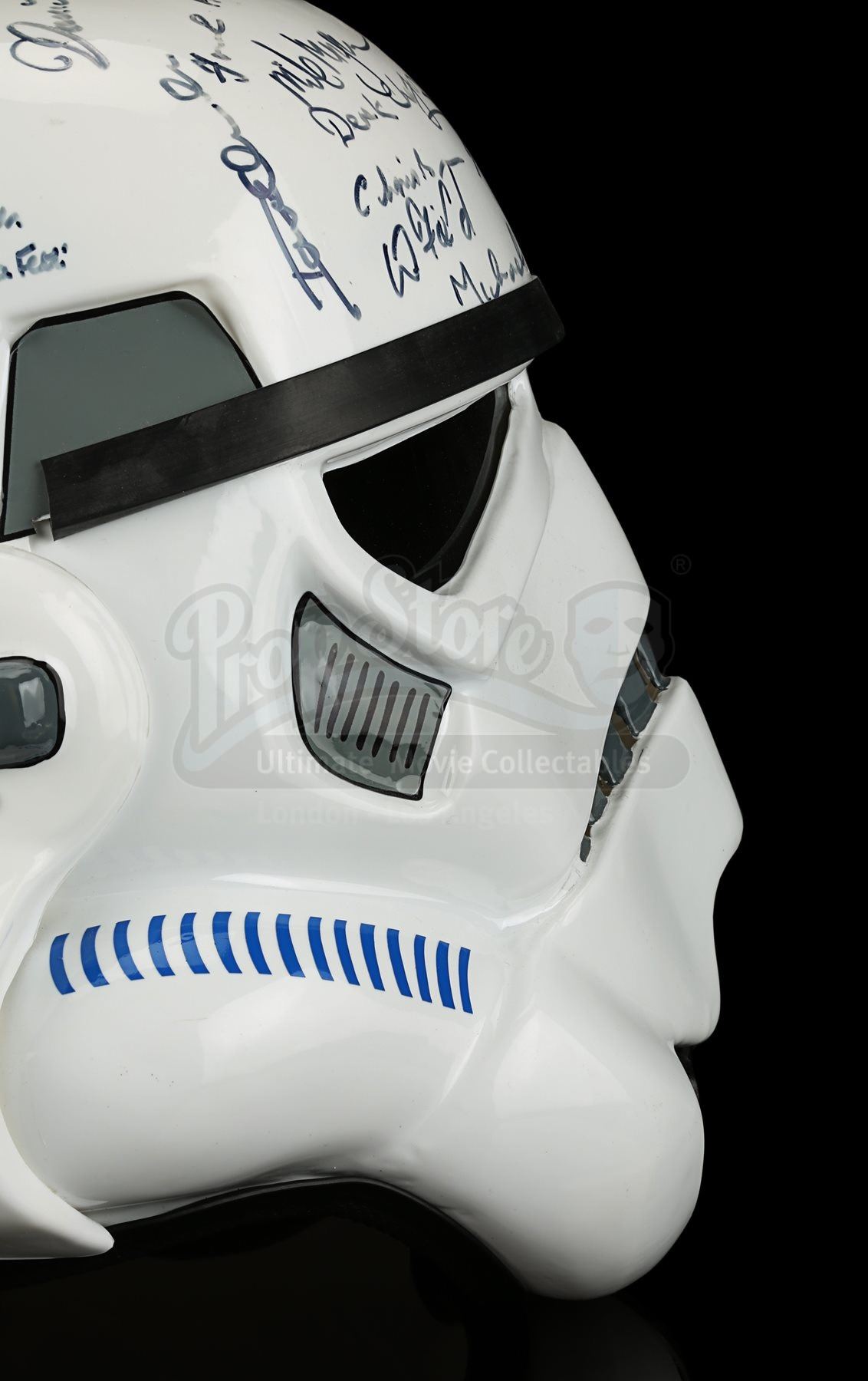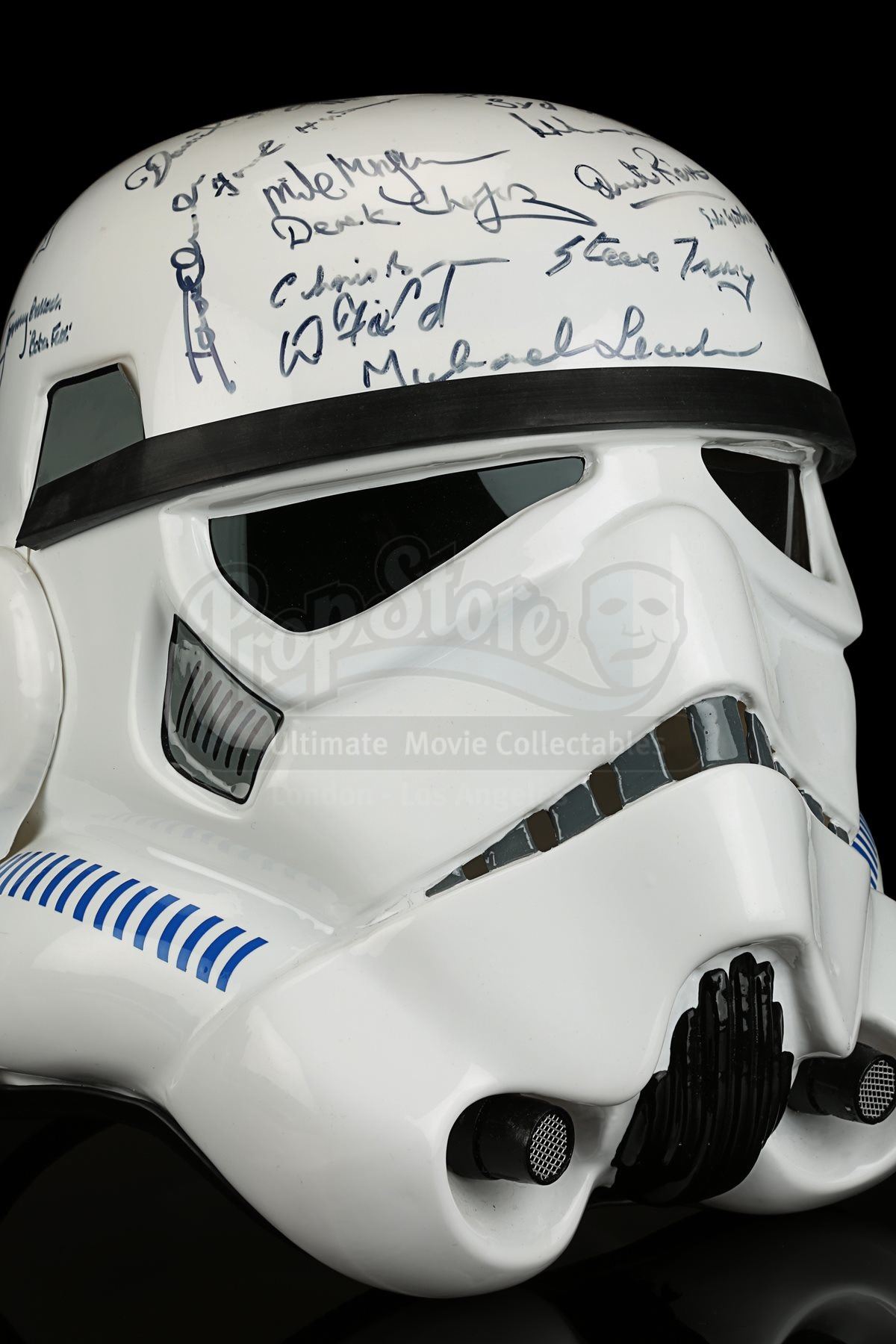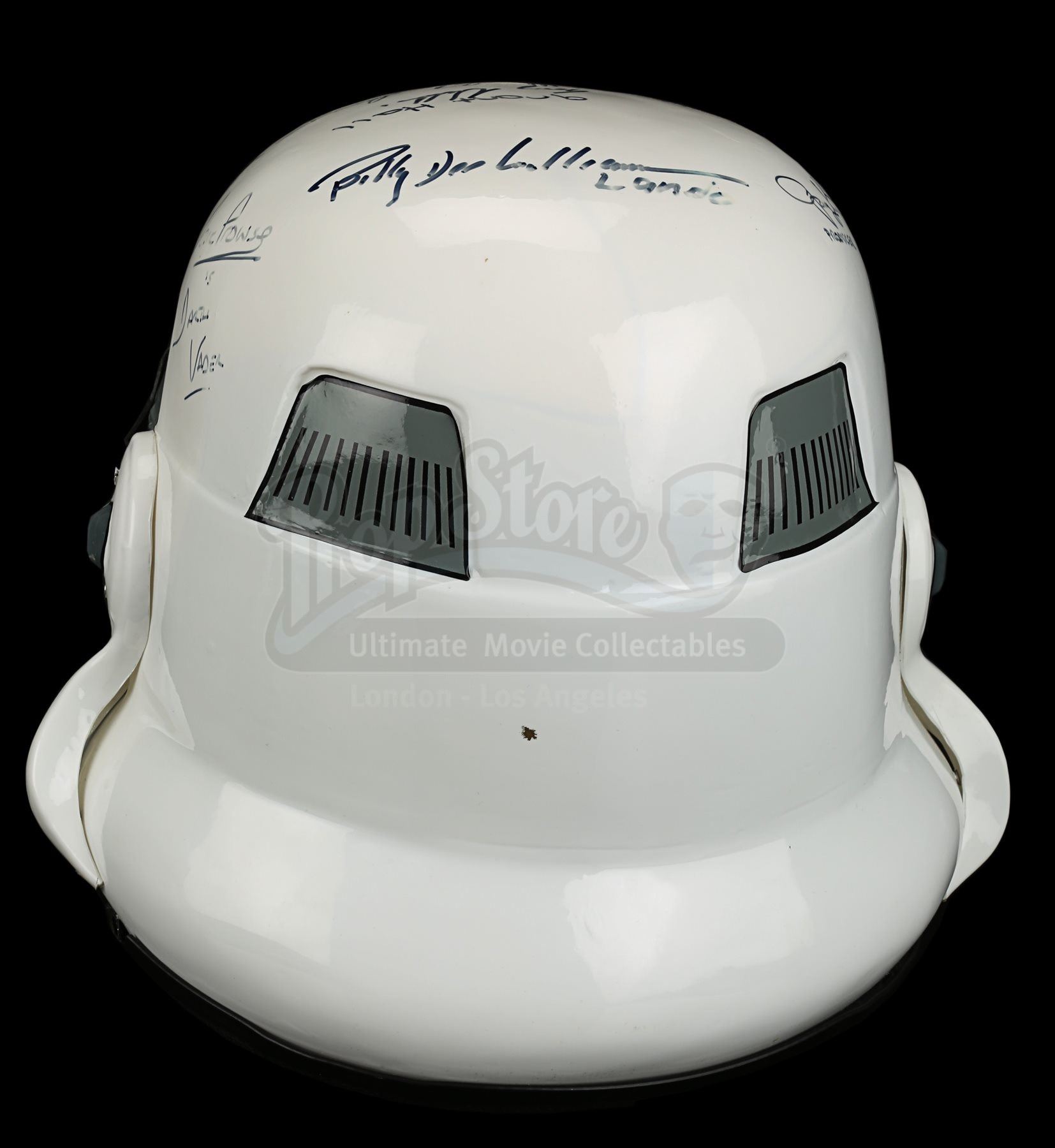 An autographed replica stormtrooper helmet from the original Star Wars trilogy. Made of white vacuum-formed plastic, the helmet displays a black rubber trim along the brow and neck, green acrylic lenses installed in the eye holes and various decals, including blue tube stripes on the cheeks.