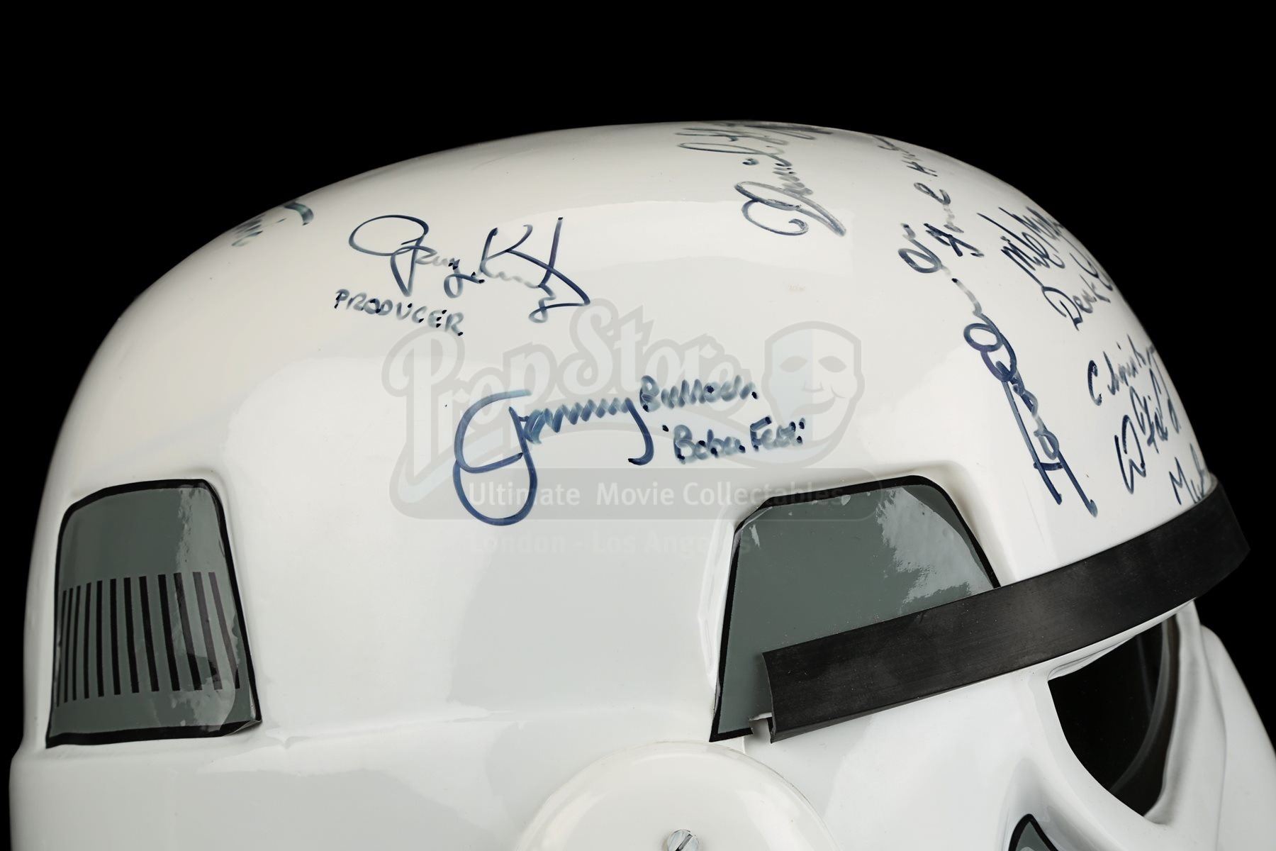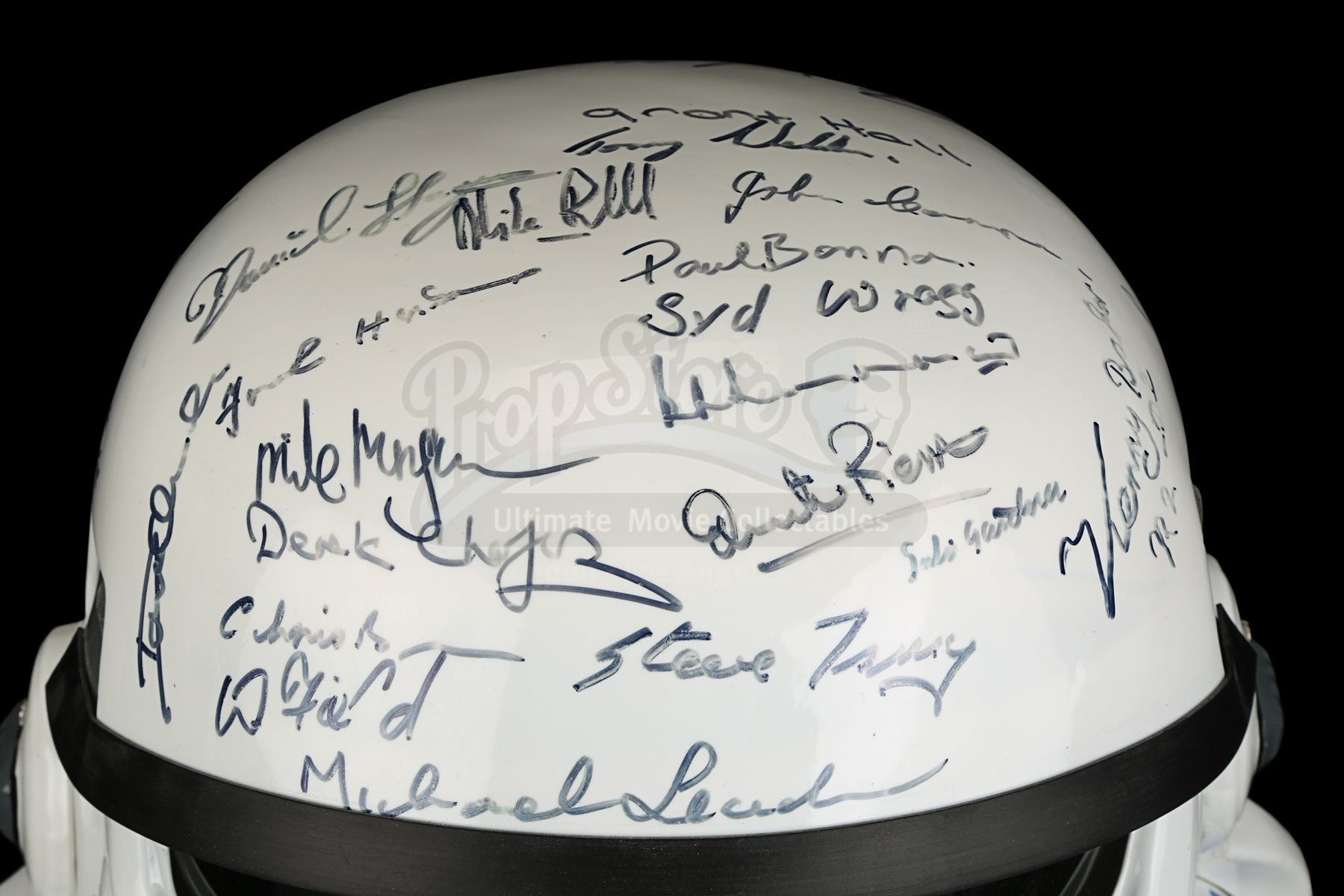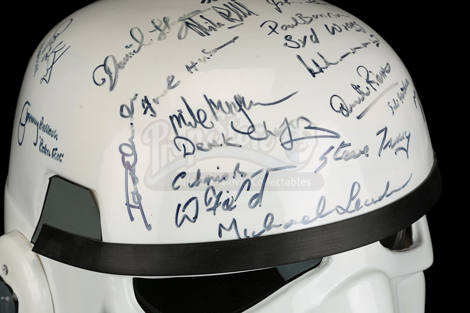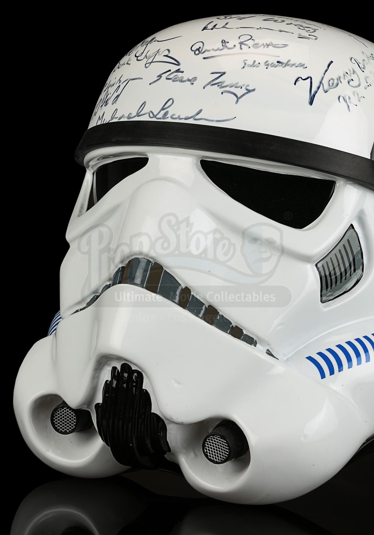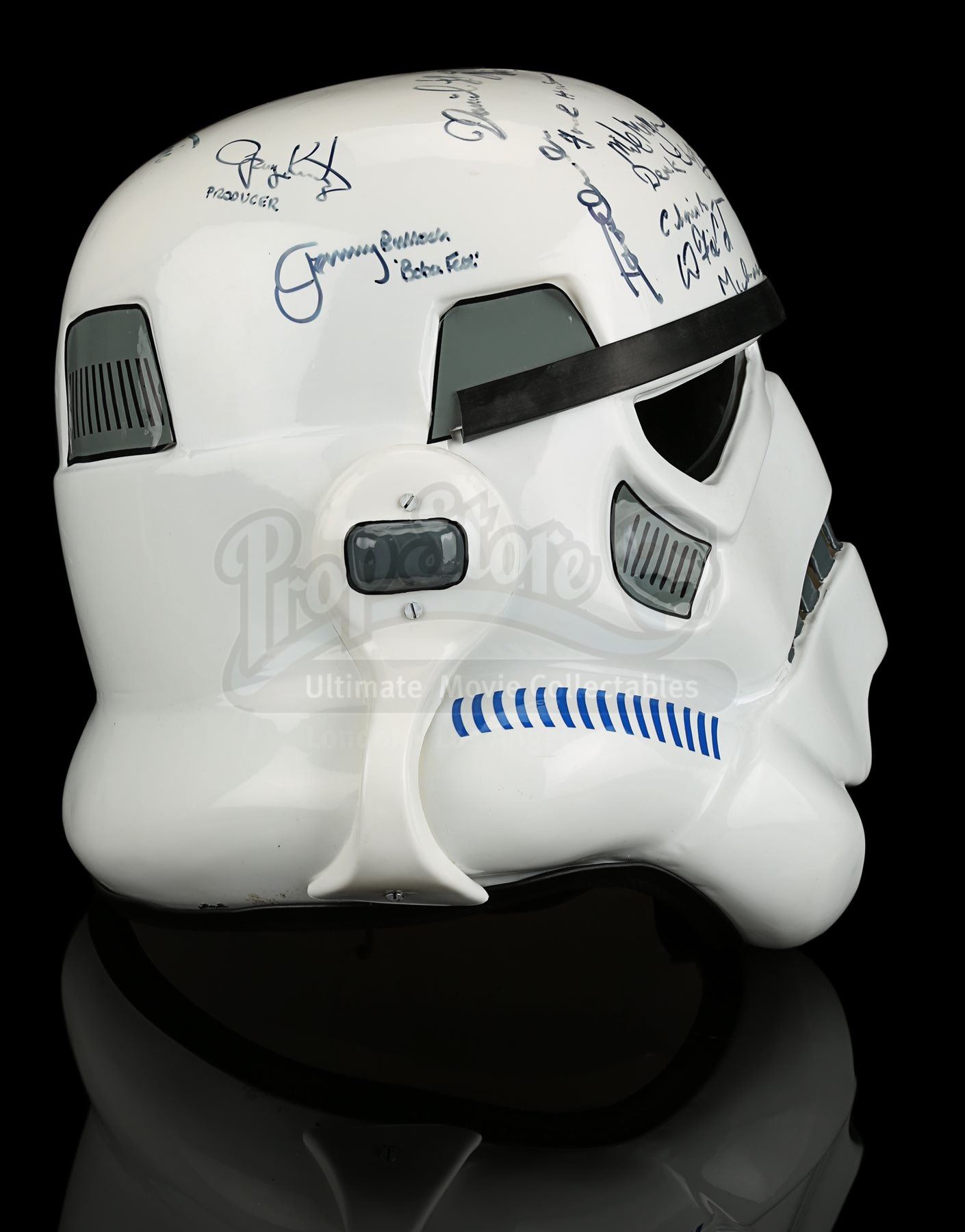 An autographed replica stormtrooper helmet from the original Star Wars trilogy. Made of white vacuum-formed plastic, the helmet displays a black rubber trim along the brow and neck, green acrylic lenses installed in the eye holes and various decals, including blue tube stripes on the cheeks.