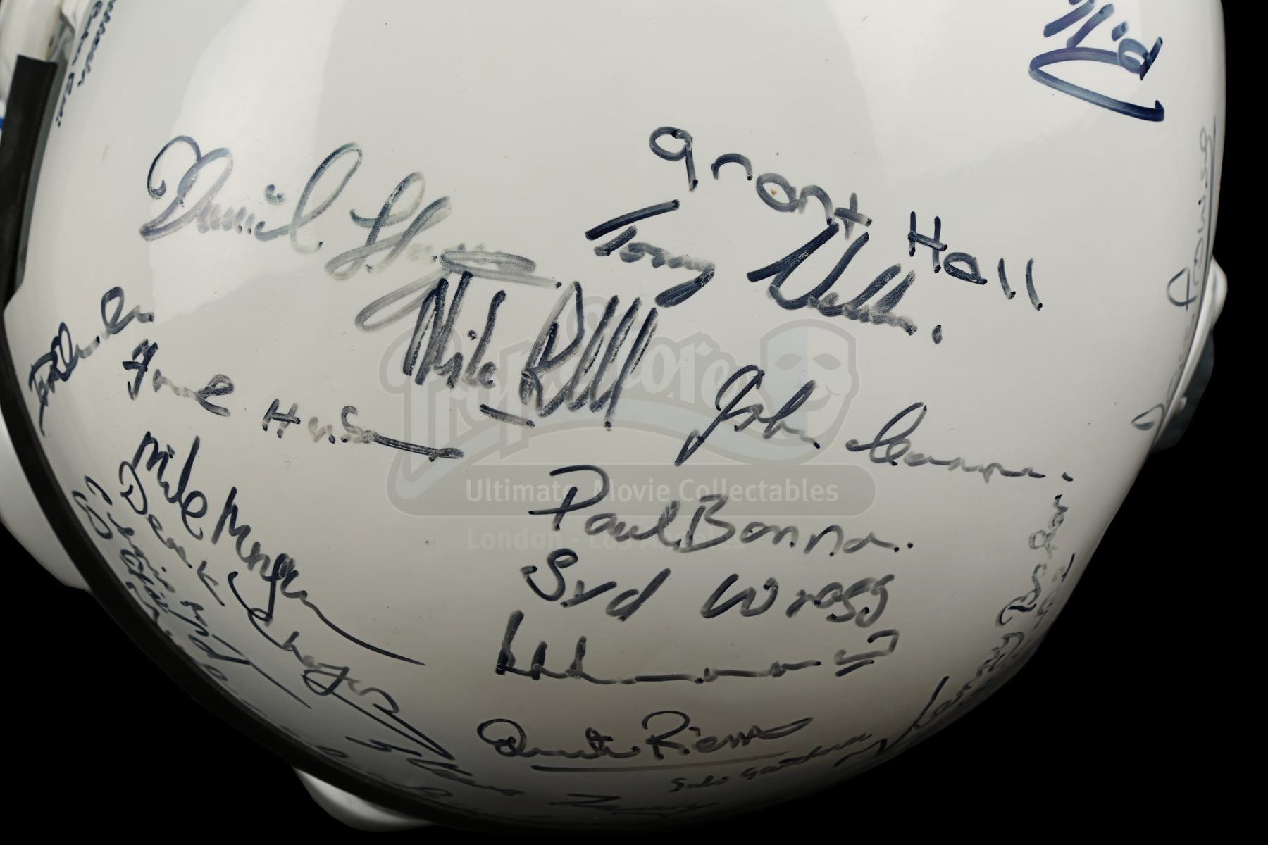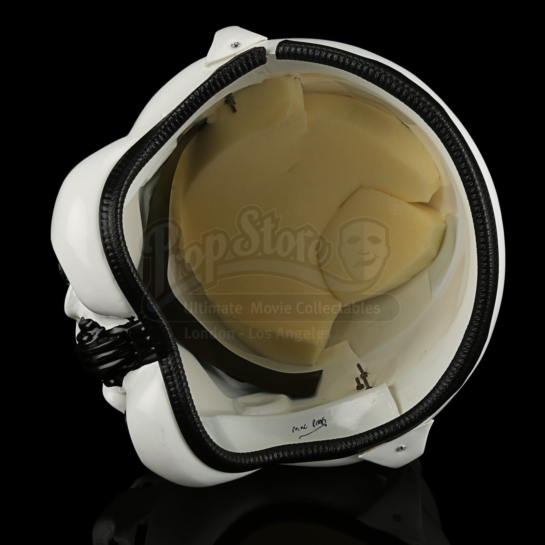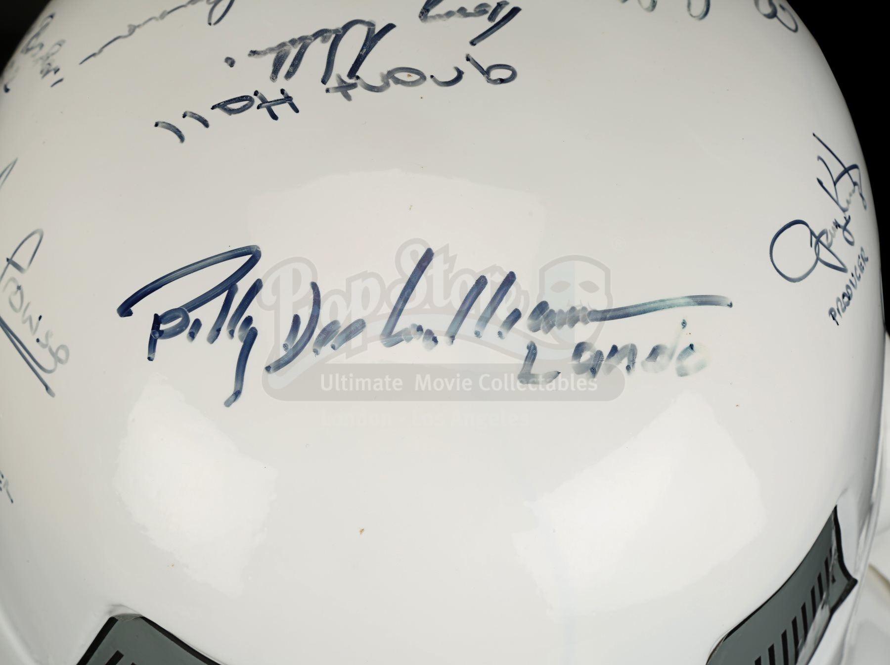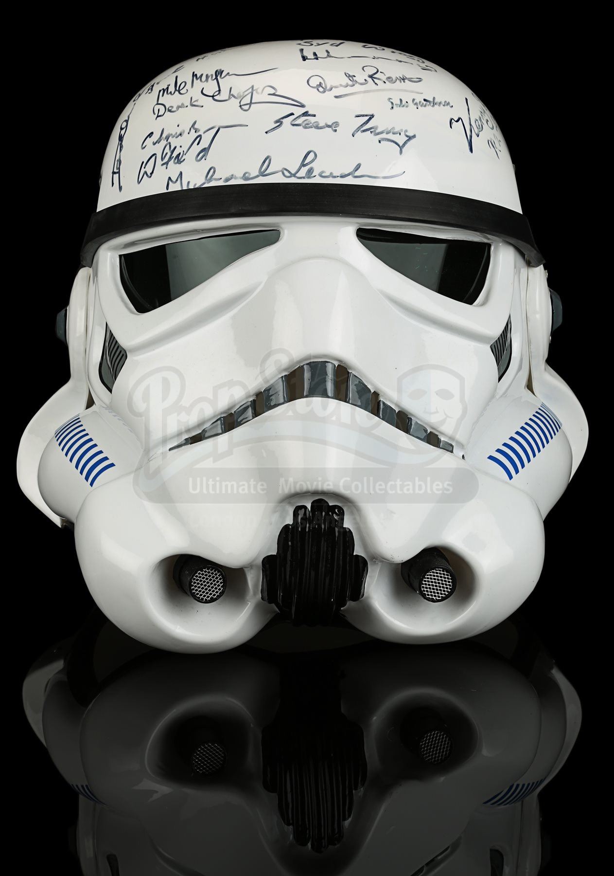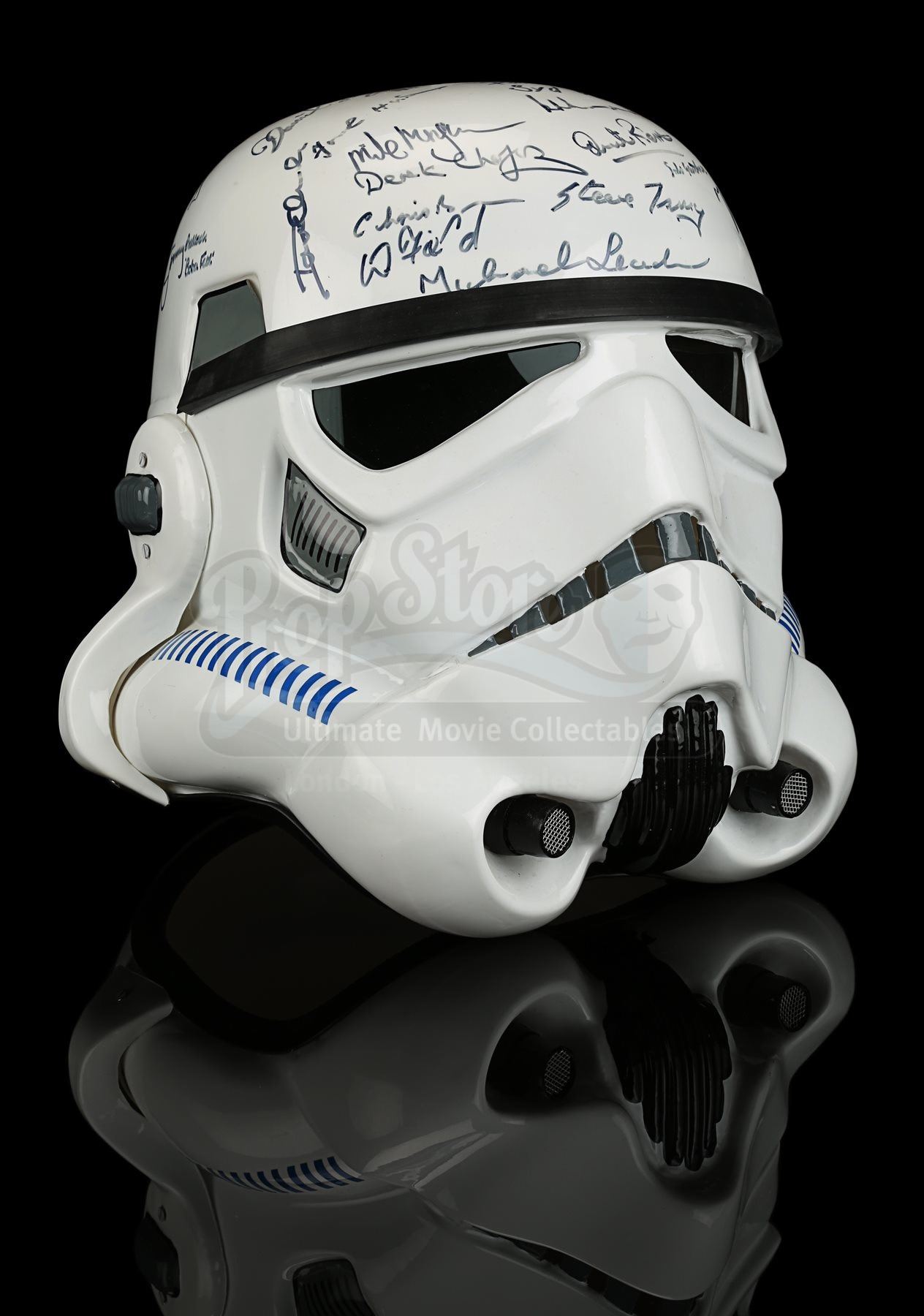 An autographed replica stormtrooper helmet from the original Star Wars trilogy. Made of white vacuum-formed plastic, the helmet displays a black rubber trim along the brow and neck, green acrylic lenses installed in the eye holes and various decals, including blue tube stripes on the cheeks.