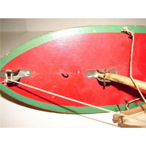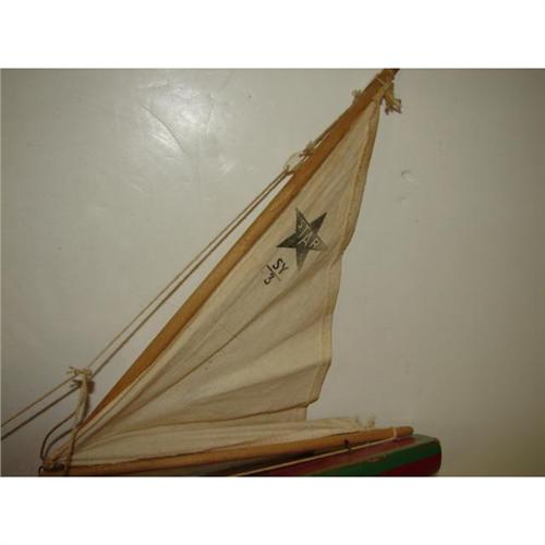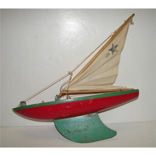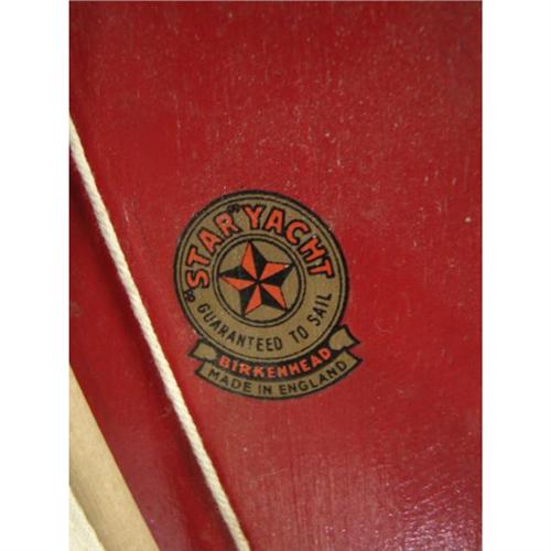STAR YACHT WOODEN POND BOAT. Birkenhead, England. Red and green painted boat with linen sail. Marked on top of boat. 14” L