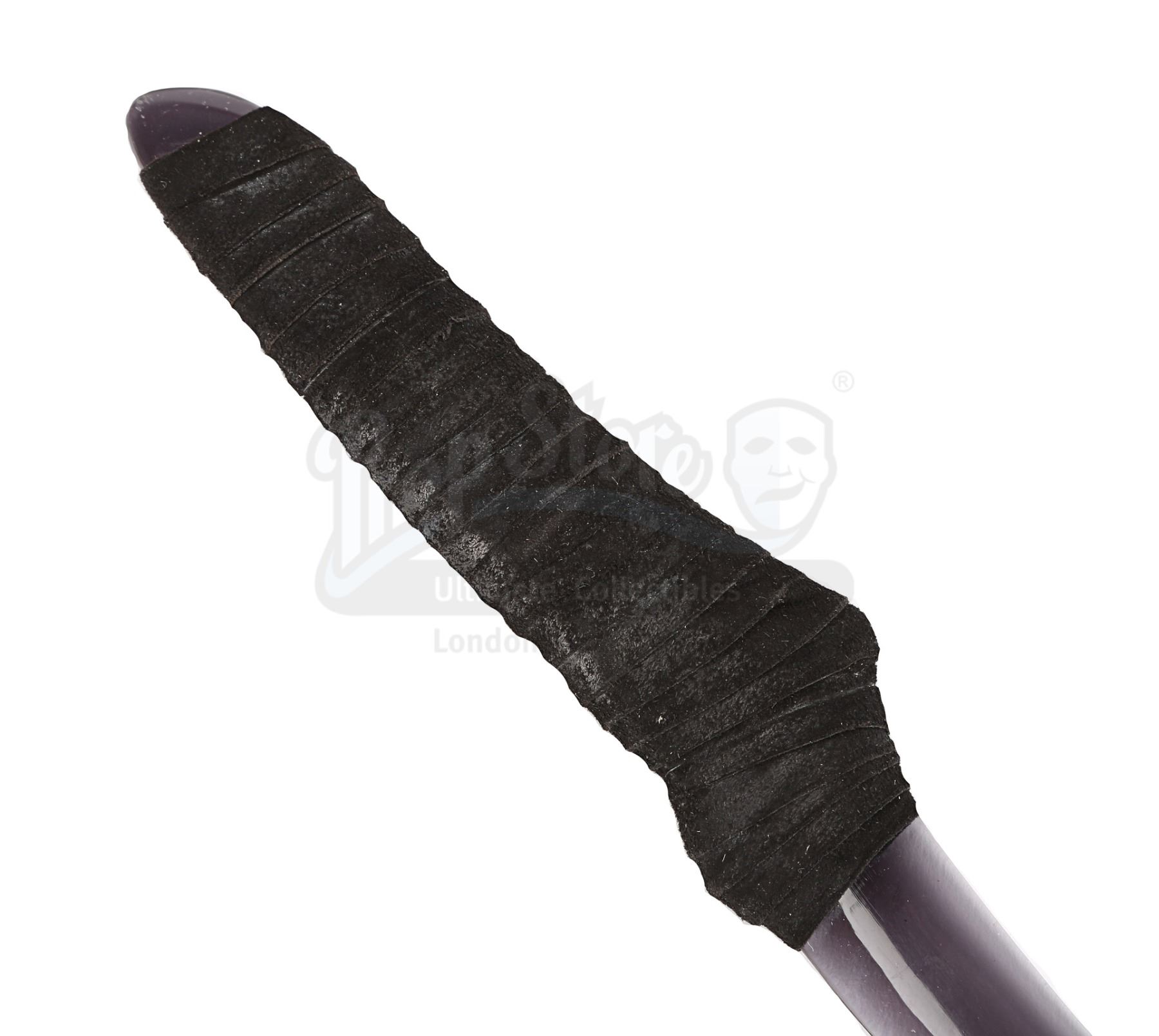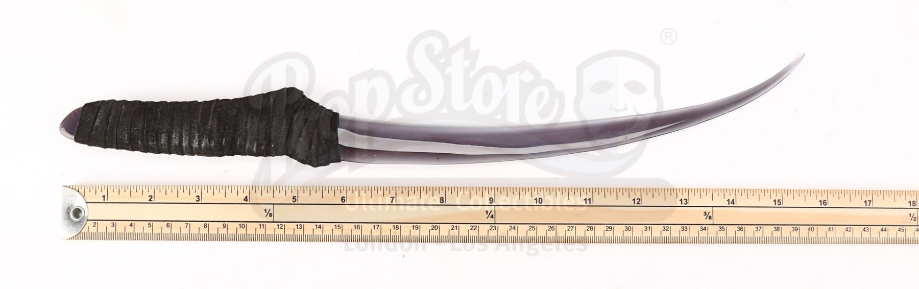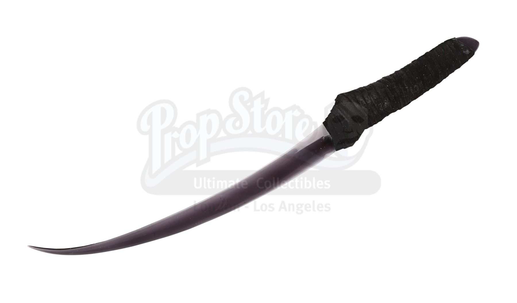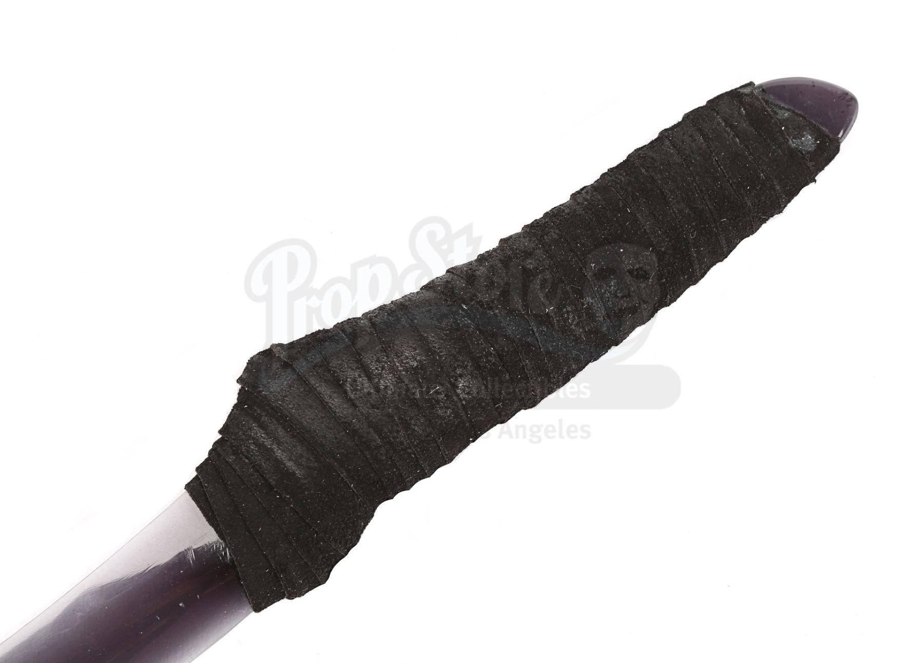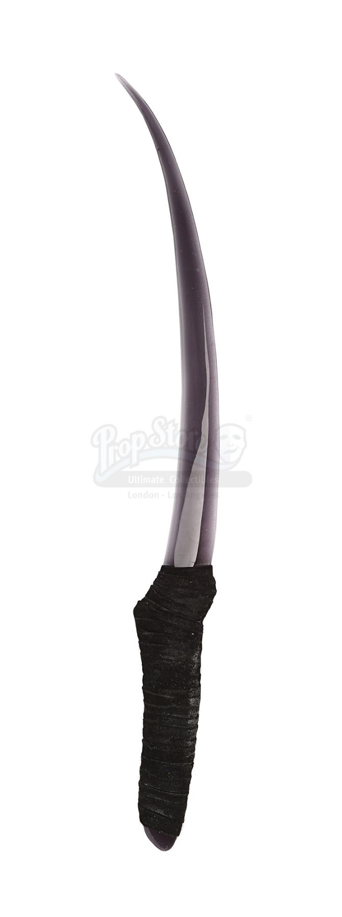 The dagger comprises a dark-tinted curved blade made of acrylic, with strands of black suede-like fabric wrapped around the bottom to create a padded handle. There are light scratches and scuff marks on the blade from use during production and the fabric on the handle exhibits minor wear. Dimensions: 40 cm x 5 cm x 2 cm (15 3/4" x 2" x 3/4")