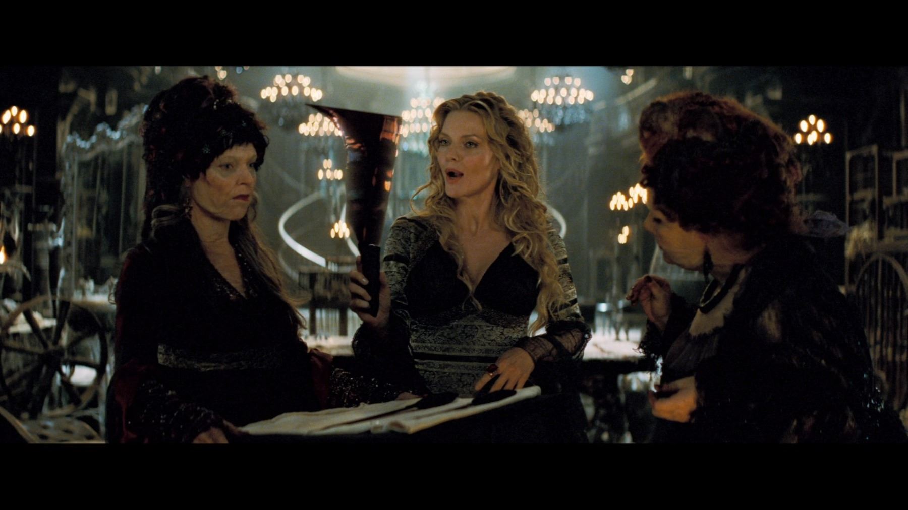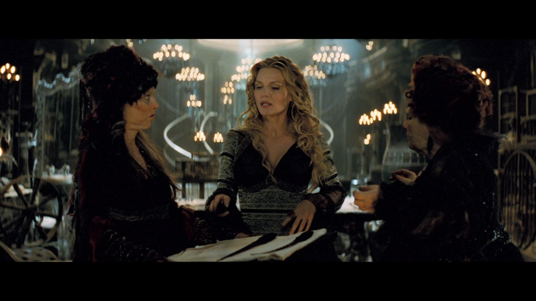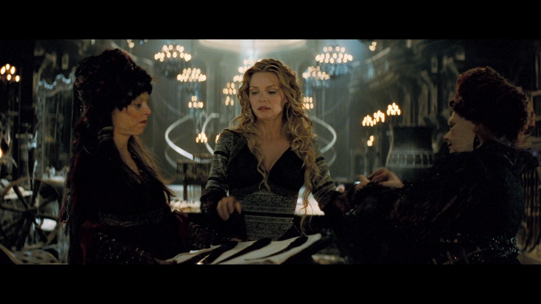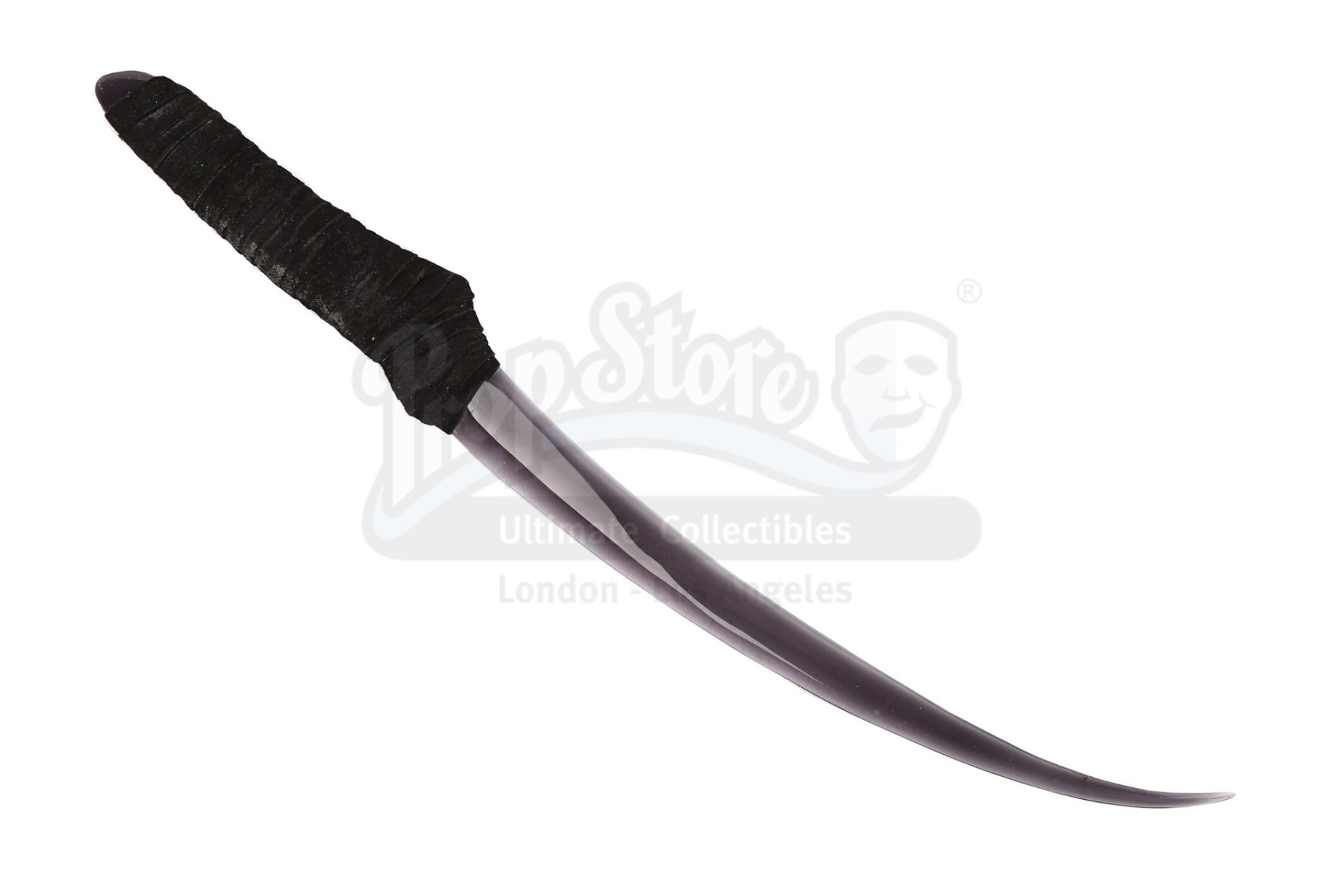 Lamia's (Michelle Pfeiffer) curved witches' dagger from Matthew Vaughn's fantasy adventure Stardust. A curved dagger was presented to the powerful witch by her sisters after she consumed the remains of a star's heart to regain her youth. The dagger was displayed on a pillow, alongside two other weapons.