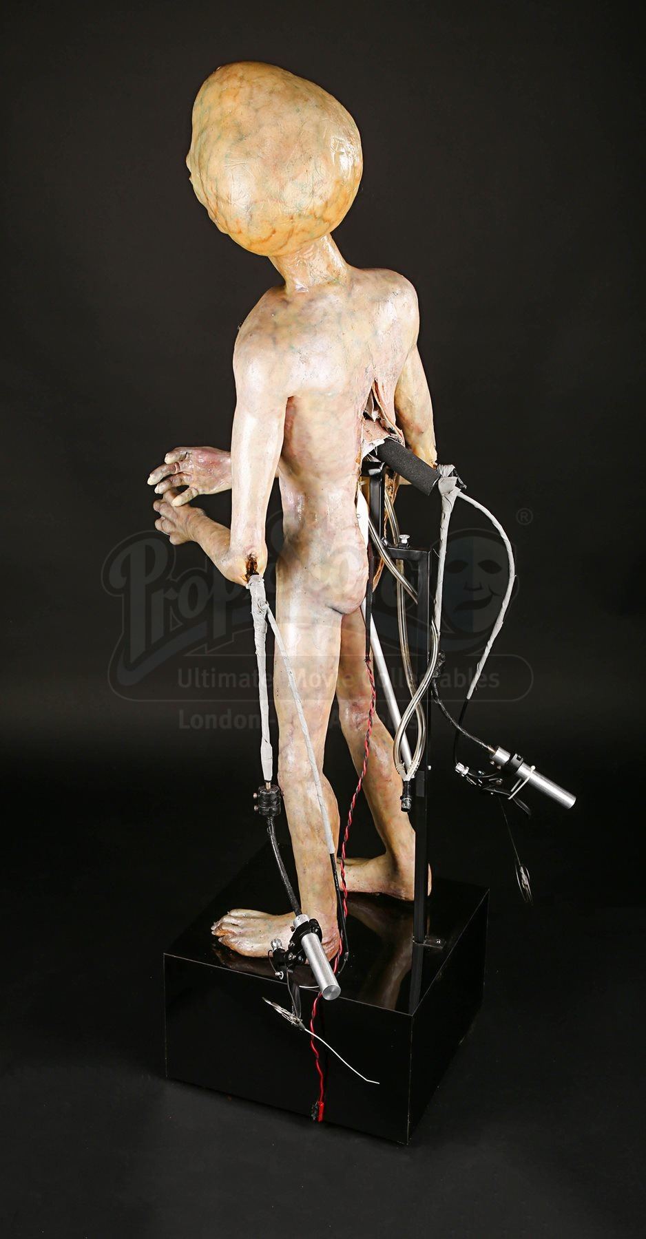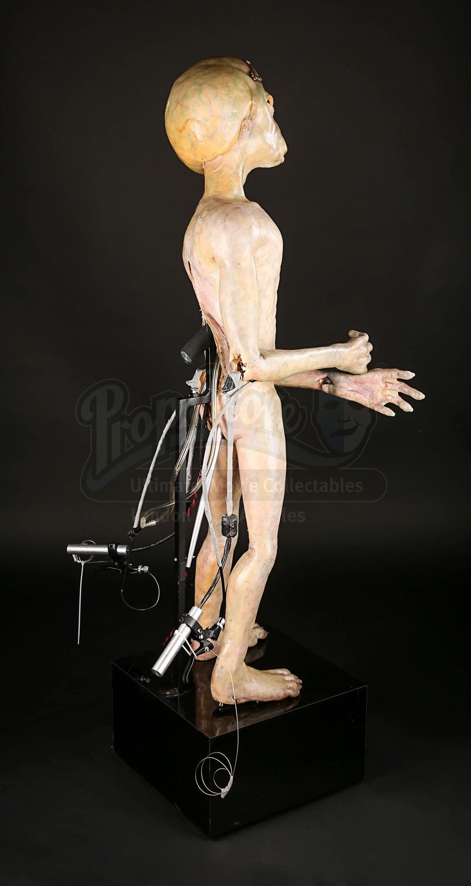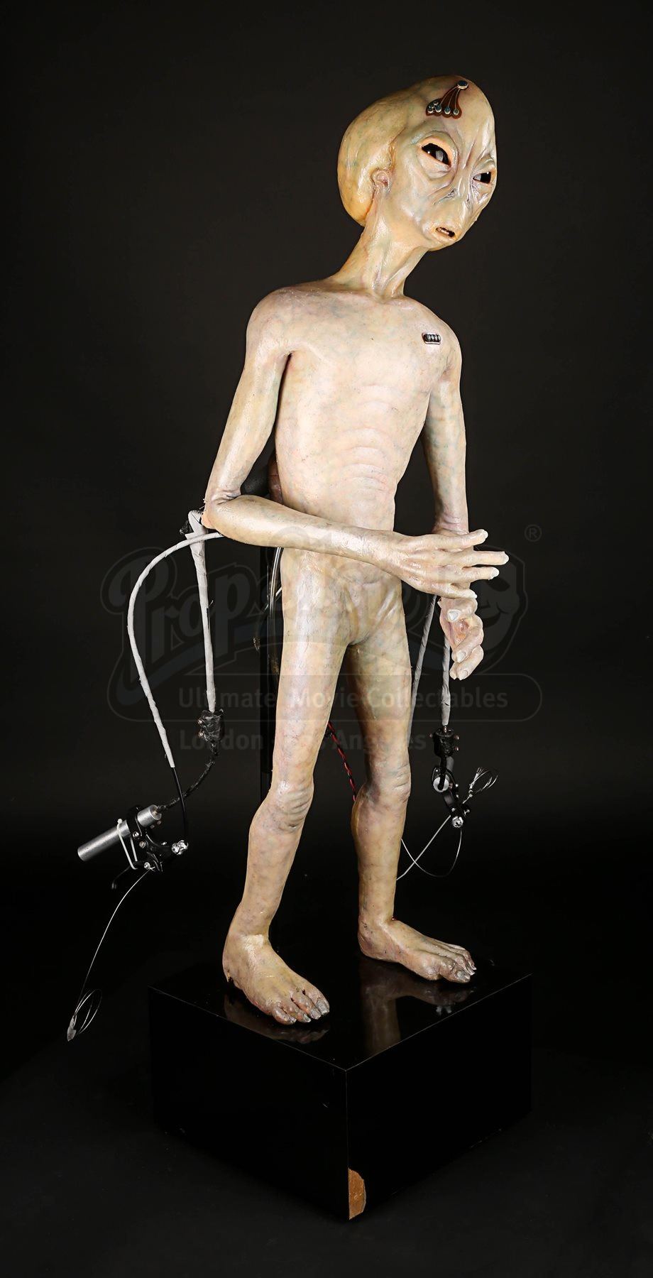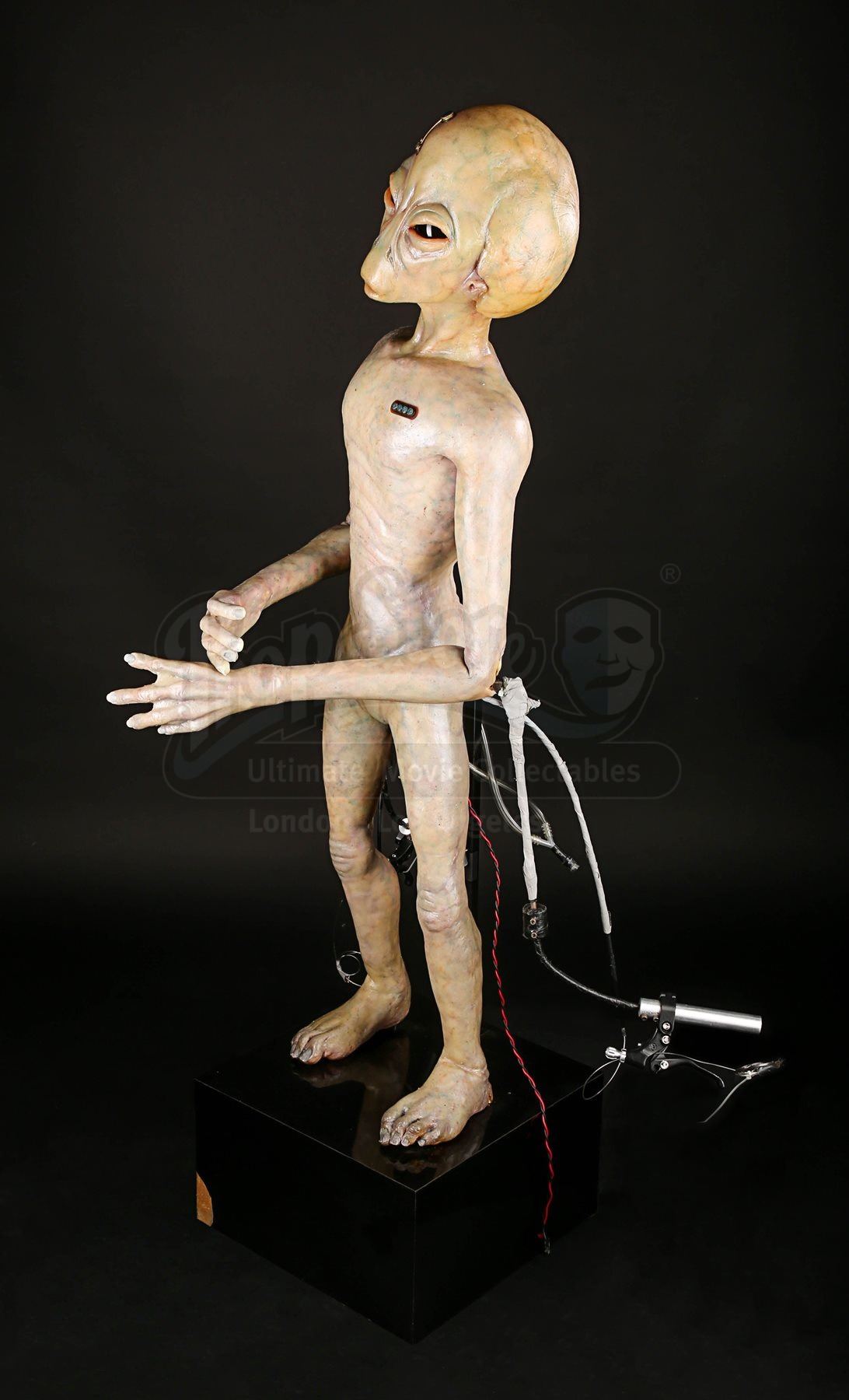 One of the puppet’s wrists does not function properly when the handle is pressed and the silicone displays very minor wear. The animatronic puppet comes displayed on a black base which shows minor scratches. The lot is accompanied by a studio certificate of authenticity. Dimensions: 46 cm x 60 cm x 138 cm (18 ¼” x 23 ¾” x 54 ½”)