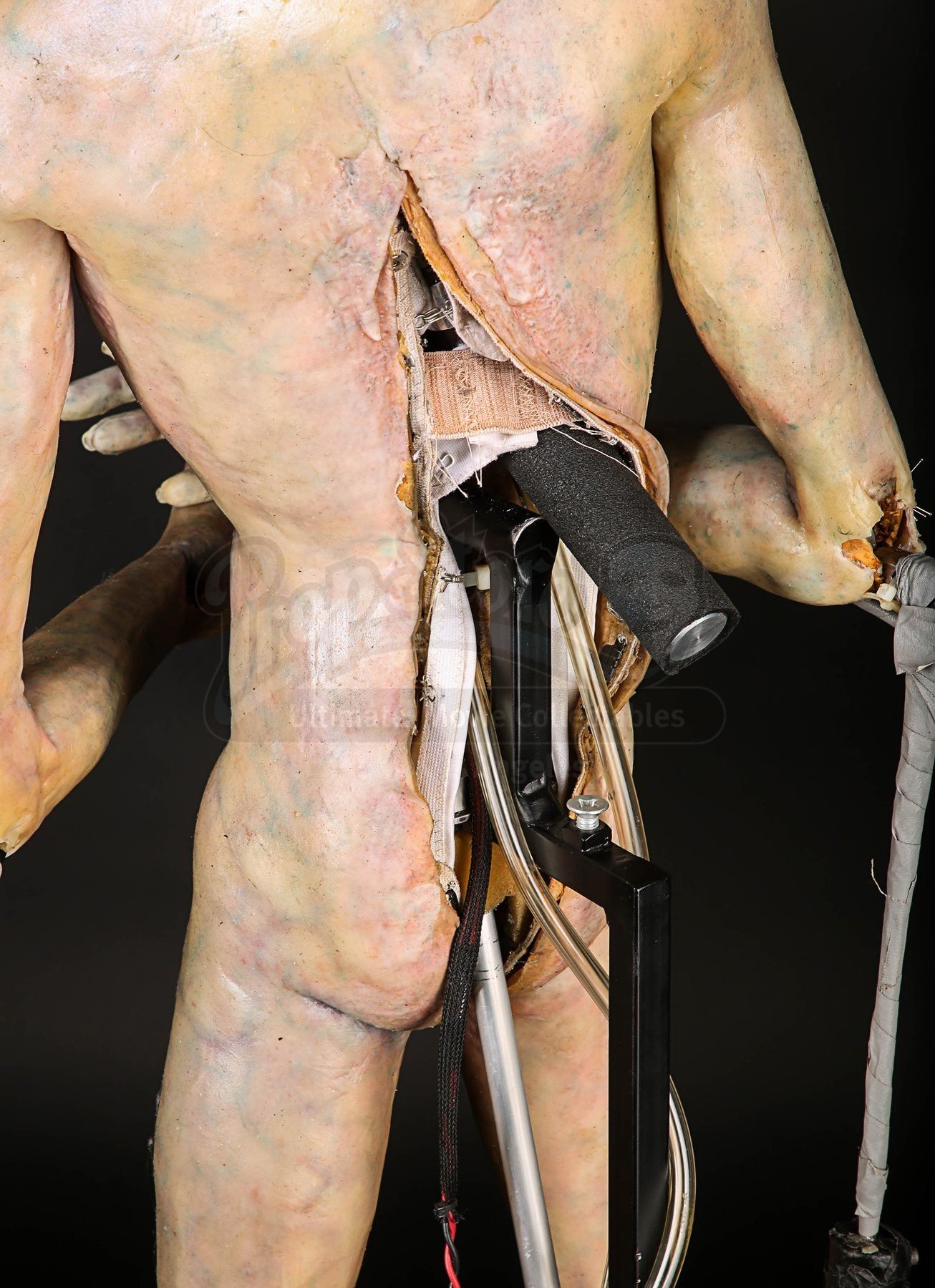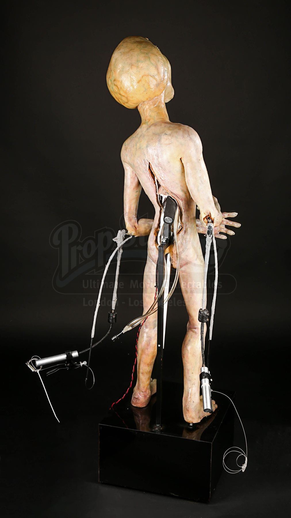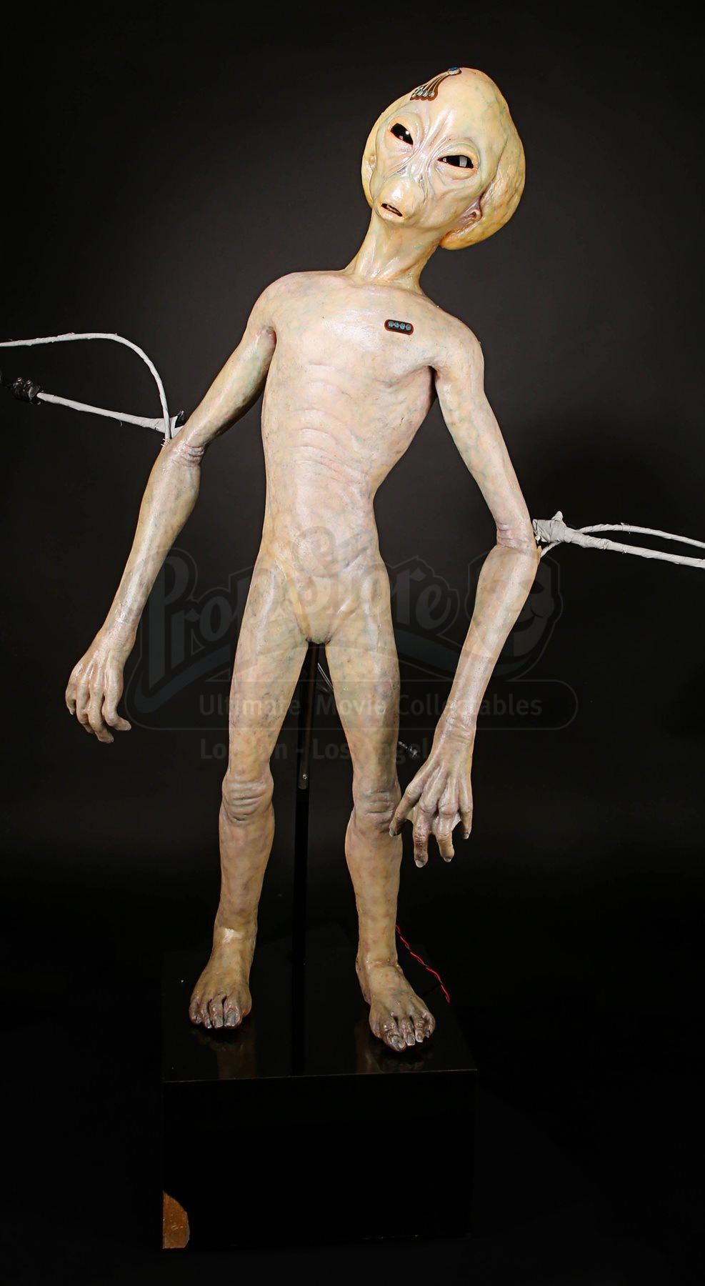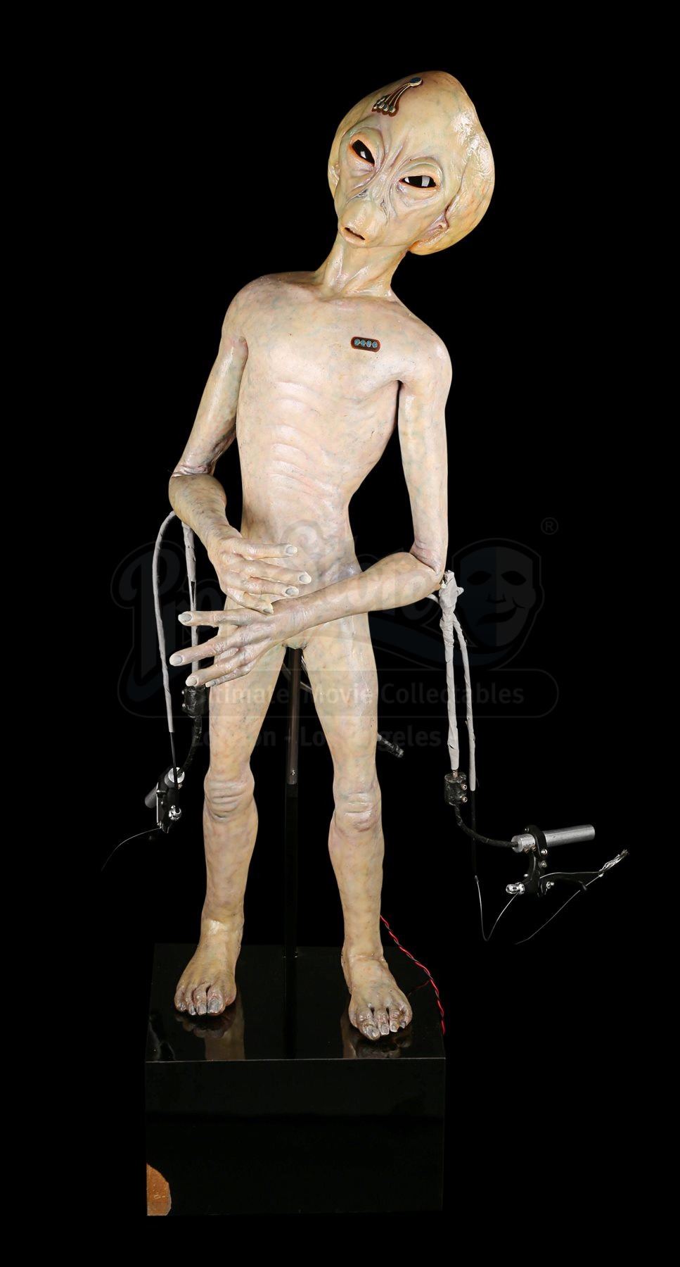 One of the puppet’s wrists does not function properly when the handle is pressed and the silicone displays very minor wear. The animatronic puppet comes displayed on a black base which shows minor scratches. The lot is accompanied by a studio certificate of authenticity. Dimensions: 46 cm x 60 cm x 138 cm (18 ¼” x 23 ¾” x 54 ½”)