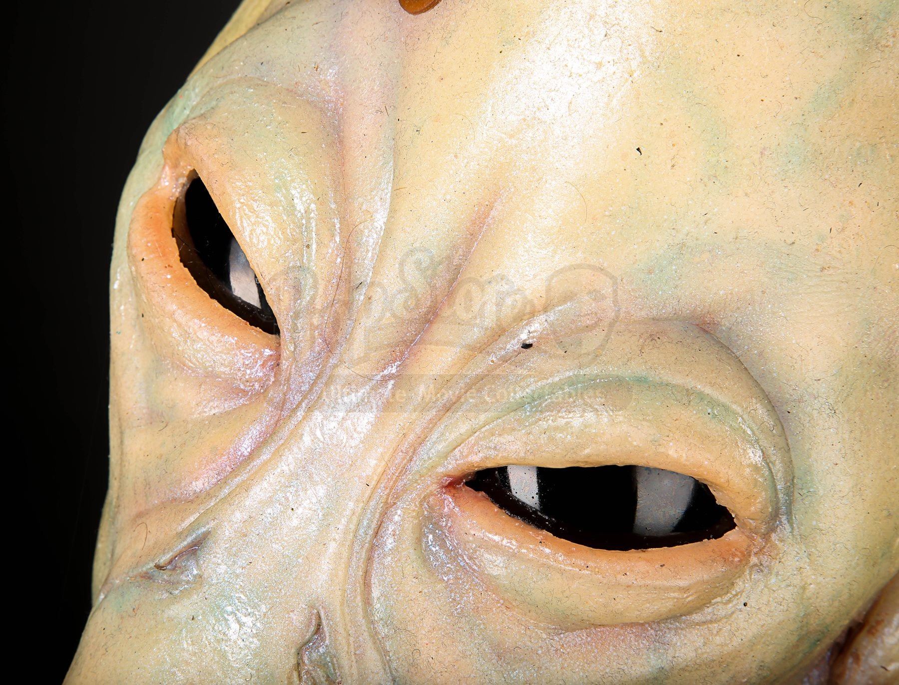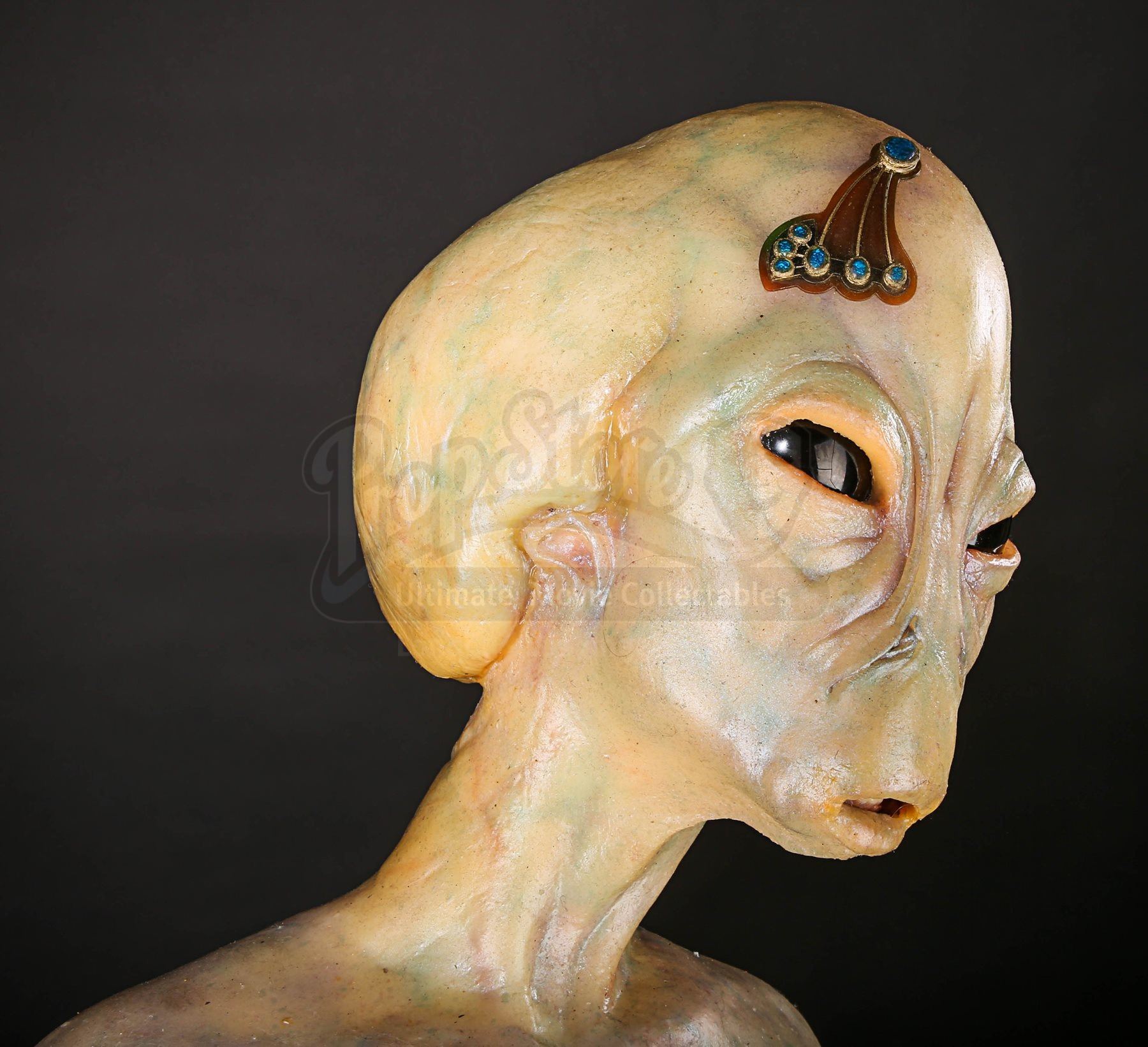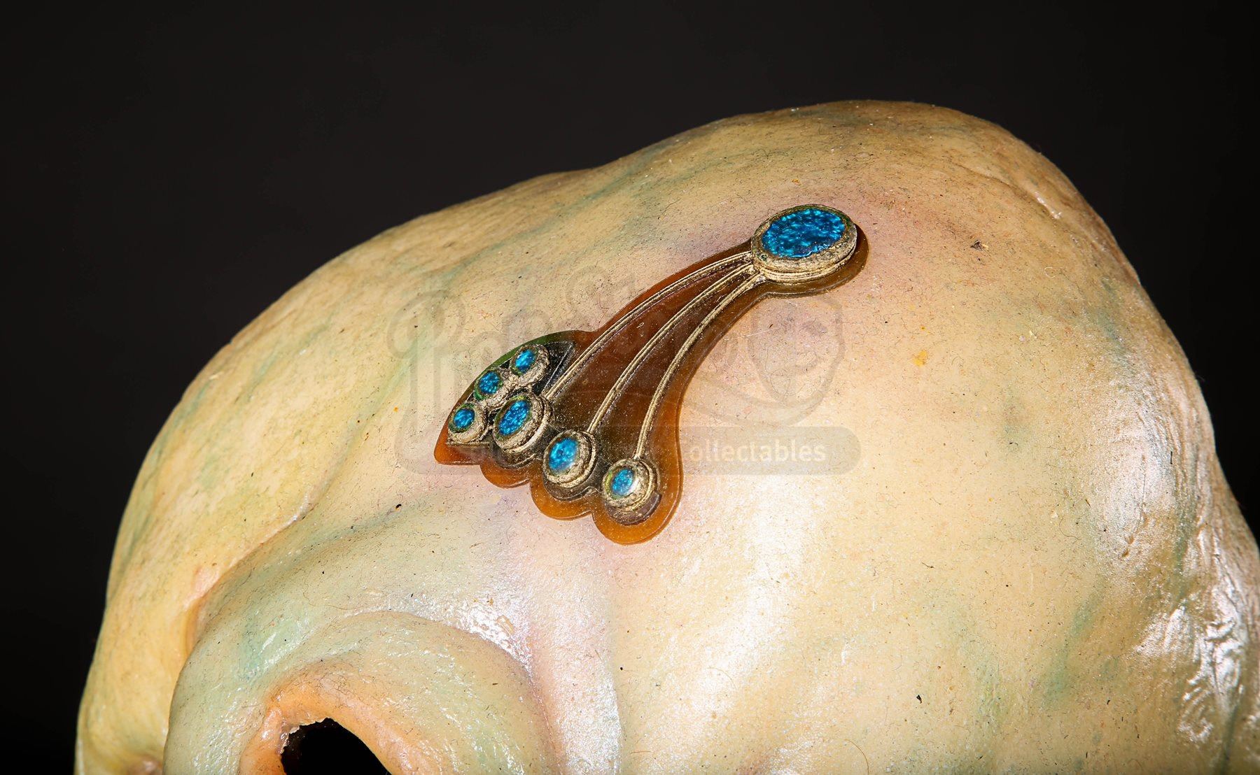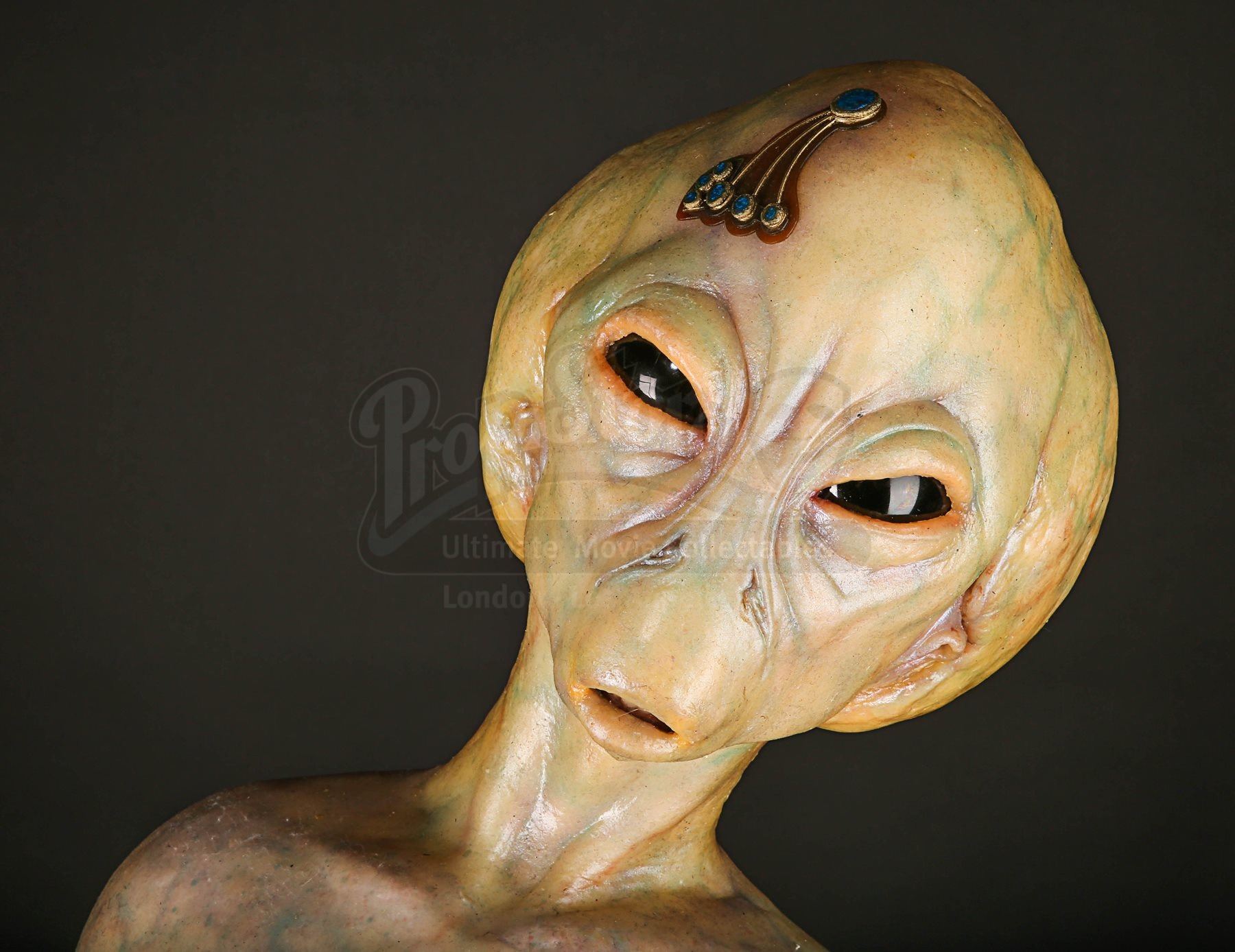 The piece has green / brown silicone skin, with shades of blue and red applied to create vein detailing and cast-in lines, highlighting the species’ skin texture. Two black plastic eyes, a set of visible plastic teeth and a faux-gold plated emblem with blue plastic jewels adorn the alien’s face.