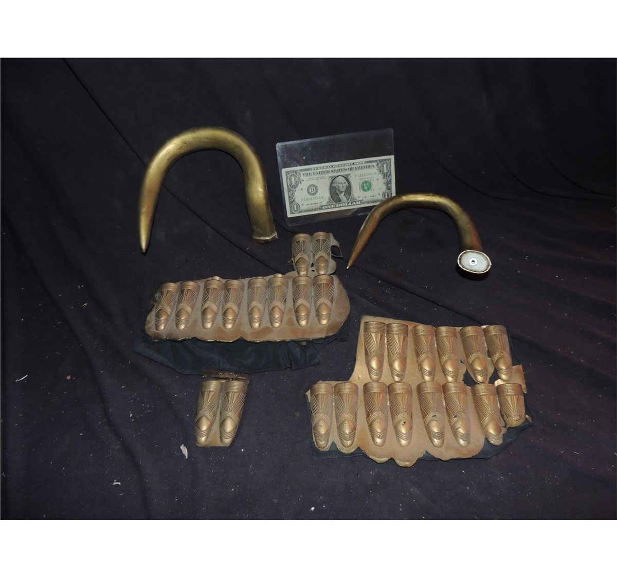 This is a lot of golden resin castings I think may be from Stargate? Lot includes a matched pair of horns that screw in to some skull cap, and a plethora of what look to be finger or costume adornments.