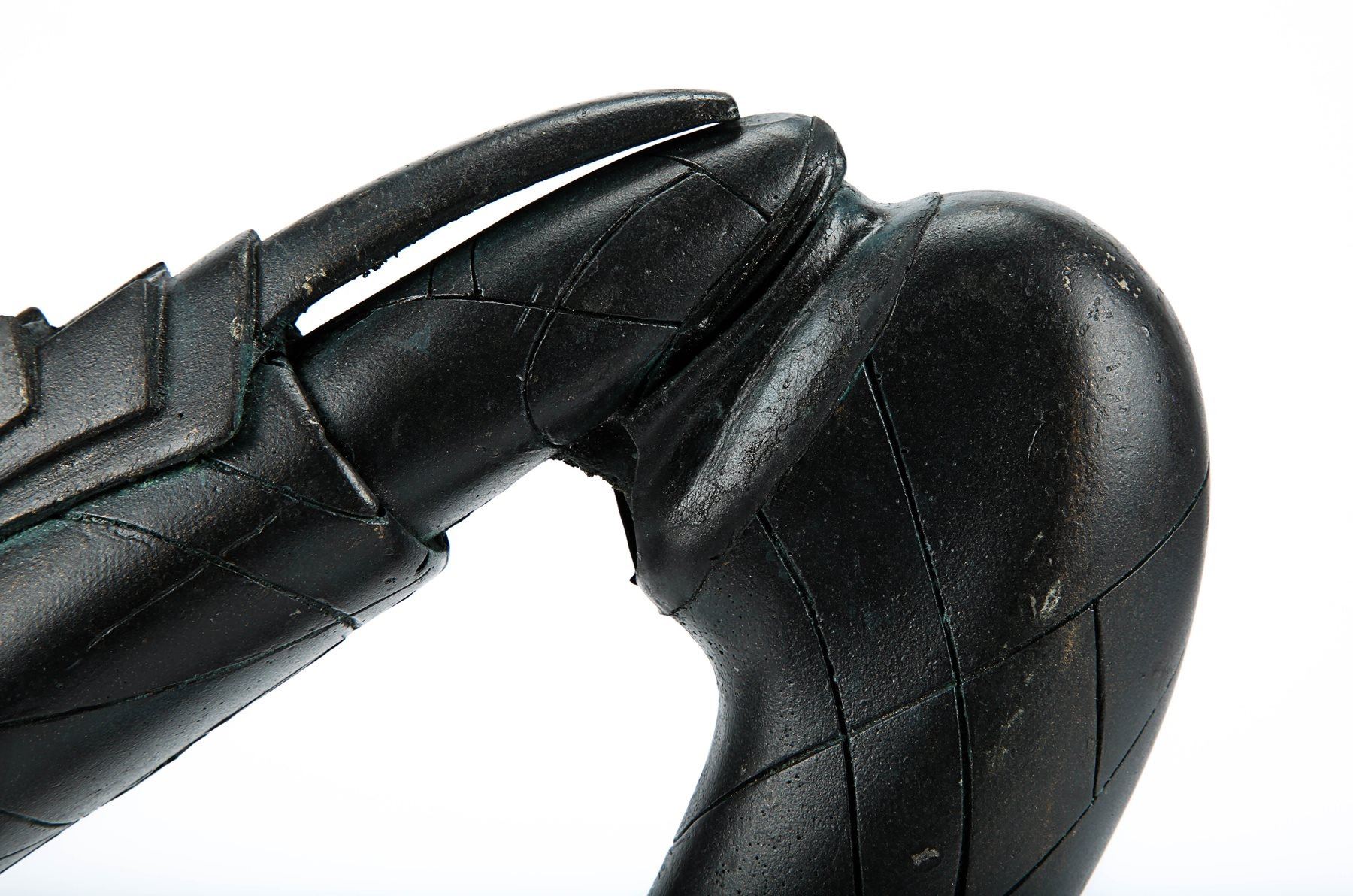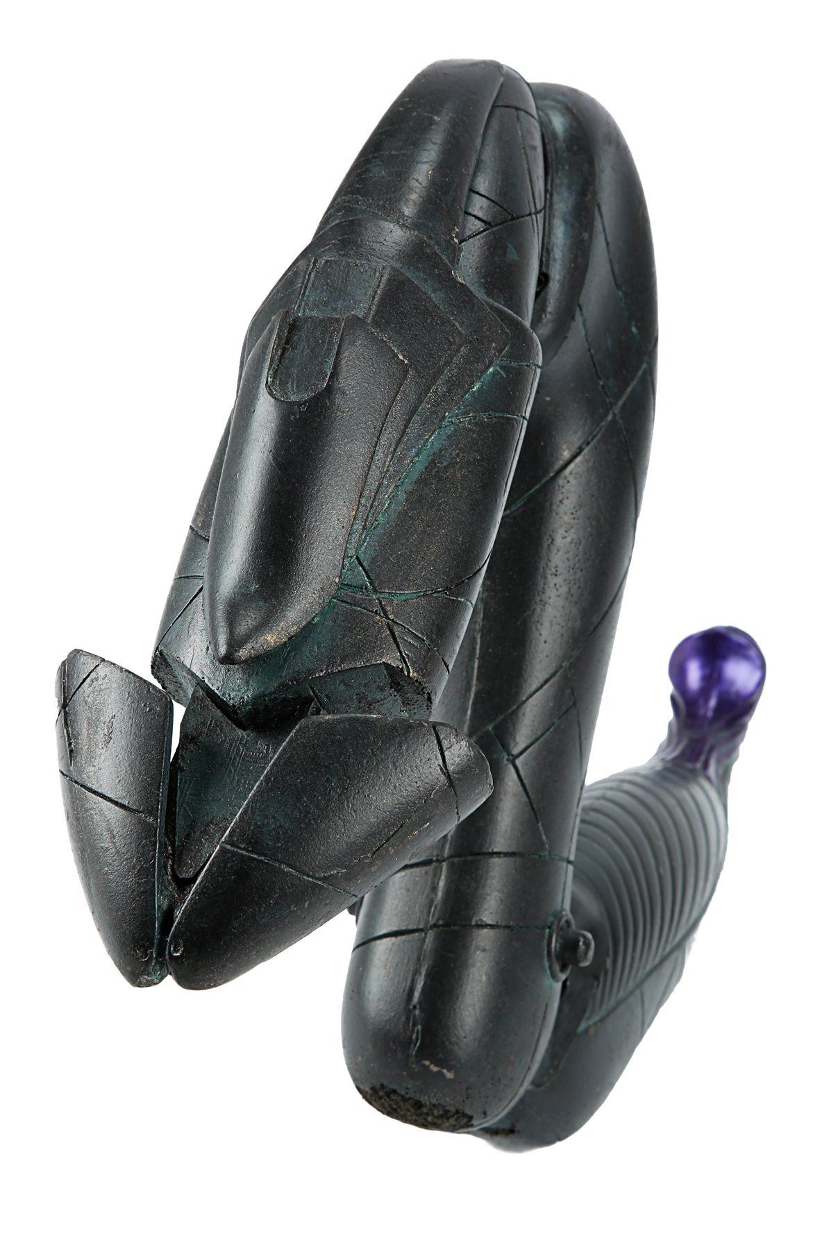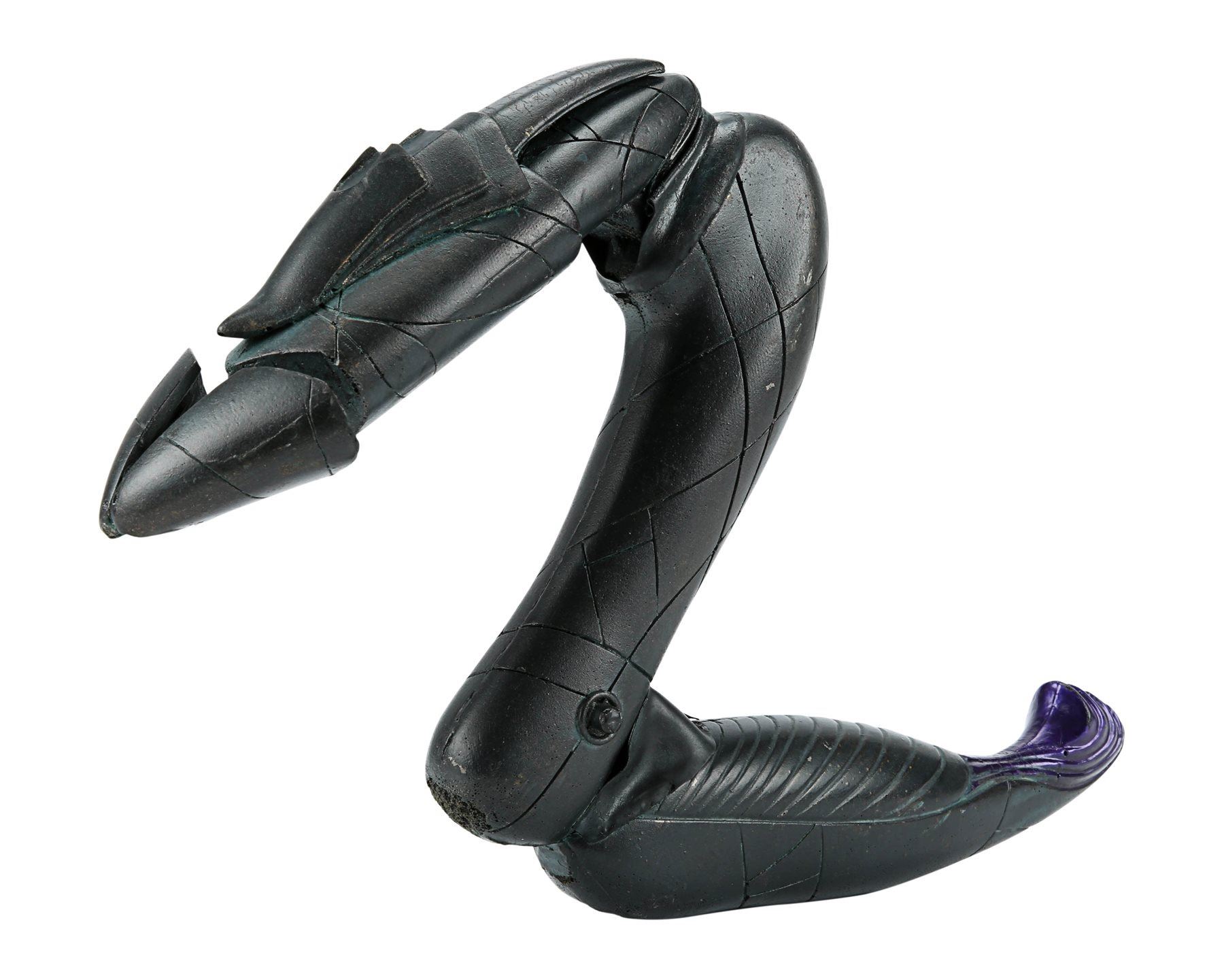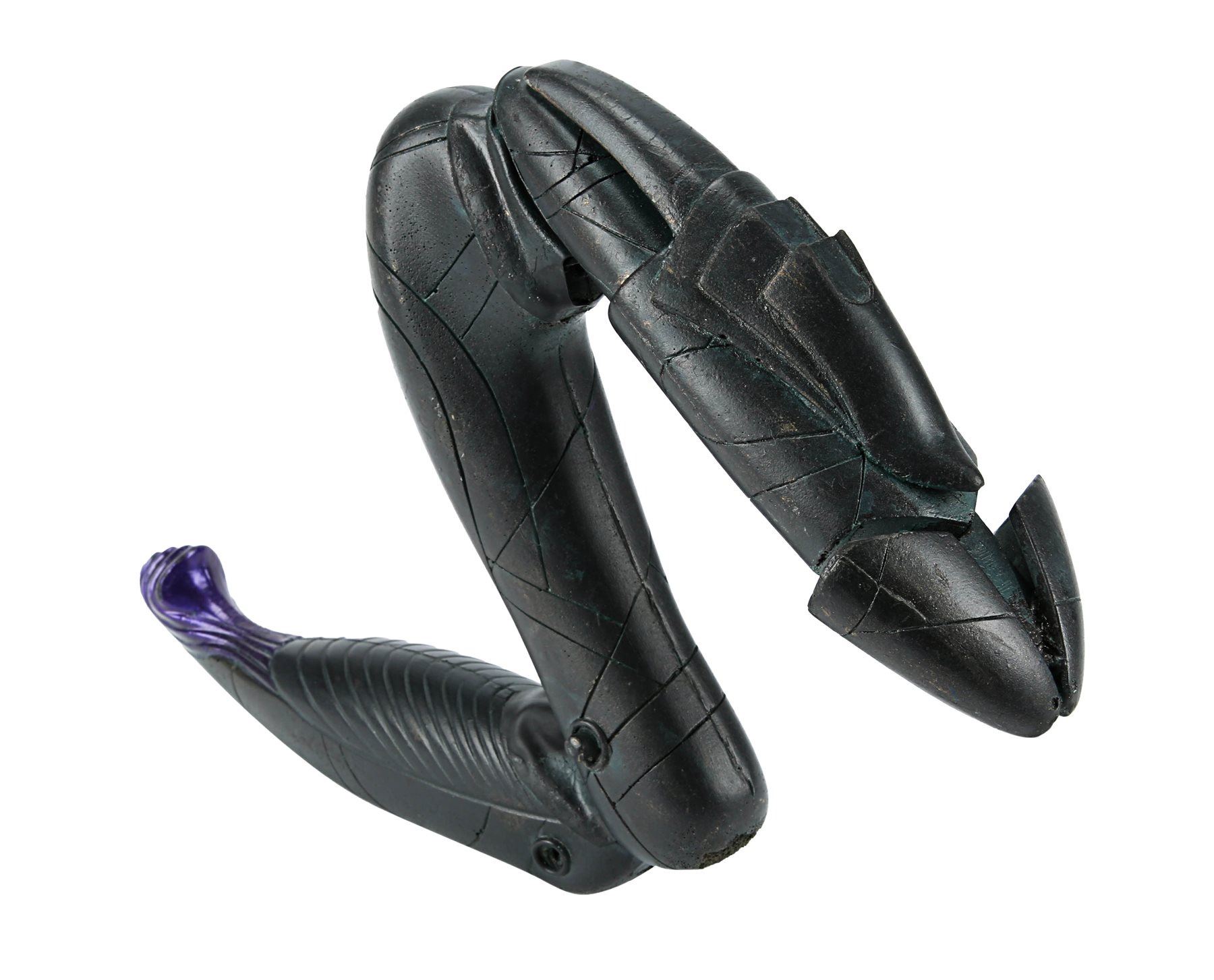 Made of dense rubber, the weapon is shaped like a serpent and comes fixed in an open state. The gun has been finished in black with green accents and the lower end of the piece is finished in purple. Cast-in line detailing features all over and pieces of thin black rubber have been applied to cover hinges. The Zat gun shows wear to the paintwork and damage to one side, exposing the core of the piece. This lot is accompanied by a studio certificate of authenticity. Dimensions: 28 cm x 8 cm x 18 cm (11” x 3 ¼” x 7 ¼”)
